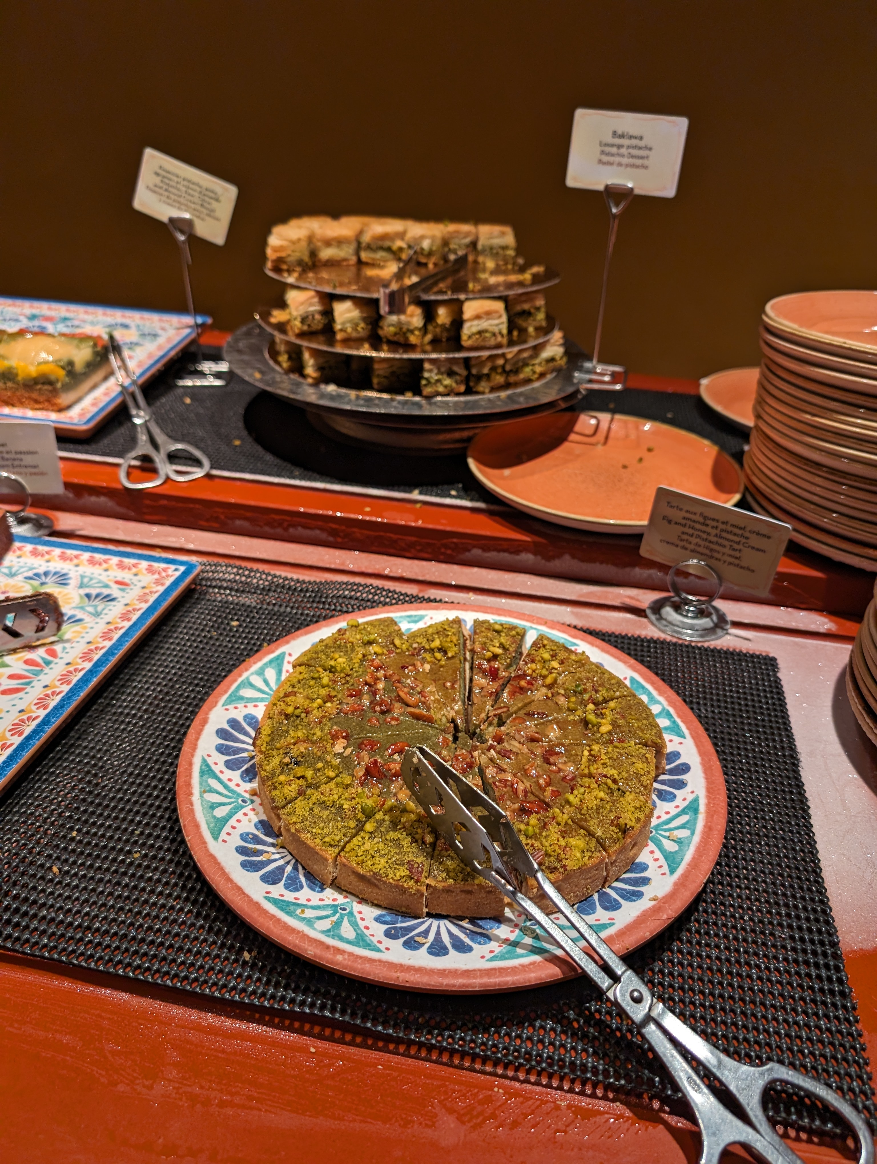 C'est la première fois que nous venons déjeuner dans ce restaurant et cela faisait longtemps que nous voulions y aller ! Nous n'avons pas été déçus , nous sommes végétariens et nous avons eu vraiment de quoi nous restaurer ! Les entrées sont de bonnes qualités et largement variées , le couscous avec légumes un peu moins intéressant . Les desserts orientaux sont vraiment très bons , tout particulièrement les gâteaux libanais , beaucoup de variétés , il y a vraiment le choix ! Pas mal pour un buffet chez Disney Très jolie décor aussi .