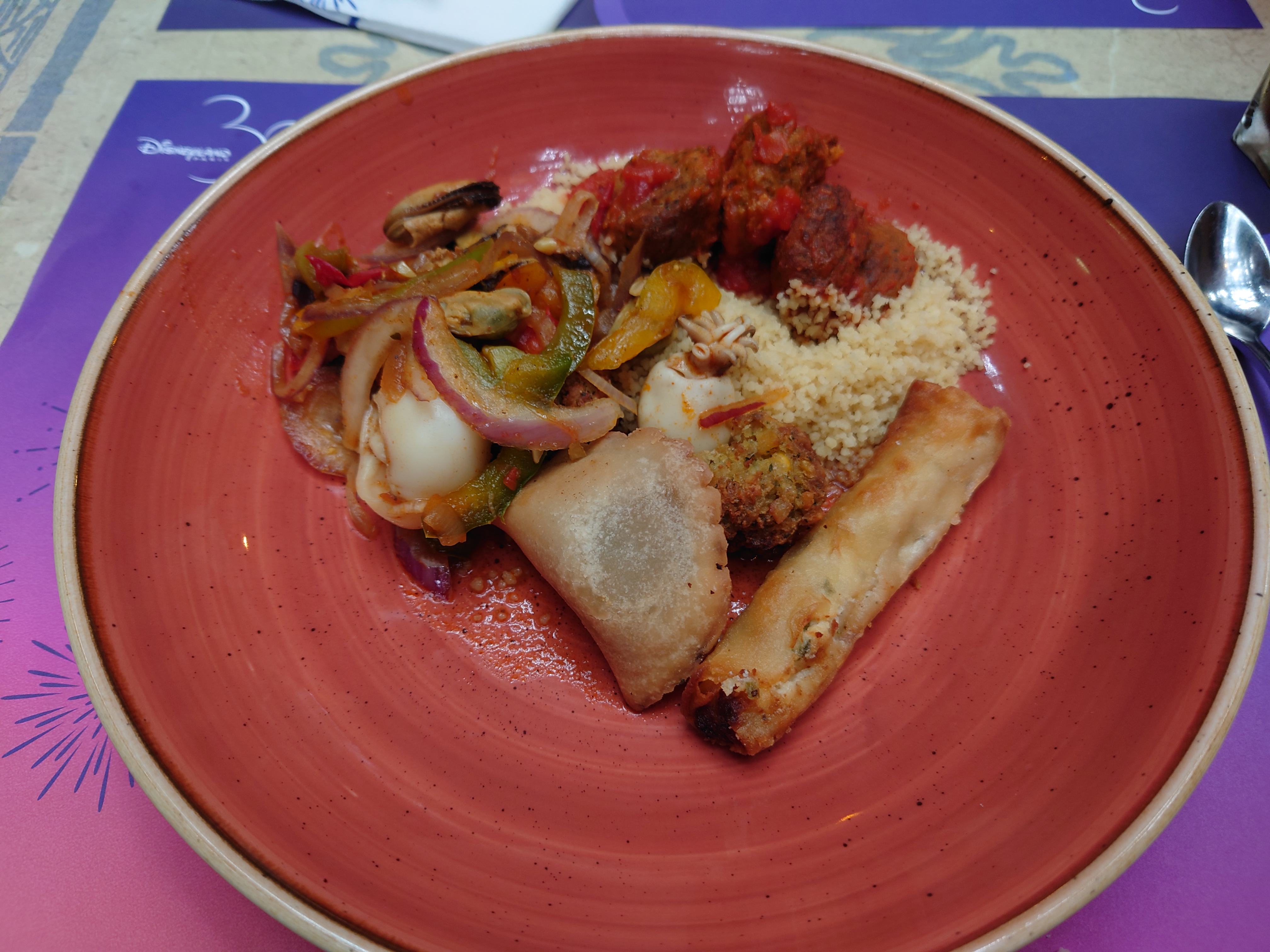 Un délice de couscous, vraiment l'un des meilleurs buffets de Disney et un des meilleurs restaurants du parc. Certe il faut s'octroyer au moins une heure de repos entre les attractions mais ce restaurant vaut le détour. Le tout dans un décor vraiment magnifique. On est plongé aux pays des 1001 nuits pour un voyage des saveurs sur son tapis volant.