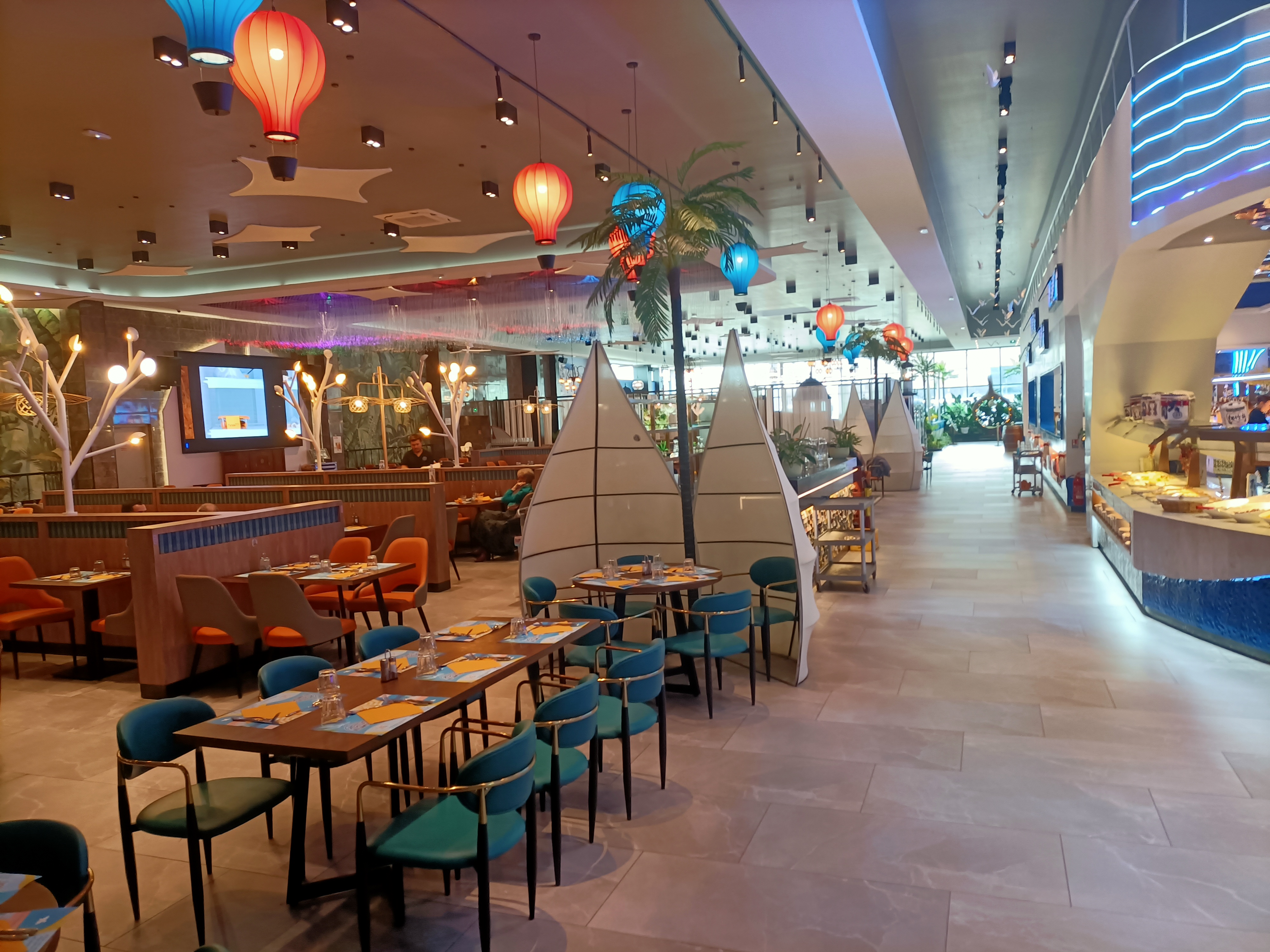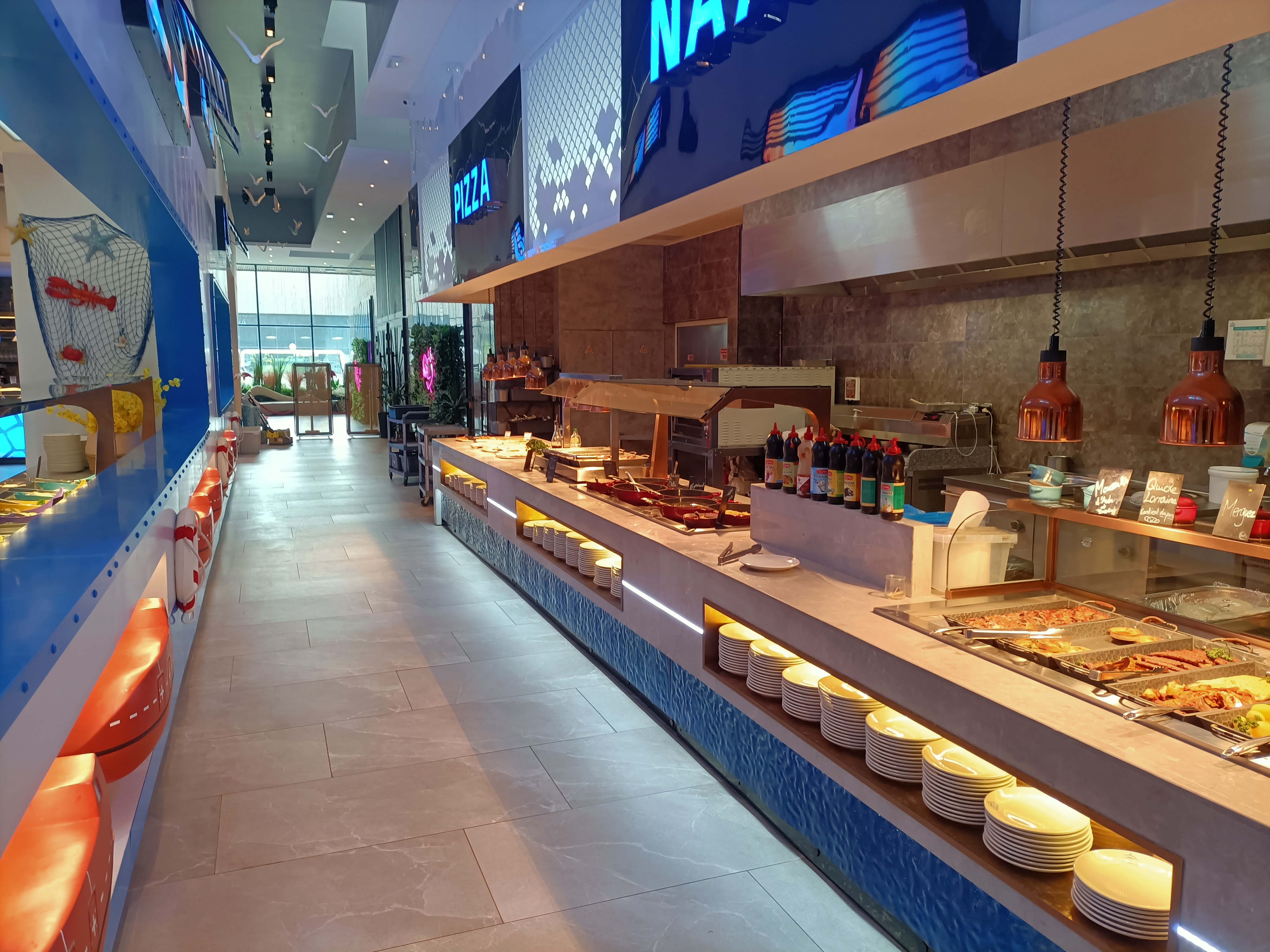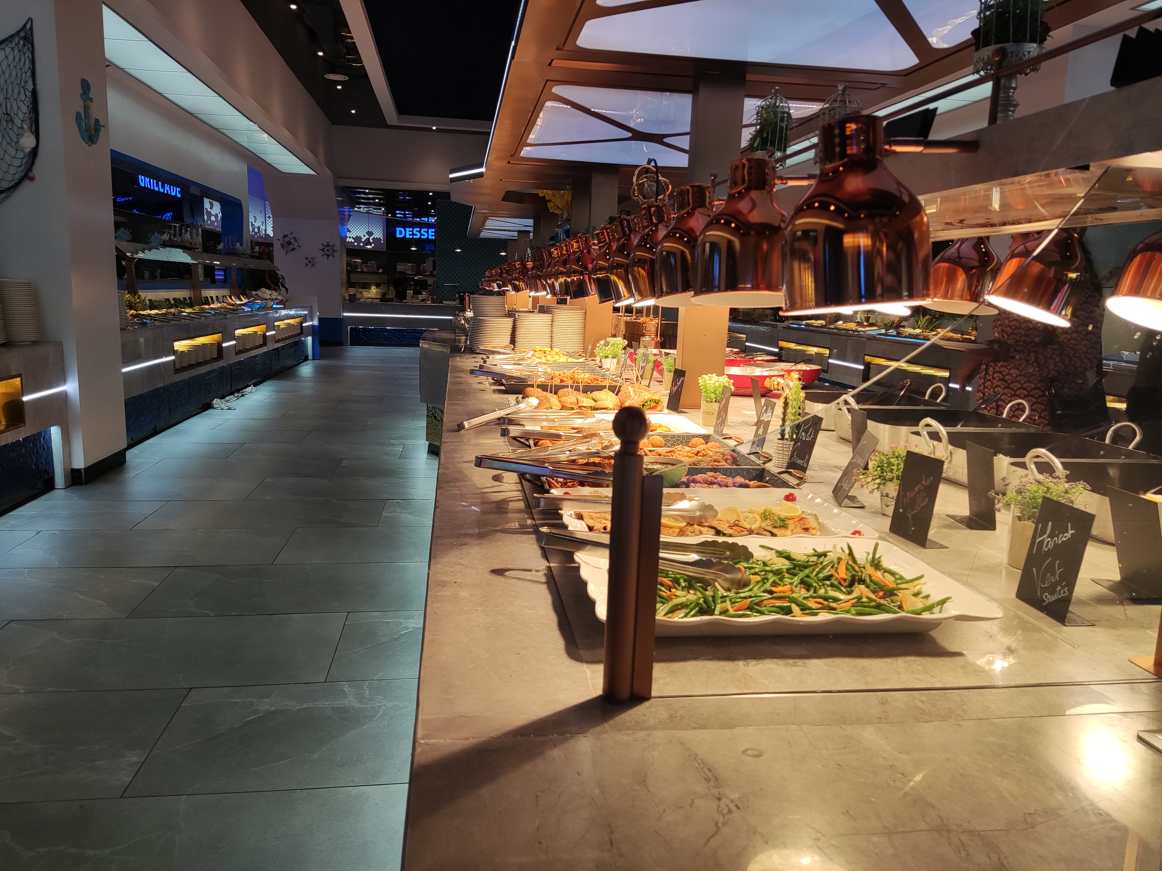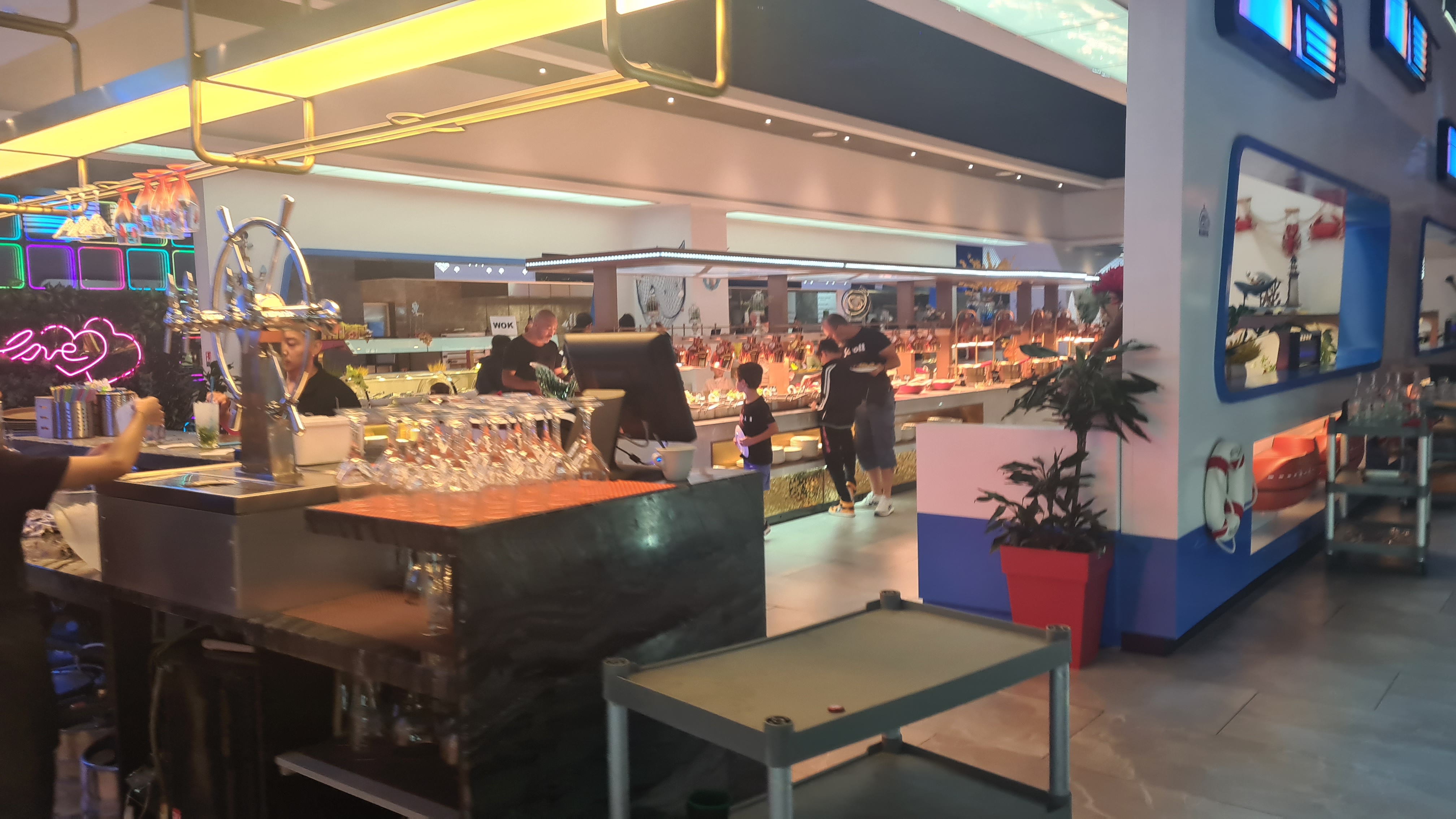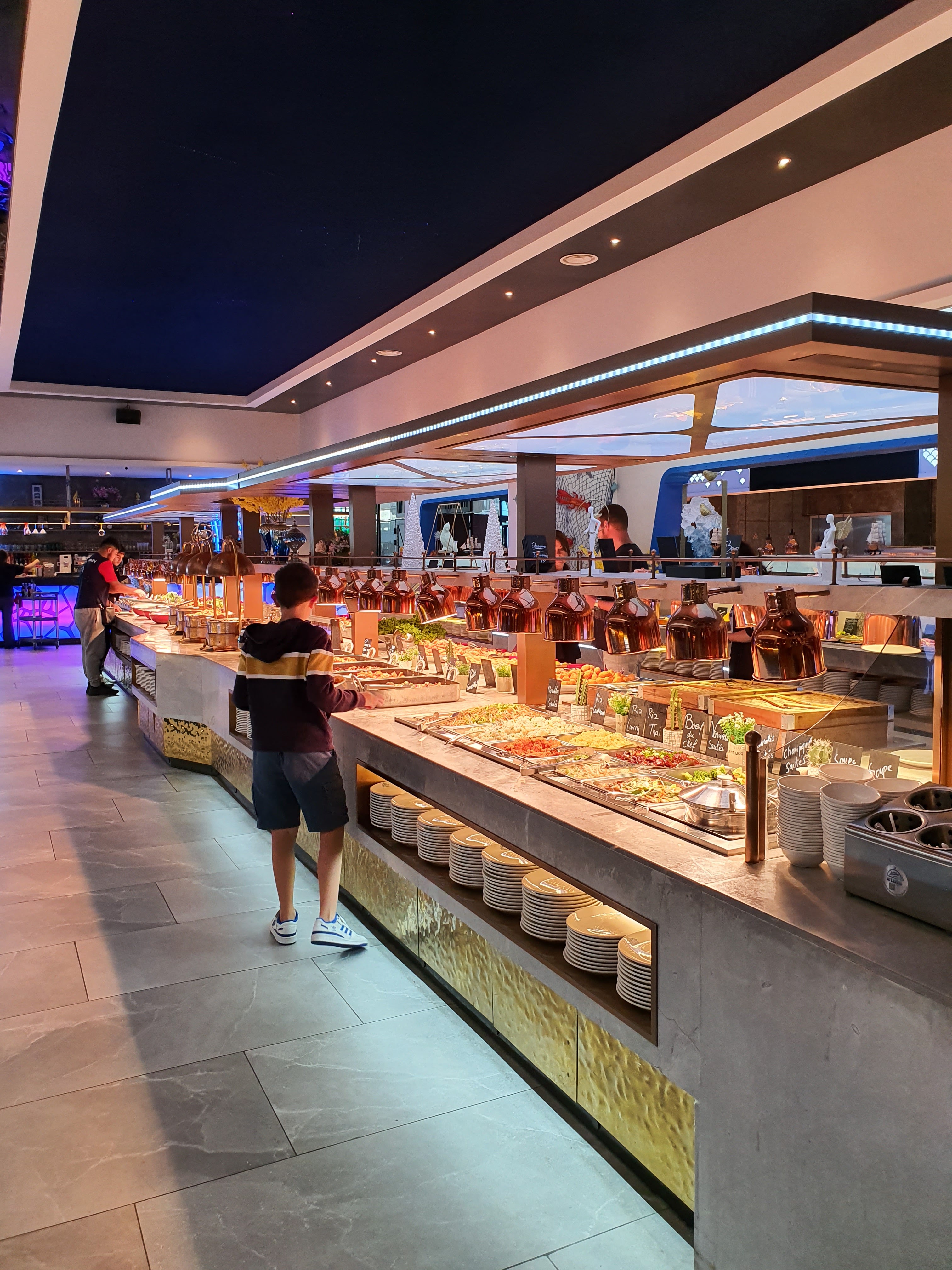 La décoration est très jolie. Aire de jeux pour les enfants qui est une très bonne idée. Cependant beaucoup de quantité et peu de qualité. La nourriture est trop salé pour qu’on boit beaucoup d’eau et qu’on consomme moins et les desserts trop sucré. Les fruits de mer n’ont pas de goût de la mer. Je me demande d’où ils viennent….
