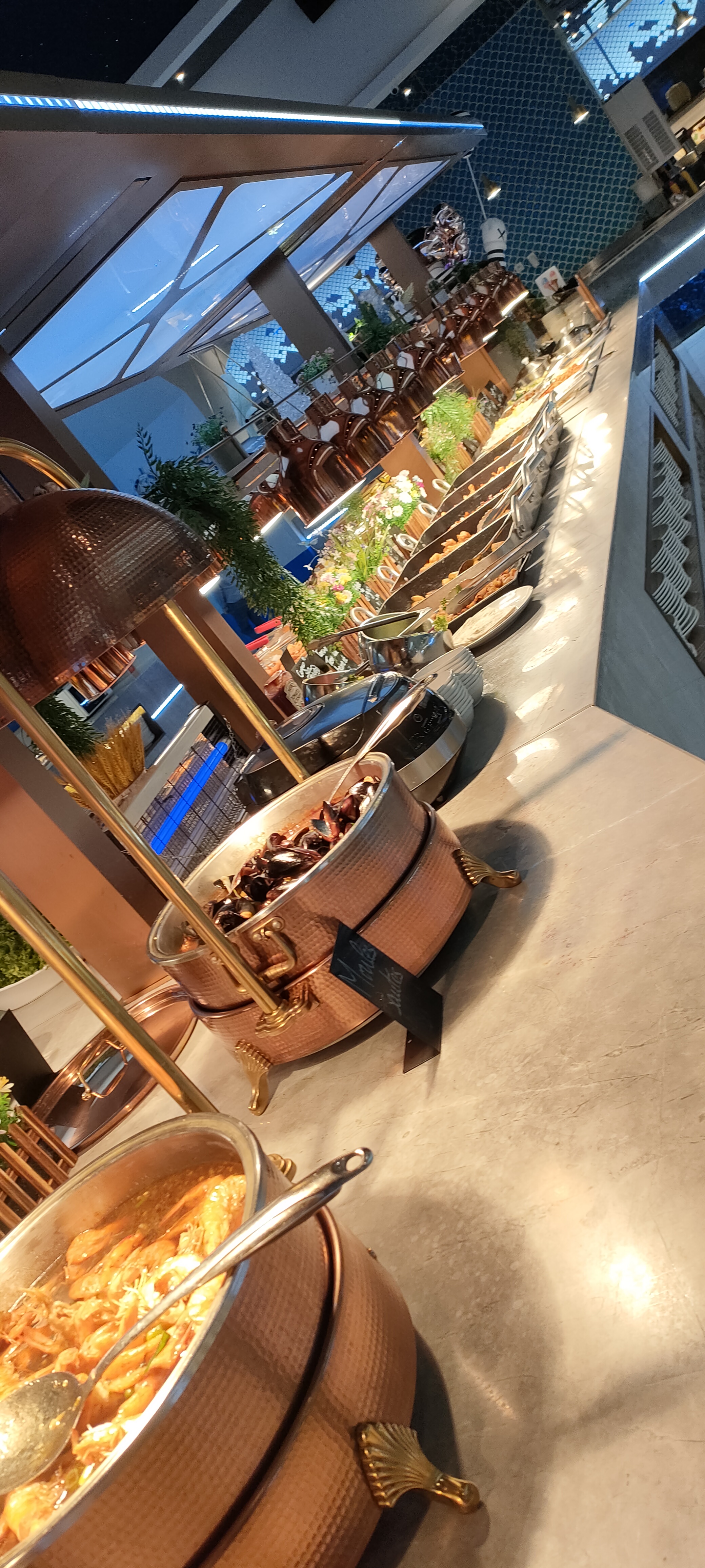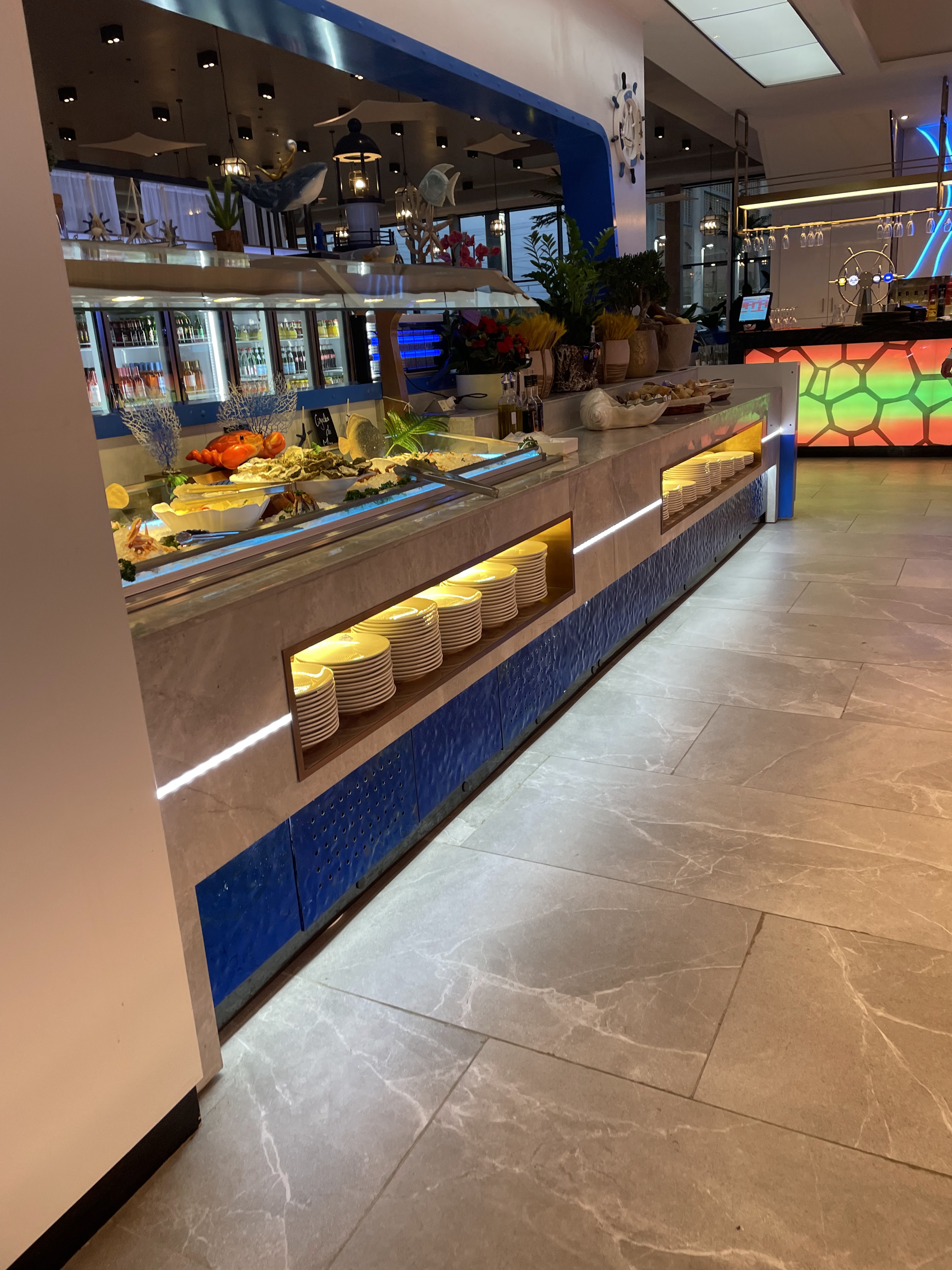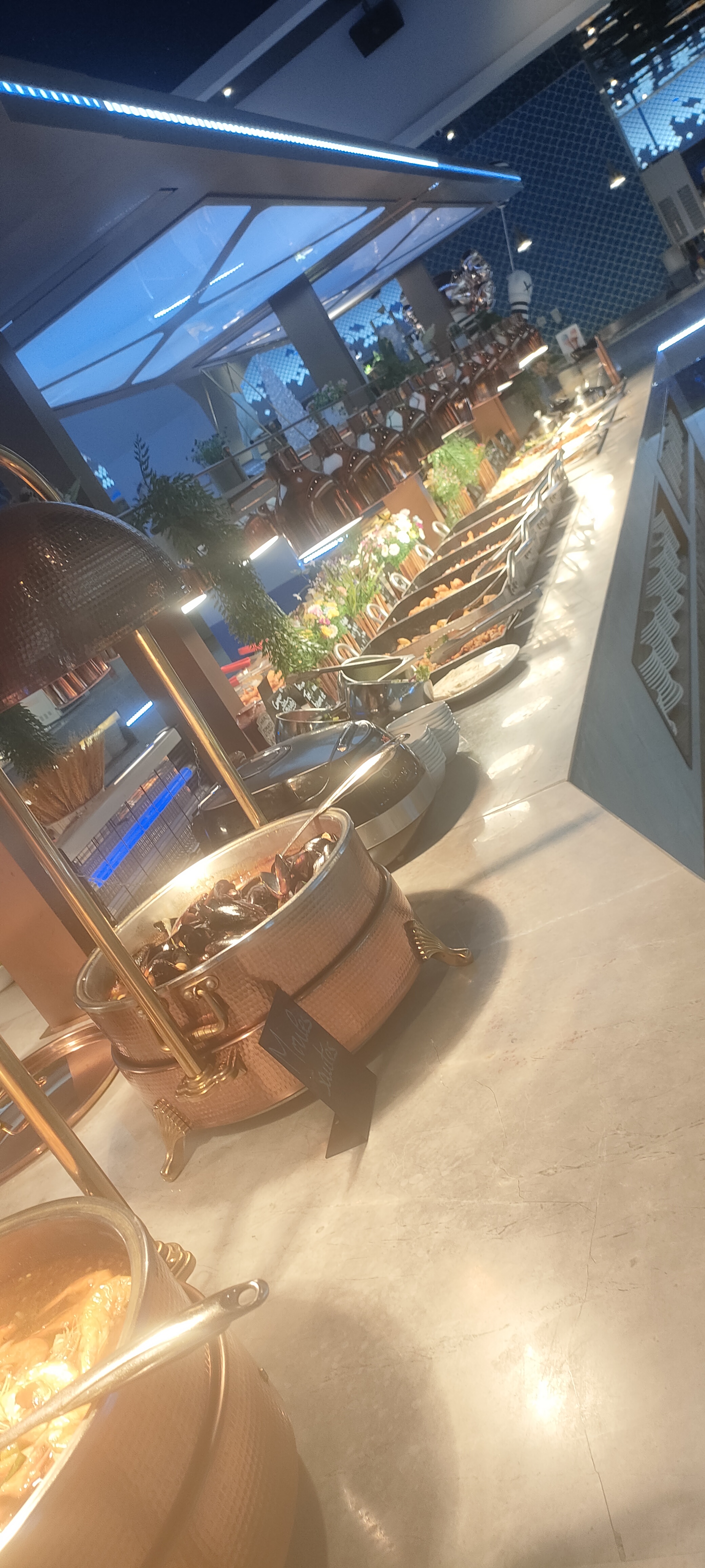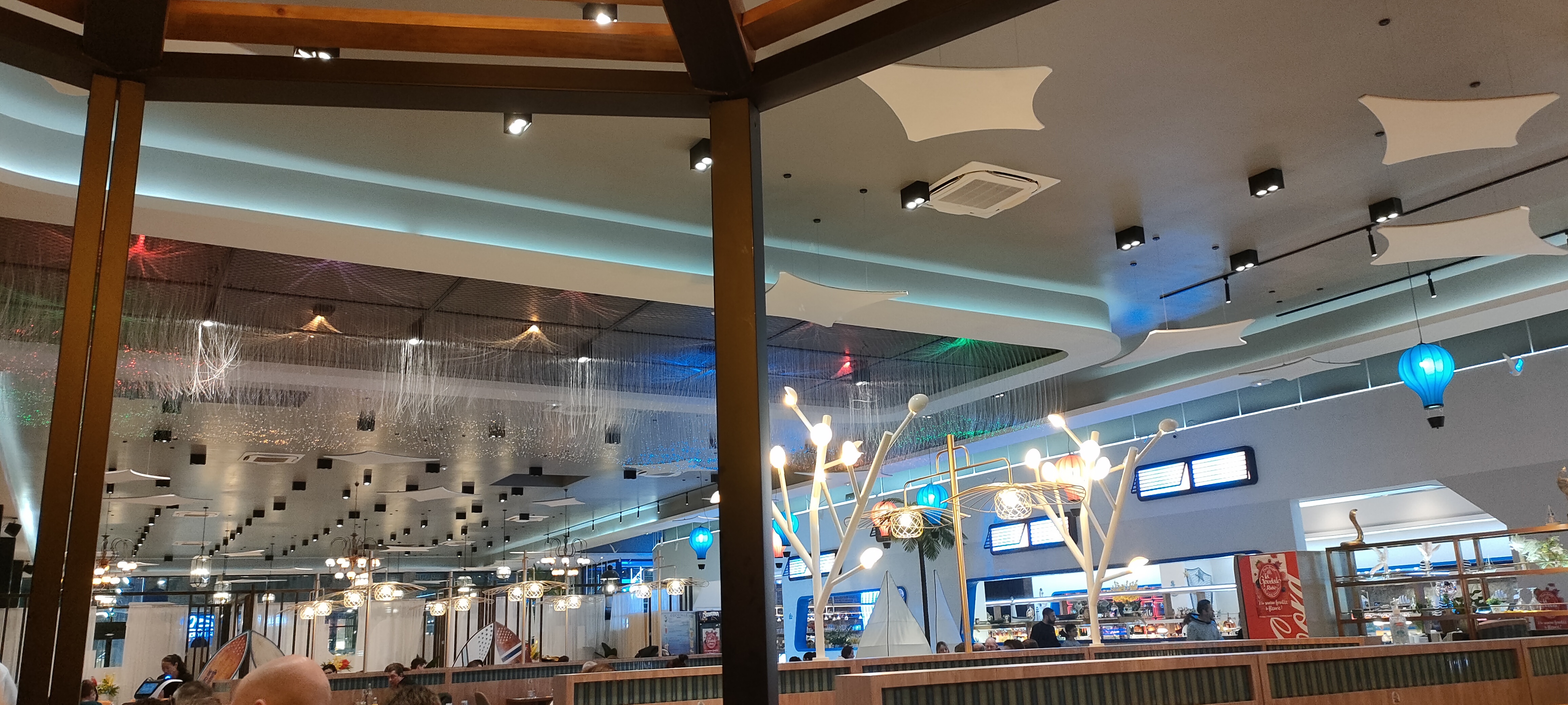 La décoration est très jolie. Aire de jeux pour les enfants qui est une très bonne idée. Cependant beaucoup de quantité et peu de qualité. La nourriture est trop salé pour qu’on boit beaucoup d’eau et qu’on consomme moins et les desserts trop sucré. Les fruits de mer n’ont pas de goût de la mer. Je me demande d’où ils viennent….