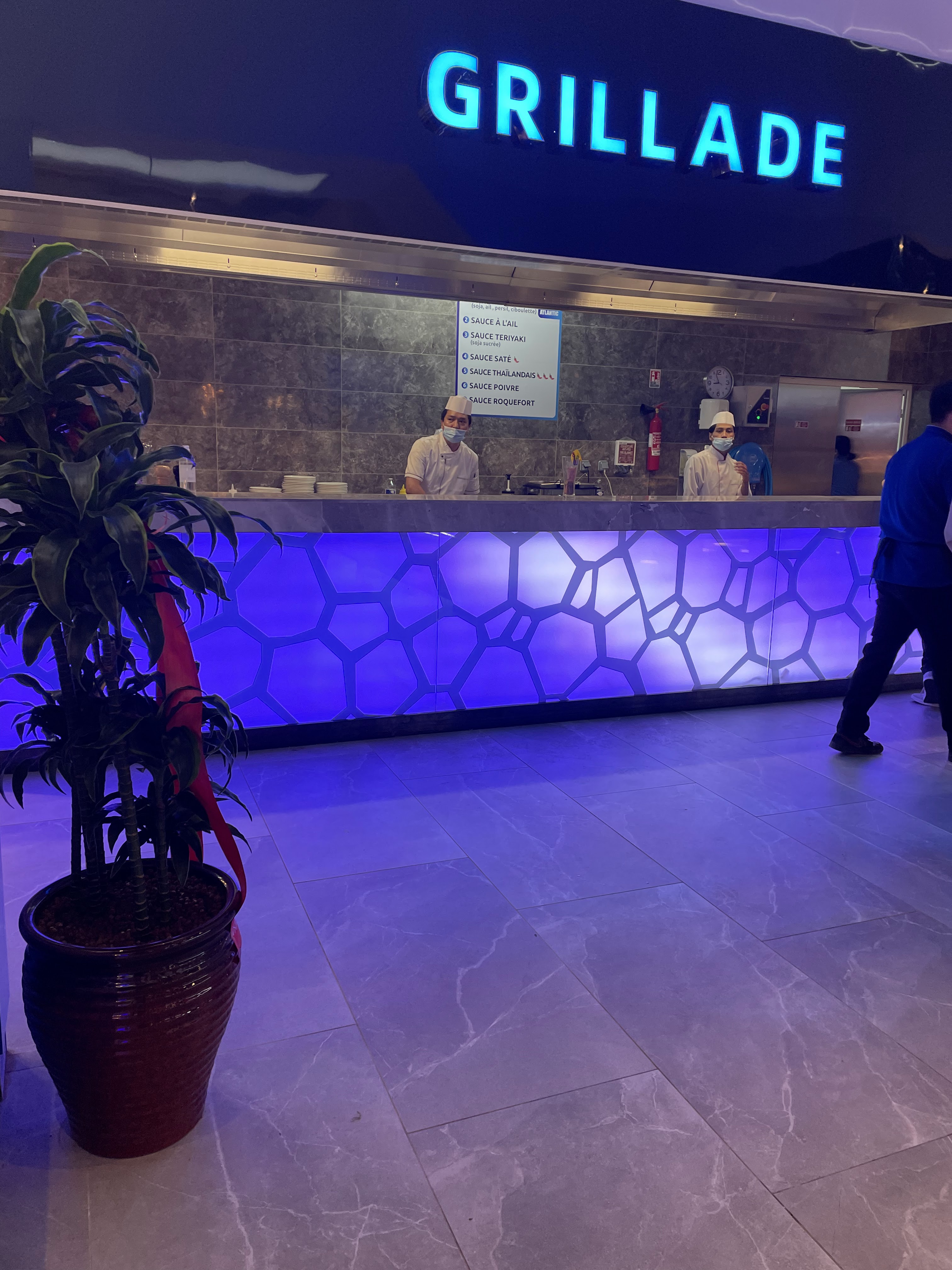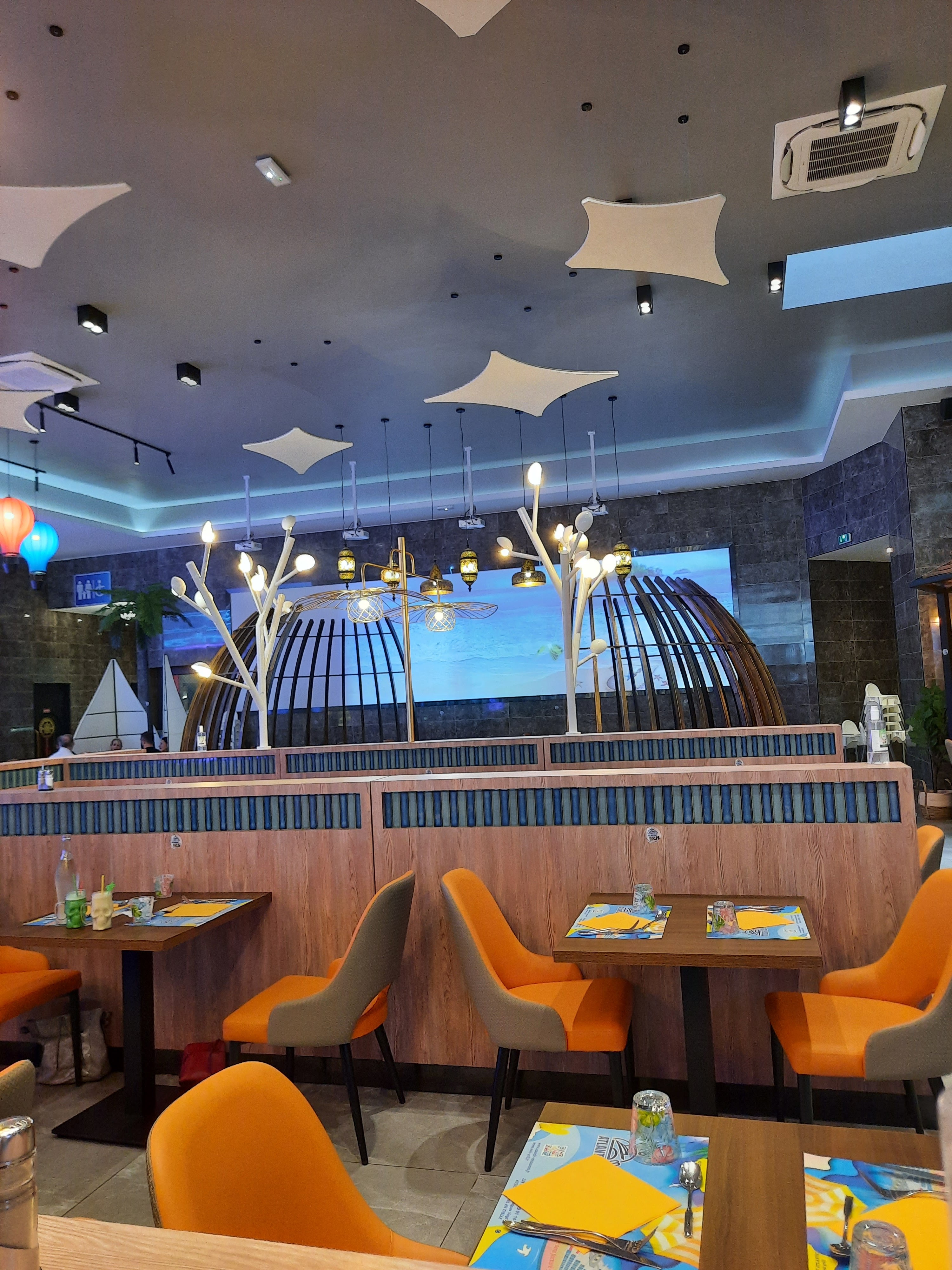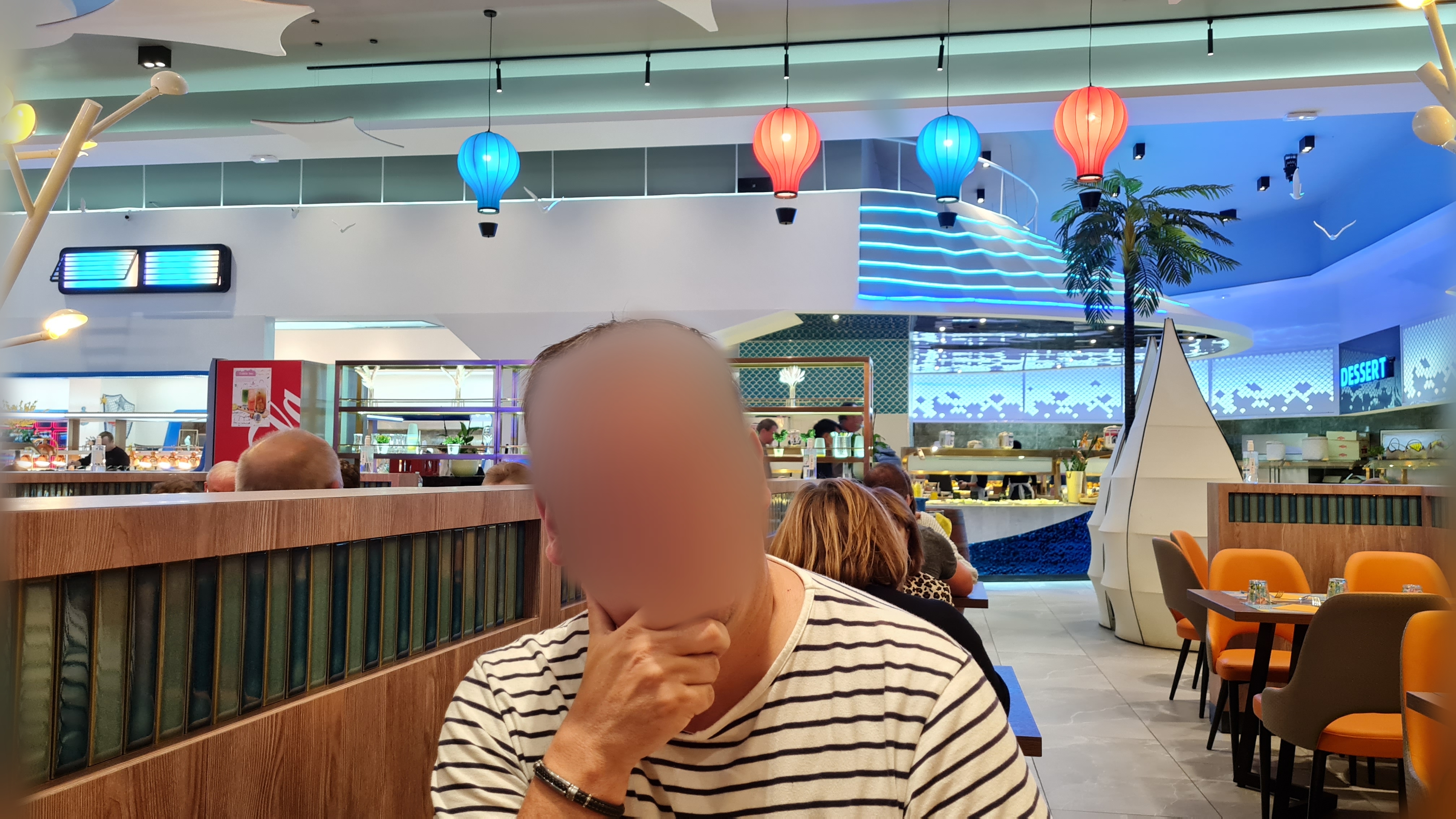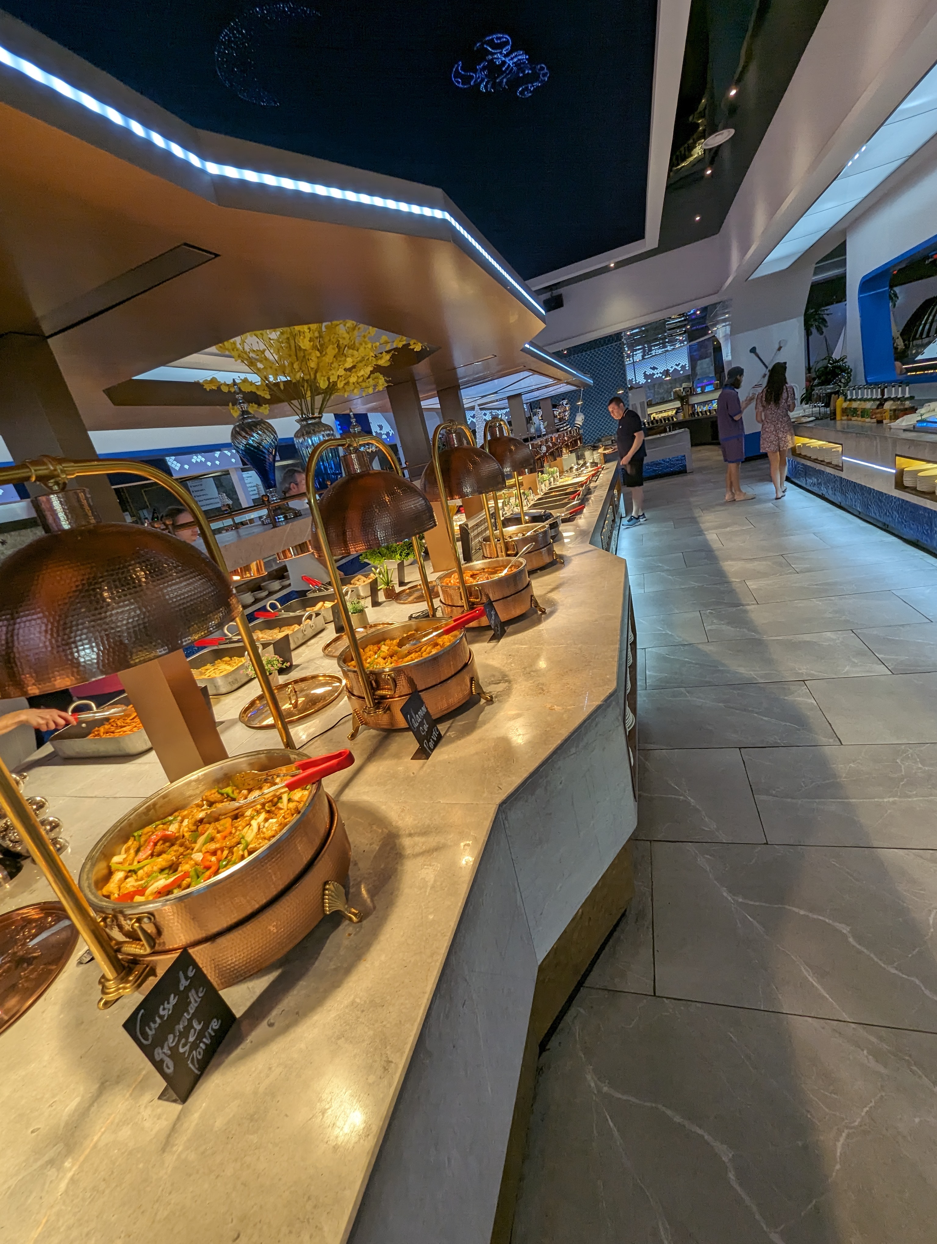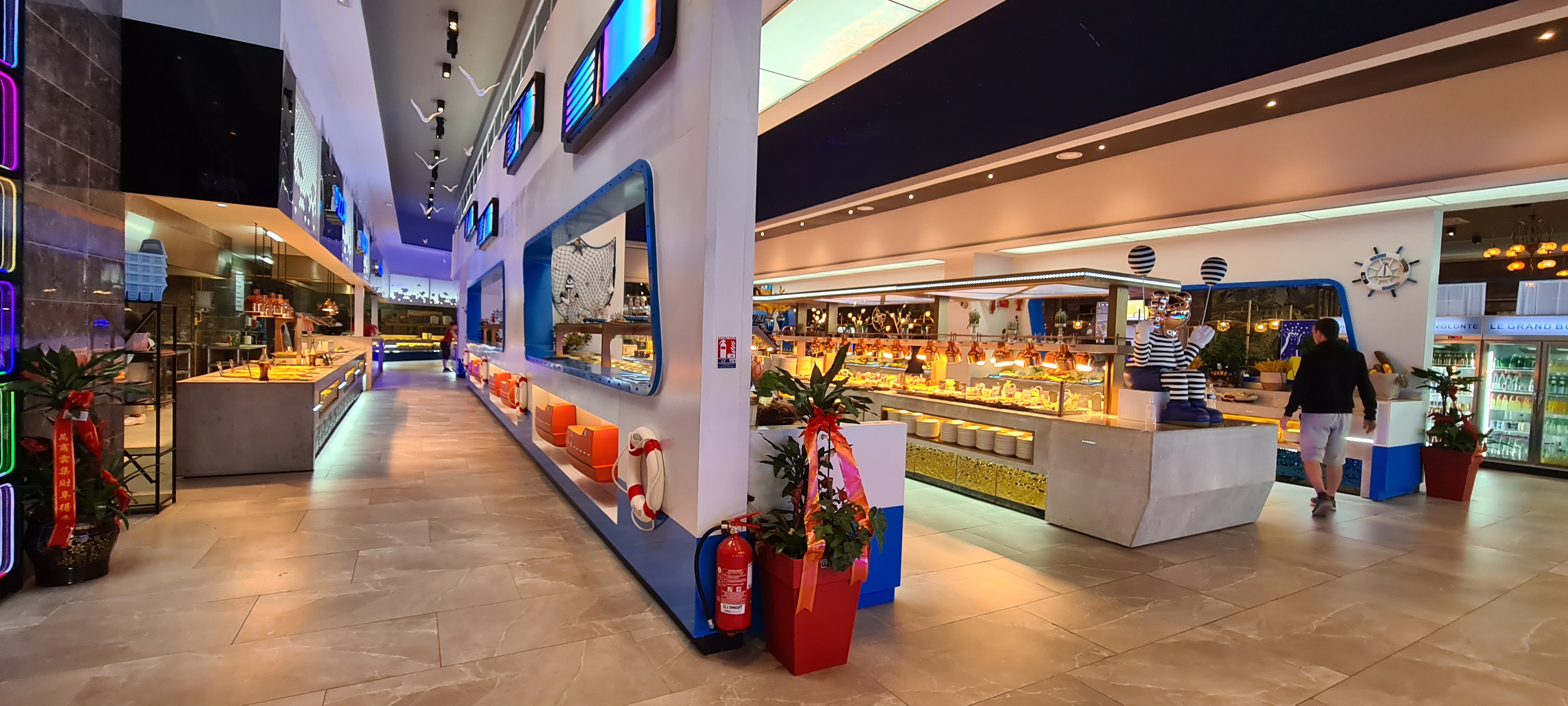 La décoration est très jolie. Aire de jeux pour les enfants qui est une très bonne idée. Cependant beaucoup de quantité et peu de qualité. La nourriture est trop salé pour qu’on boit beaucoup d’eau et qu’on consomme moins et les desserts trop sucré. Les fruits de mer n’ont pas de goût de la mer. Je me demande d’où ils viennent….