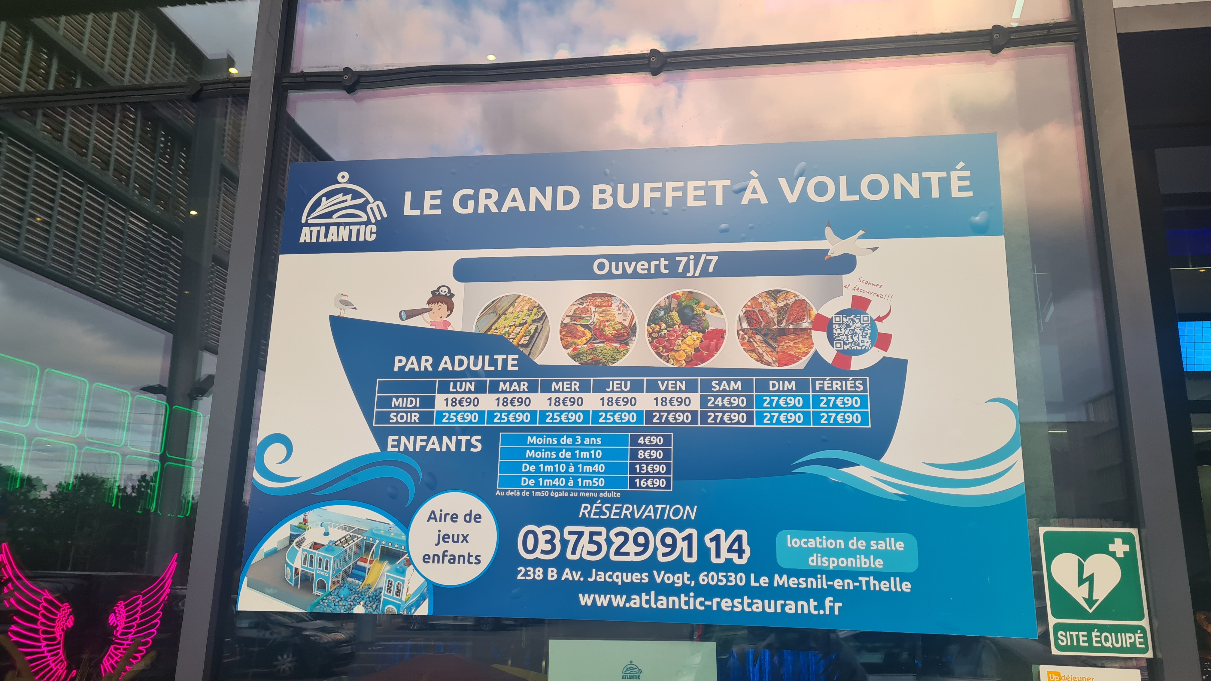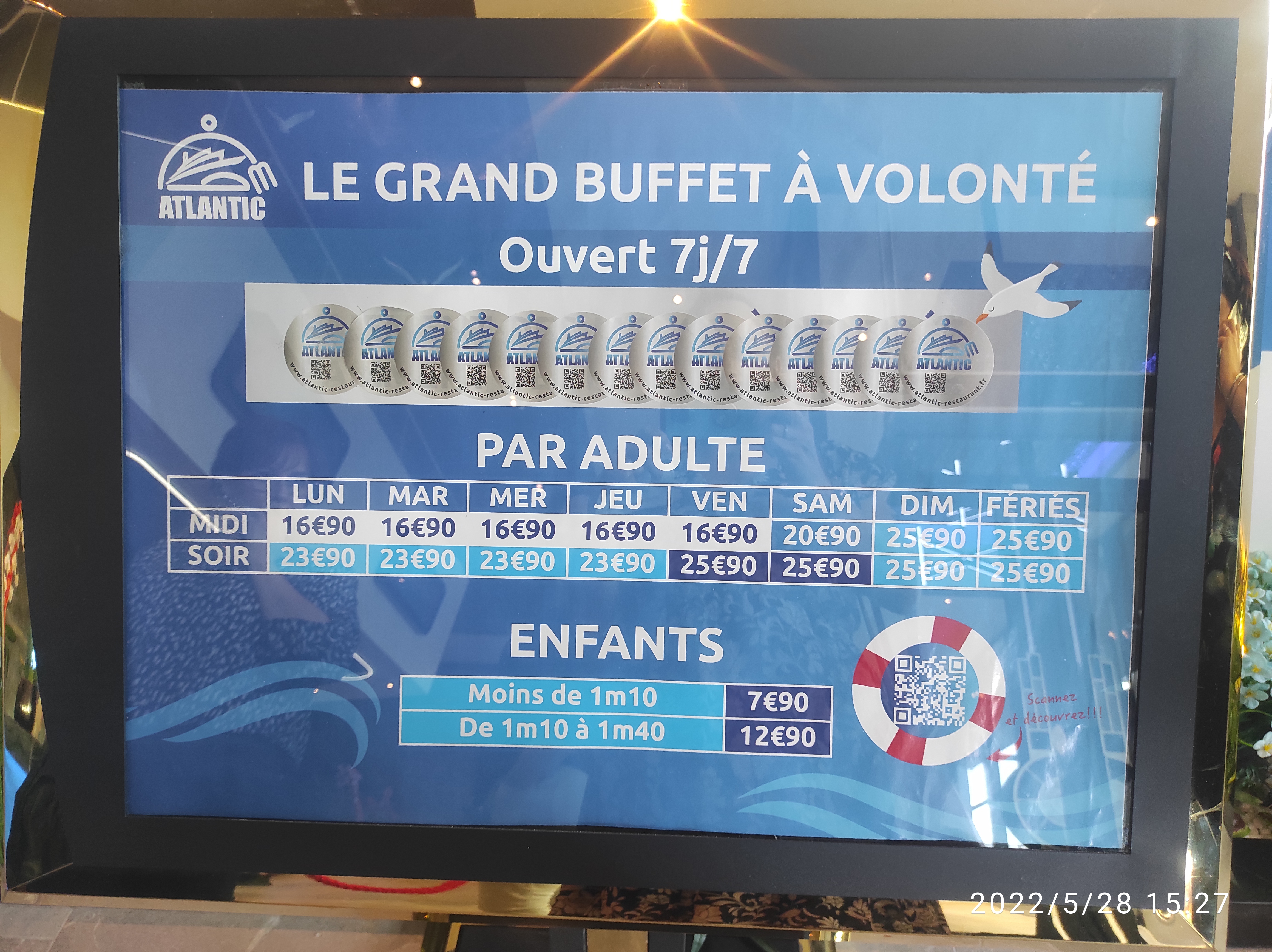 Restaurant ouvert depuis le 15 mars. Suis allée un samedi 20min de queue. Décoration sympa au thème de la mer. Le buffet représente un paquebot plutôt original. personnel dynamique, choix des plats pas assez varié, des petites sauce pour fruits de mer très bonnes. Large choix de dessert. Salle de jeux pour enfants bien pratique.