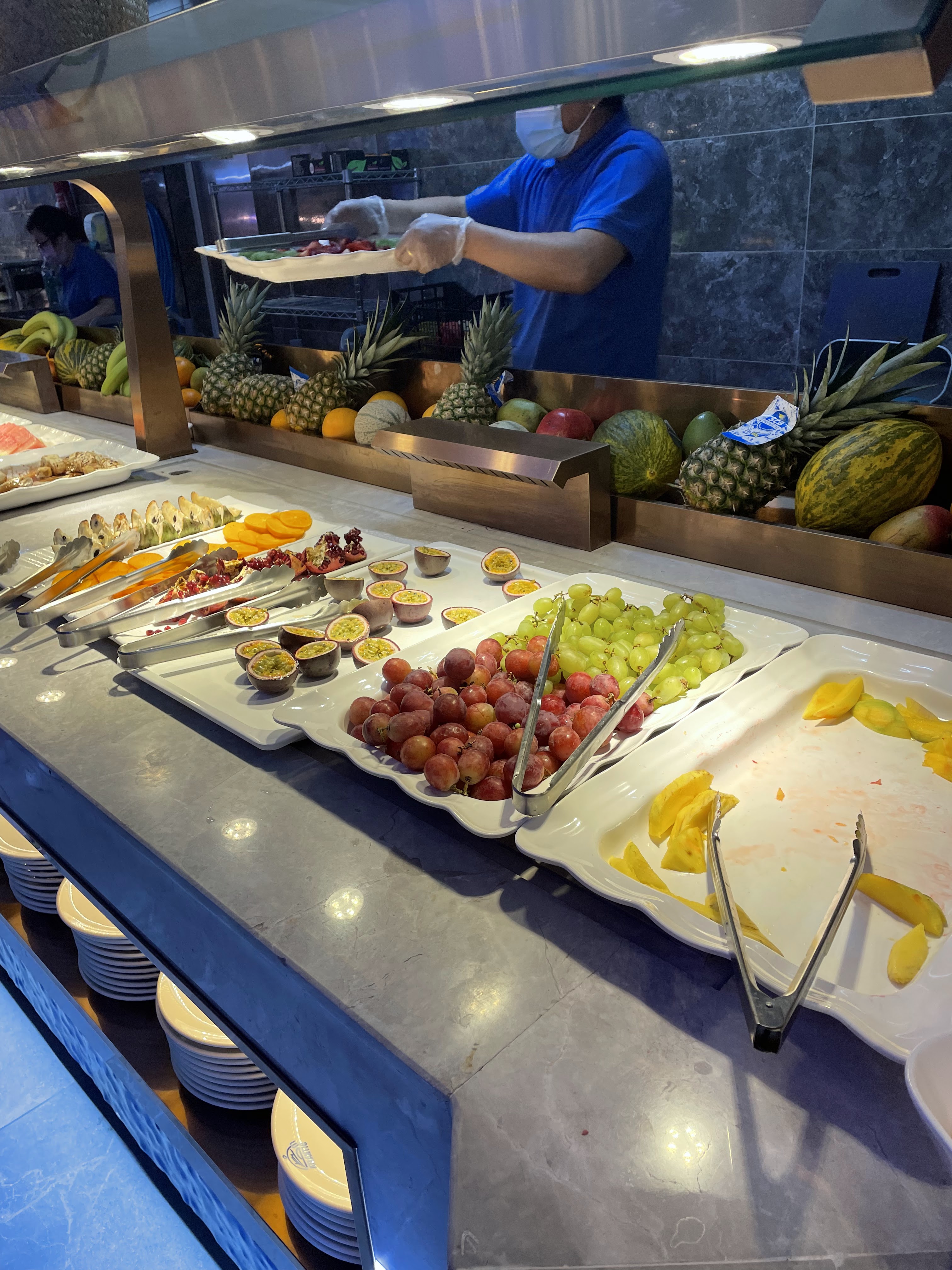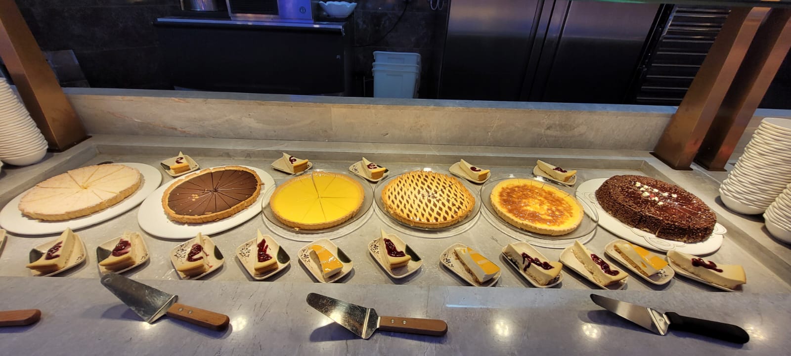 Un très large choix de plats, que ce soit pour les entrées, le plat principal ou les desserts. En revanche les plats chauds au buffet sont plutôt tièdes et refroidissent assez vite. Petit plus sympa, les robots qui amènent les boissons à votre table. Personnel très agréable.