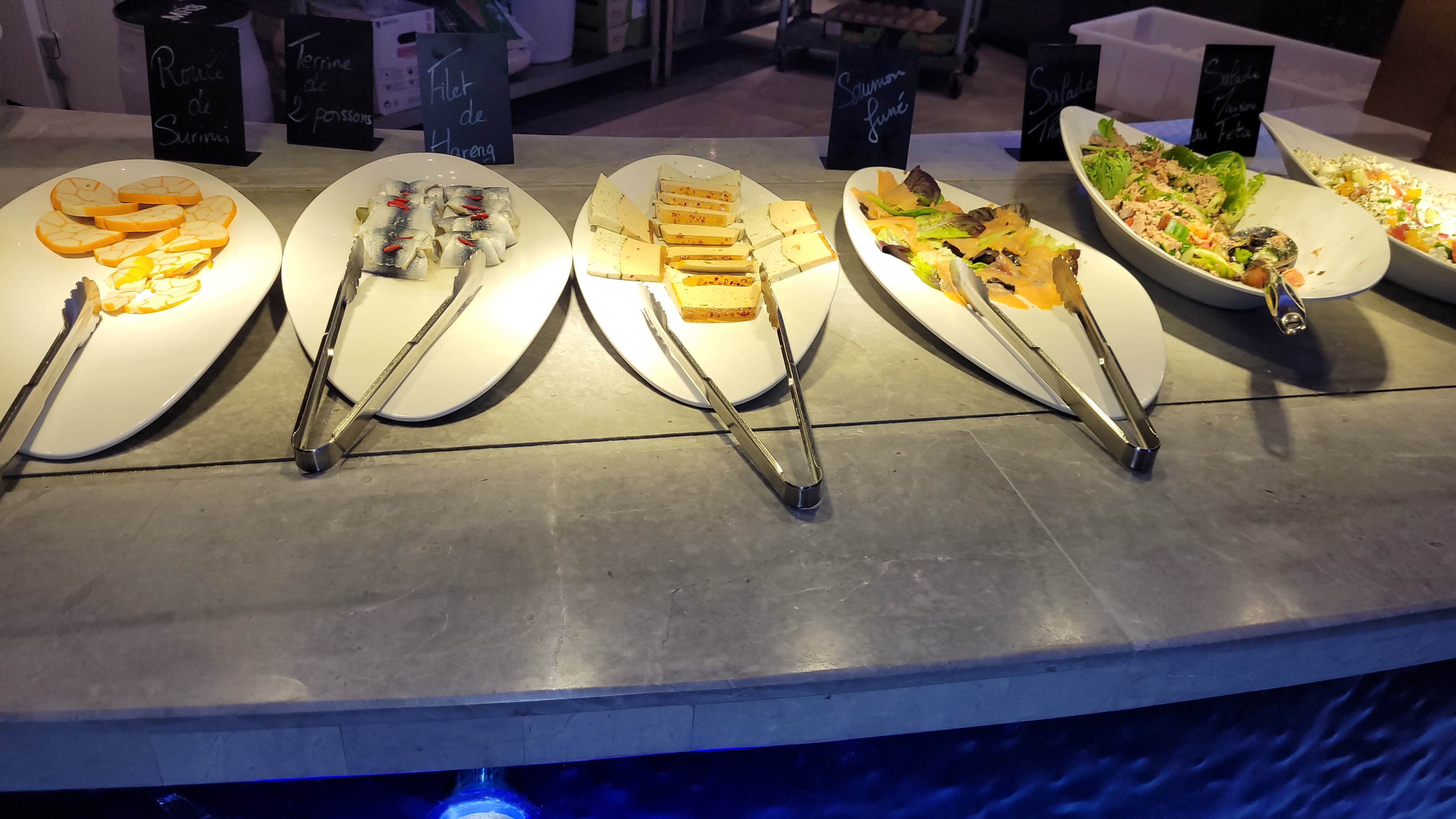 Arrivée 20heures tout est pratiquement juste tiède pas de poisson juste les arrêtes dans le plat. J’ai réclamé ainsi que d’autres personnes mais rien n’est arrivé Les plats sont trop réchauffés et collent dans les assiettes. C’est Trop salés et pas très agréable à déguster La salle est bruyante on ne s’entend plus parler C’est trop chère le soir pour manger du surchauffer J’y suis allée à l’ouverture c’était nettement mieux Je n’y retournerai plus