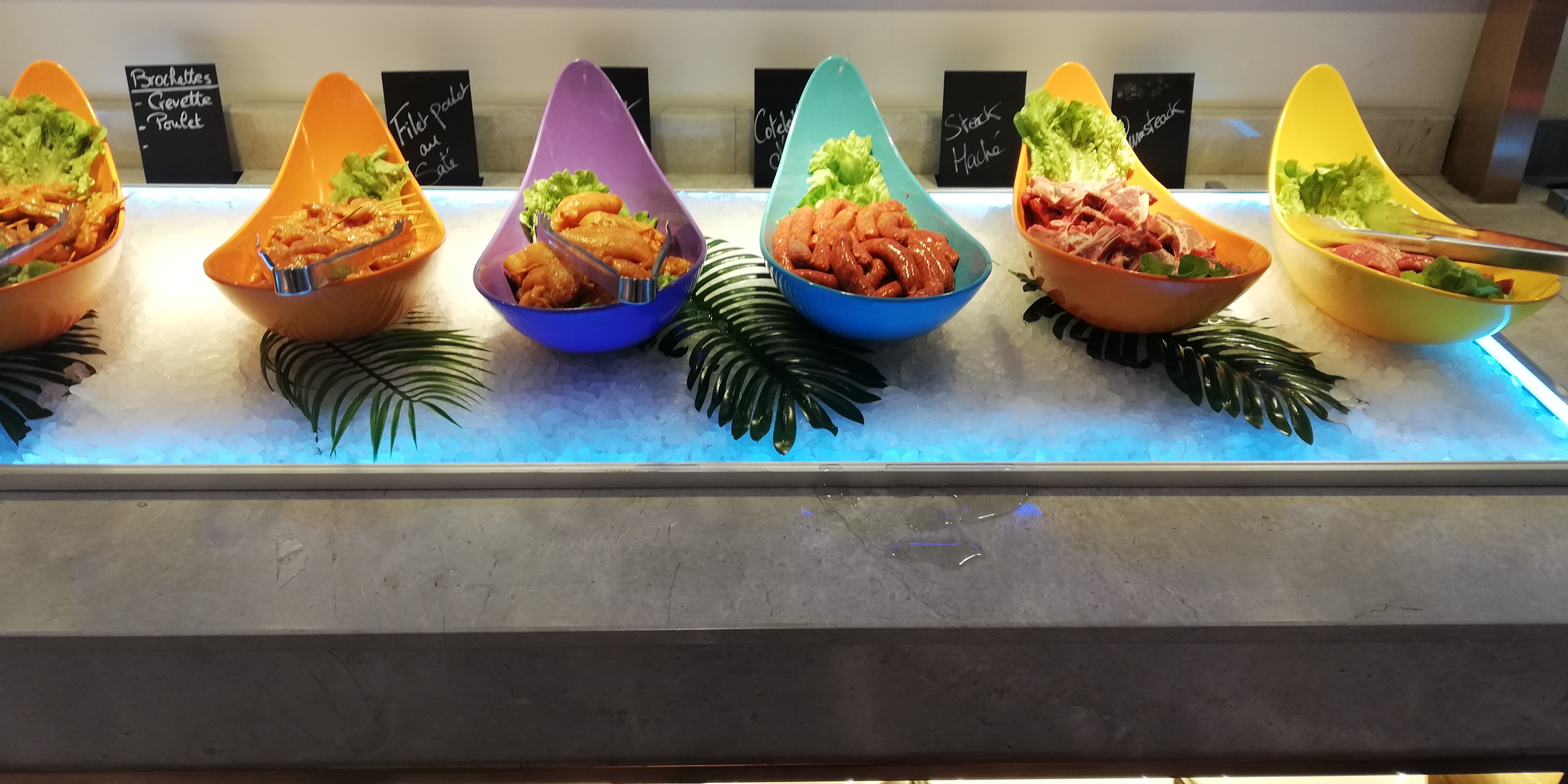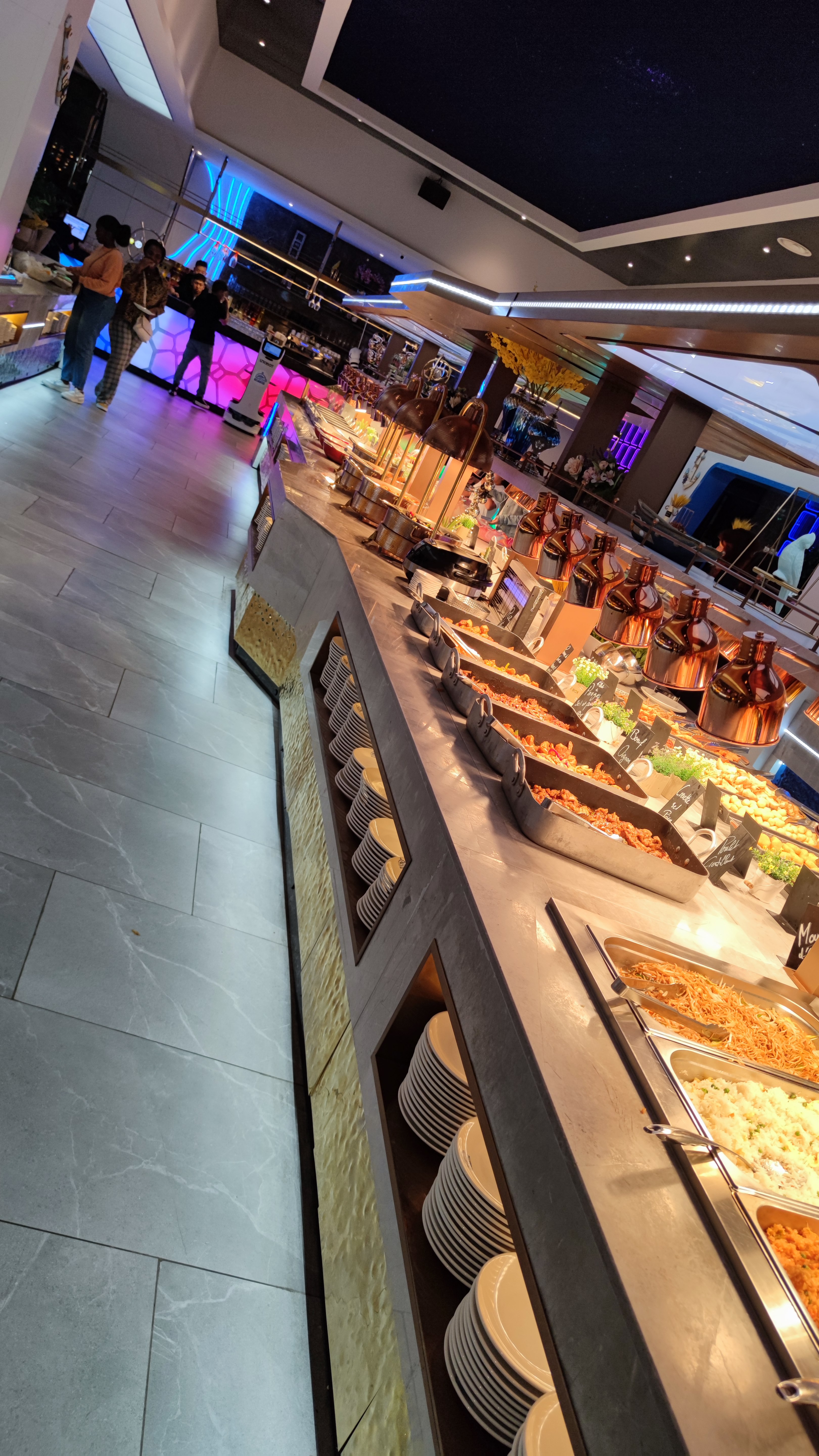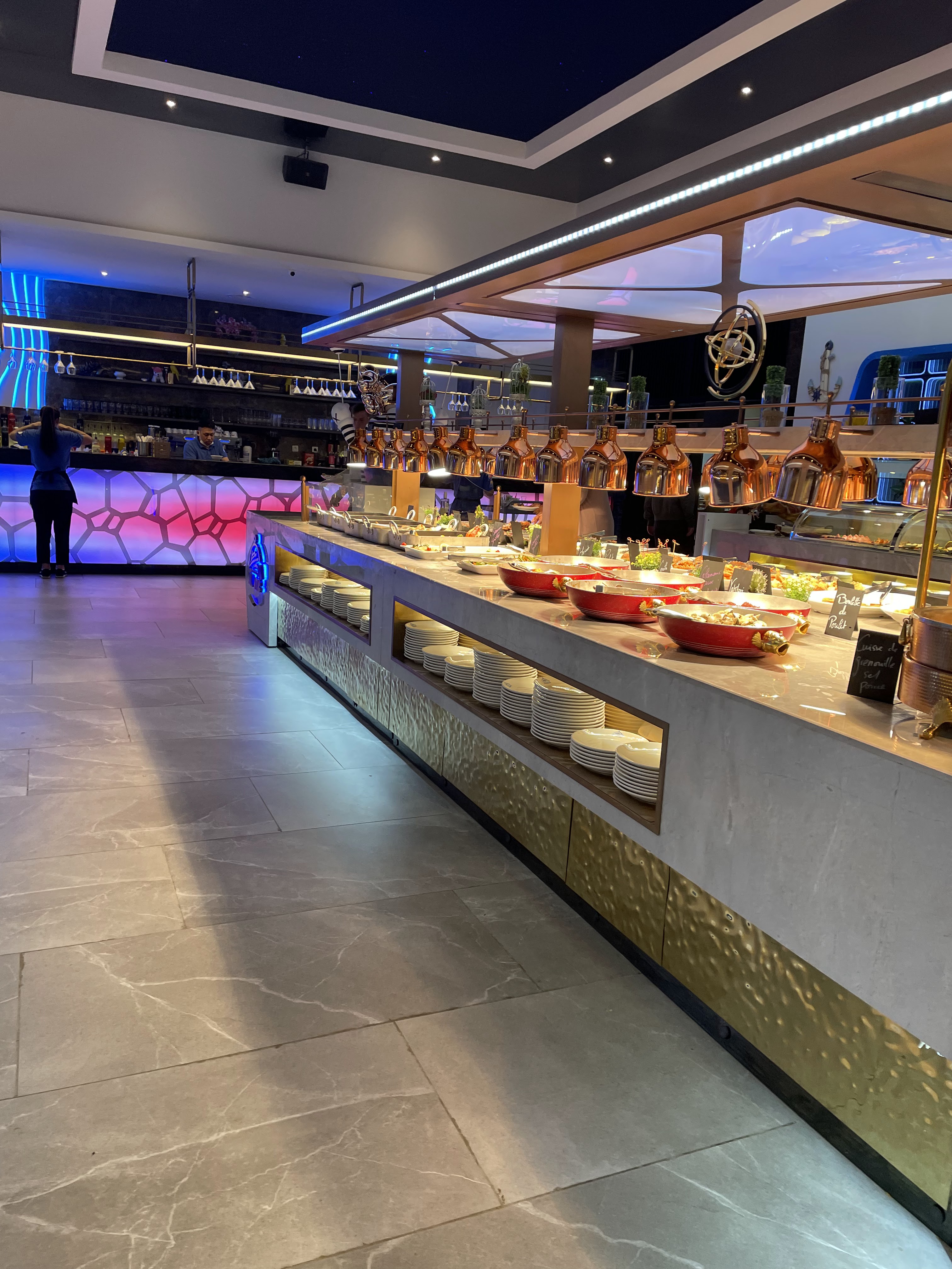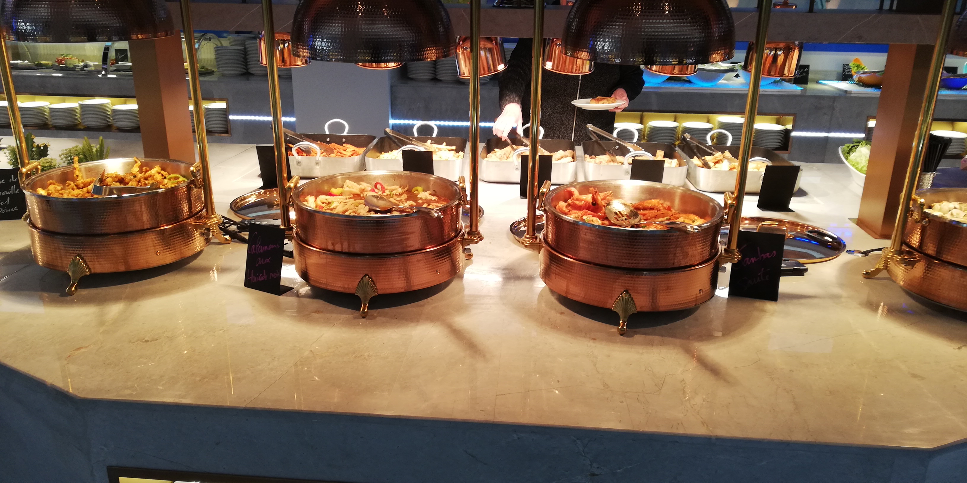 Alors que dire. Buffet très sympas. Très grande salle. Des petits robots qui s'occupent de vous amener les apéros. La nourriture, beaucoup de choix y en a pour tous les goûts donc difficile d'être déçu. Buffet halal pour ceux qui se pose la question sauf les bases porc bien évidemment. Je ne suis pas concerné mais se devait d'être noté pour ceux qui se poserais la question. Pourquoi pas un 5? J'ai eu des viandes mal cuites même cru a l intérieur et inmangeable. Des fois des plats sont tiède voir presque froid. Une adresse pas mal. Légèrement perfectible pour les cuissons et les températures des plats. A voir une prochaine fois si c'est passagé sinon la note sera à revoir à la baisse.