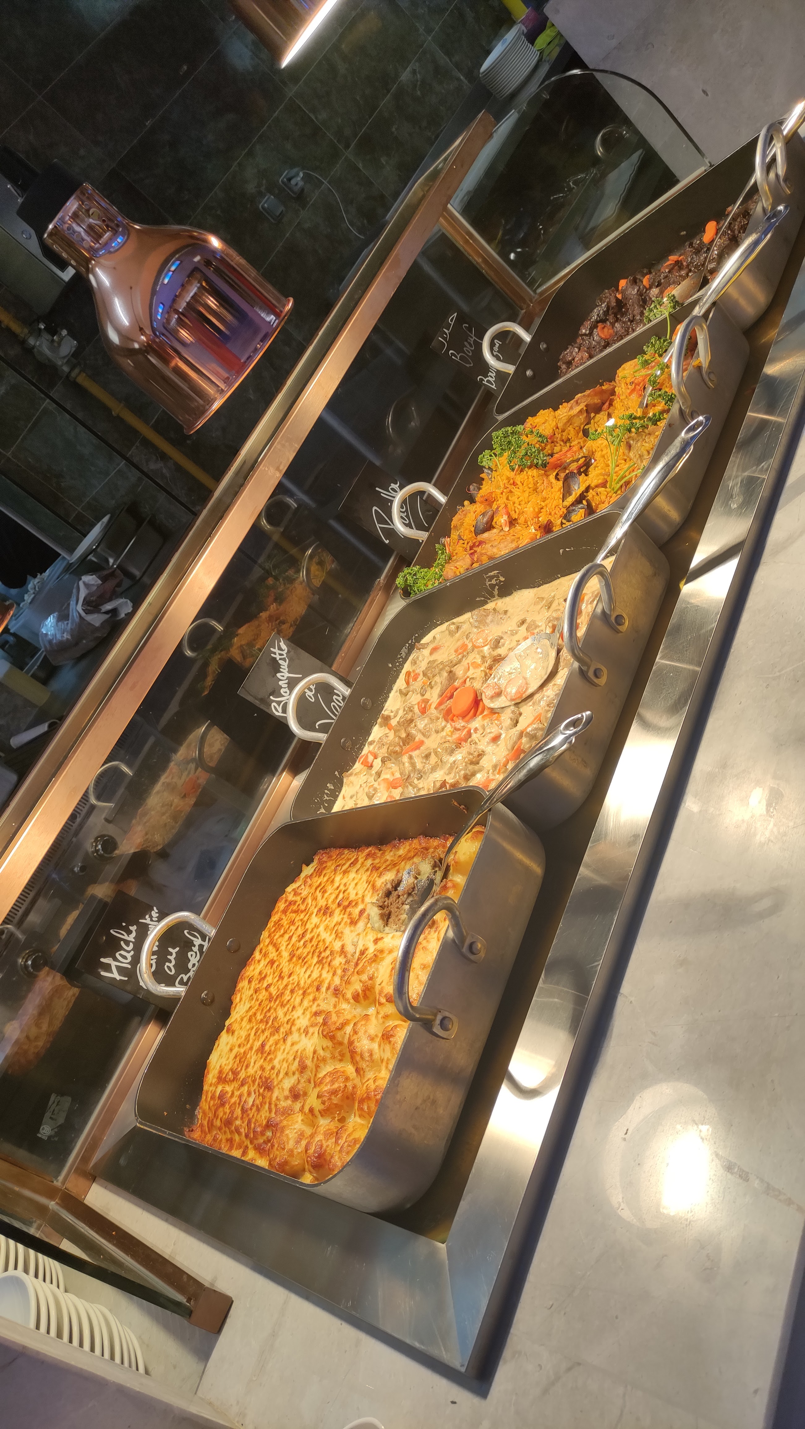 Jolie décor, il y a du choix mais malheureusement très peu pour les gens qui ne mangent pas halal. Toutes les viandes le sont. Donc j'ai pas pu manger de plat à base de viande. 27€ ça reste excessif, restaurant le plus chère ( dans le même type) que j'ai vu jusqu'à présent. Le système des tailles pour le tarif enfant est clairement à modifier ( conçu pour se faire de l'argent) un enfant de 10 ans qui mesure 1m60 va payer aussi chère qu'un adulte alors qu'il mange pas autant.. il y a des choses à revoir.