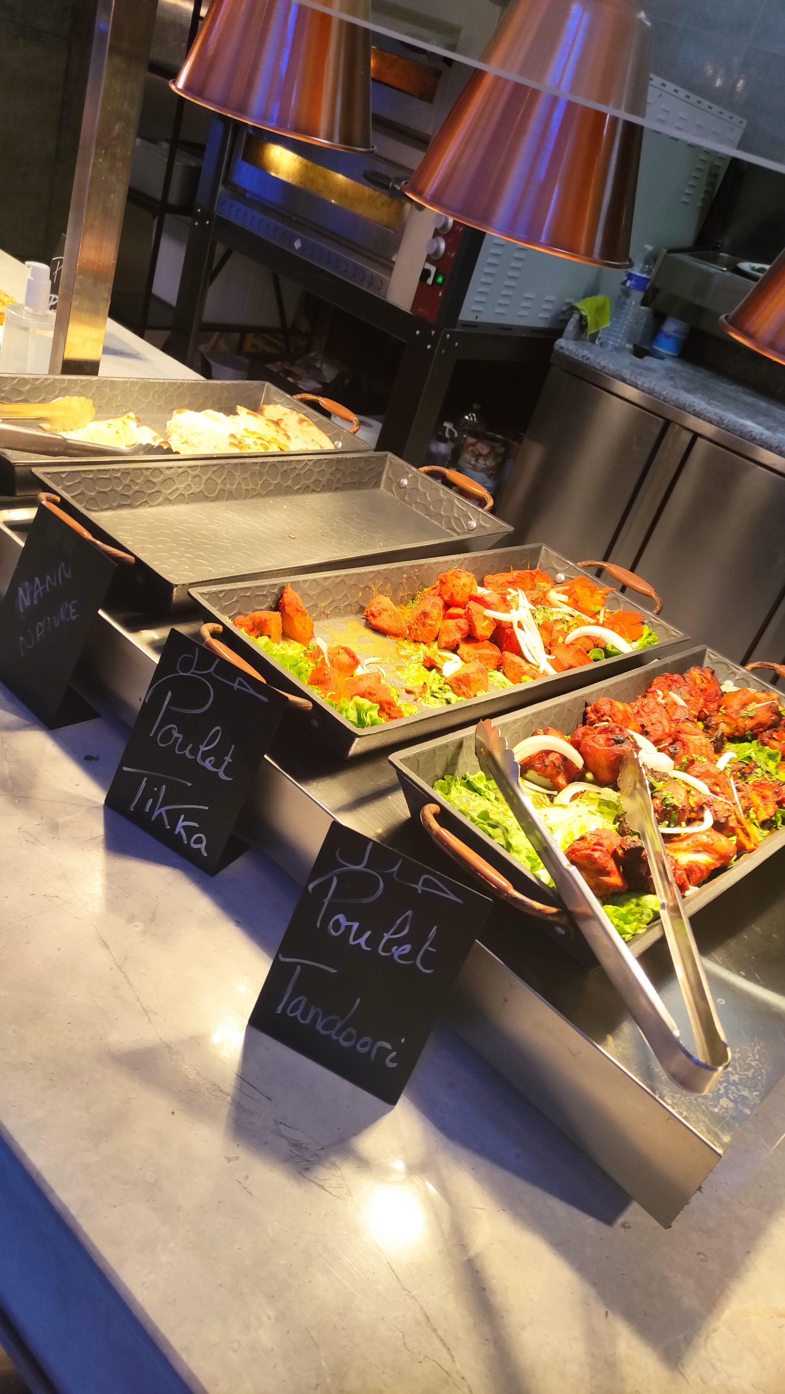 Que dire : à fuir ! chère, pas bon ! Jai eu l'impression de revenir dans un de ces resto XXL le sous marin à Franconville. Aucune identité, des bacs de bouffe à gogo, vous voulez taper dans le gras et prendre 10kg en une soirée ? c'est ici.... On a vu des assiettes de personnes limite à faire vomir ! Alors eux, ils font encore plus fort avec des hamburgers à volonté et même des pizzas. Jai jamais vu ca ! On se sert tranquille du riz, vous avez 3 personnes autour de vous limite prêtes a se jeter sur la bouffe. Horrible ! Sensation d'étouffer, bruyant comme pas possible bref, une usine...j'imagine même pas ce que ça doit être les week-end. Je me suis laissé tenté par du poulet tikka, je vous laisse juger par la photo...Scandaleux, pas cuit, mais finalement rien de surprenant quand on a autant de nourriture à gérer.