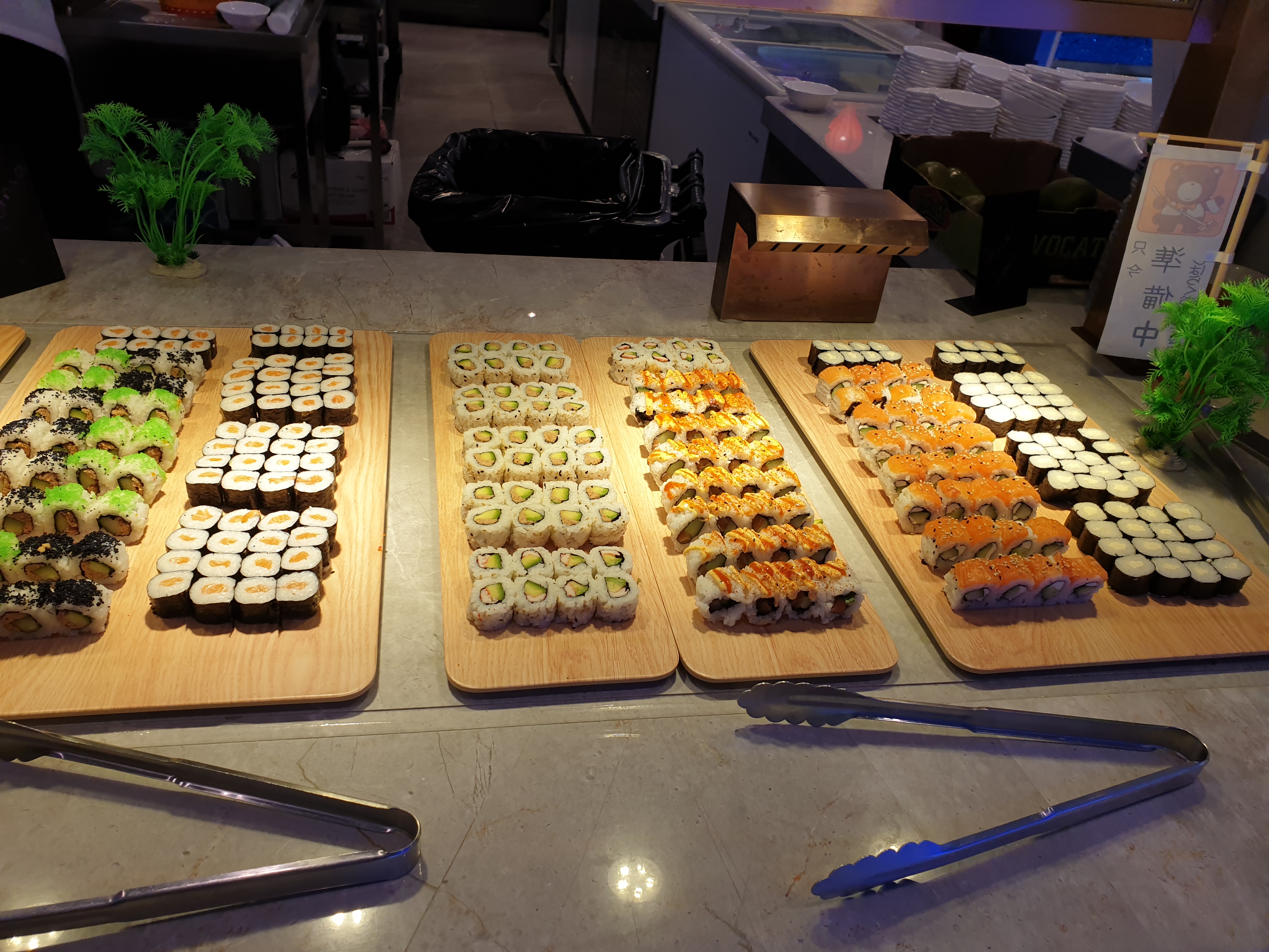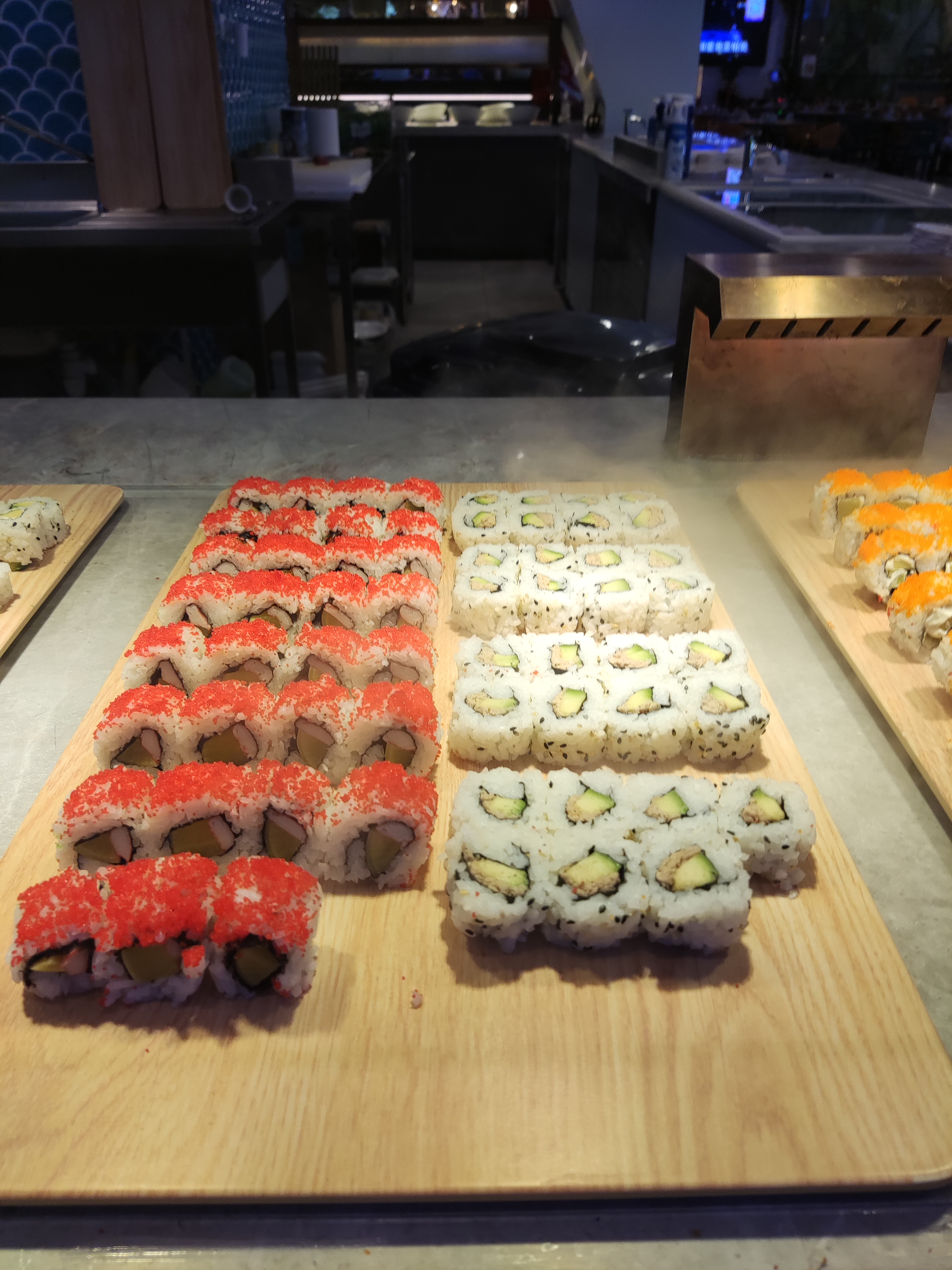 Des buffets suffisamment garnis même en période de forte affluence. La qualité de la cuisine est dans les standards de cette catégorie de restaurant. L ambiance sonore est importante du à l importante taille du restaurant. Enfin il est sympathique de voir les robot servirent les boissons.