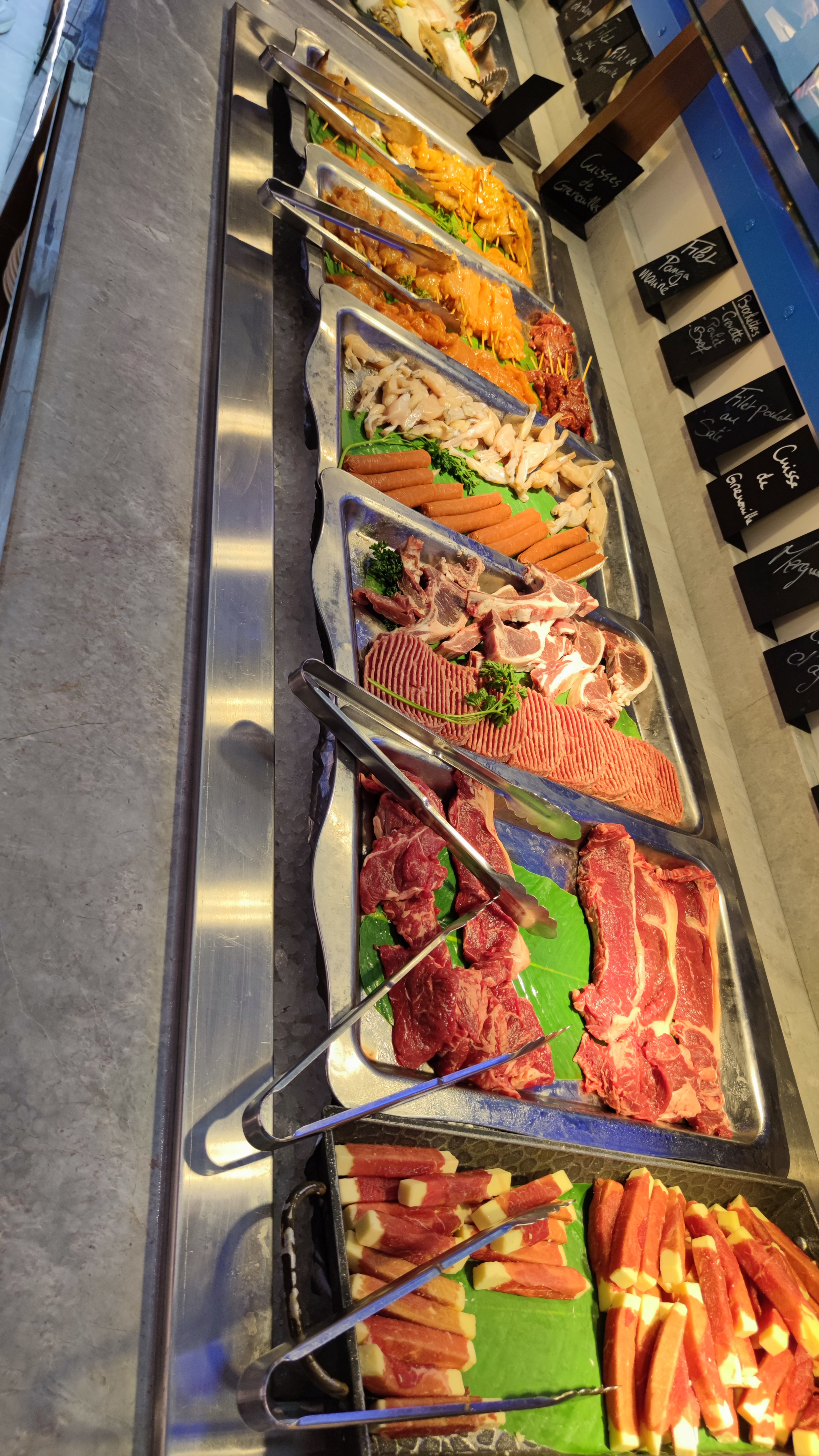 Beaucoup de choix, on y trouve des Plats qu'on n'a pas l'habitude de voir, comme des poissons entiers (bar, dorades,etc), côte de bœuf (bon certainement un peu trop cuite pour ceux qui mangent Bleu 😊) ou gigot d'agneau. Service via les serveurs humains ou les robots 😁(les petits vont adorés) Bien mangé en tout cas 👍