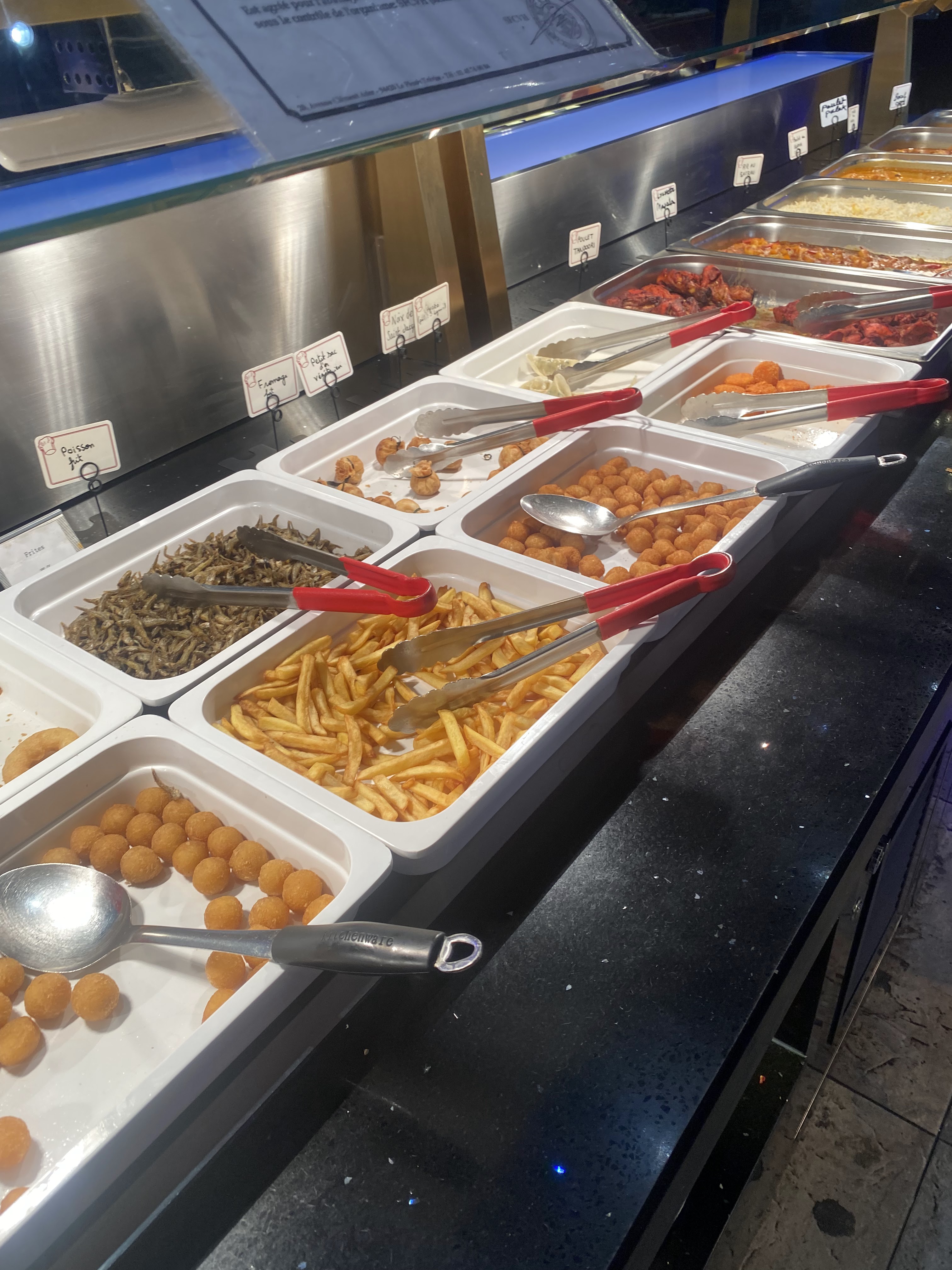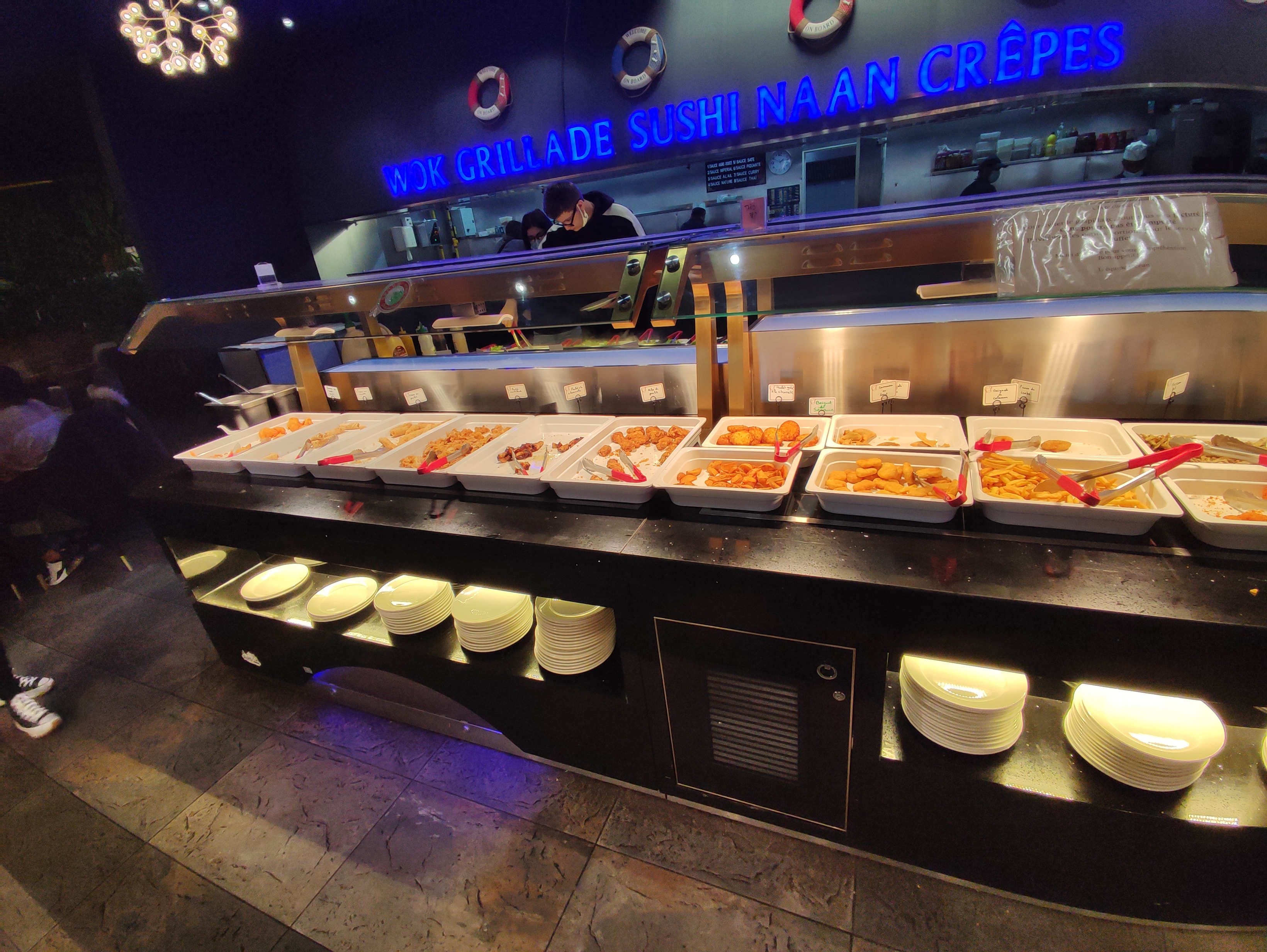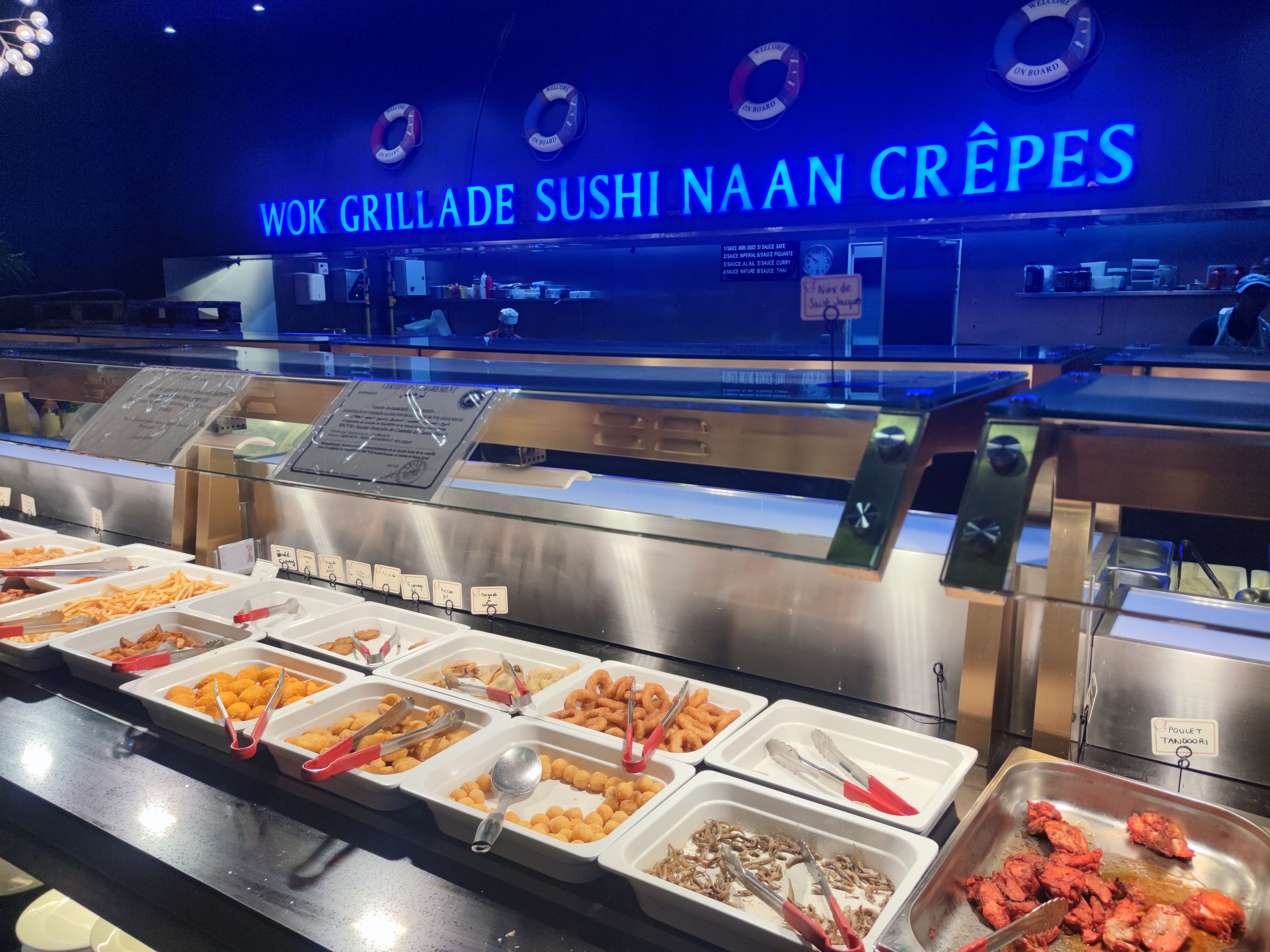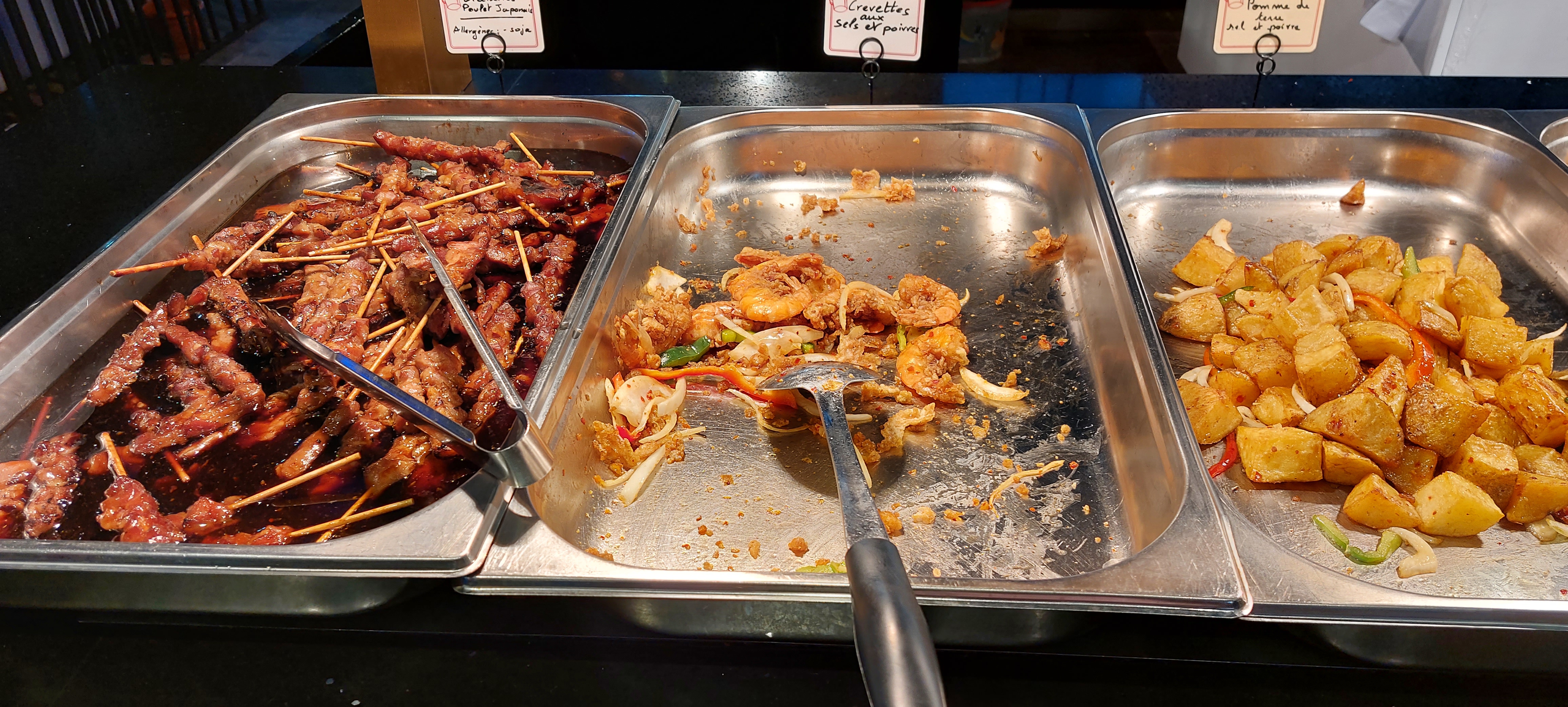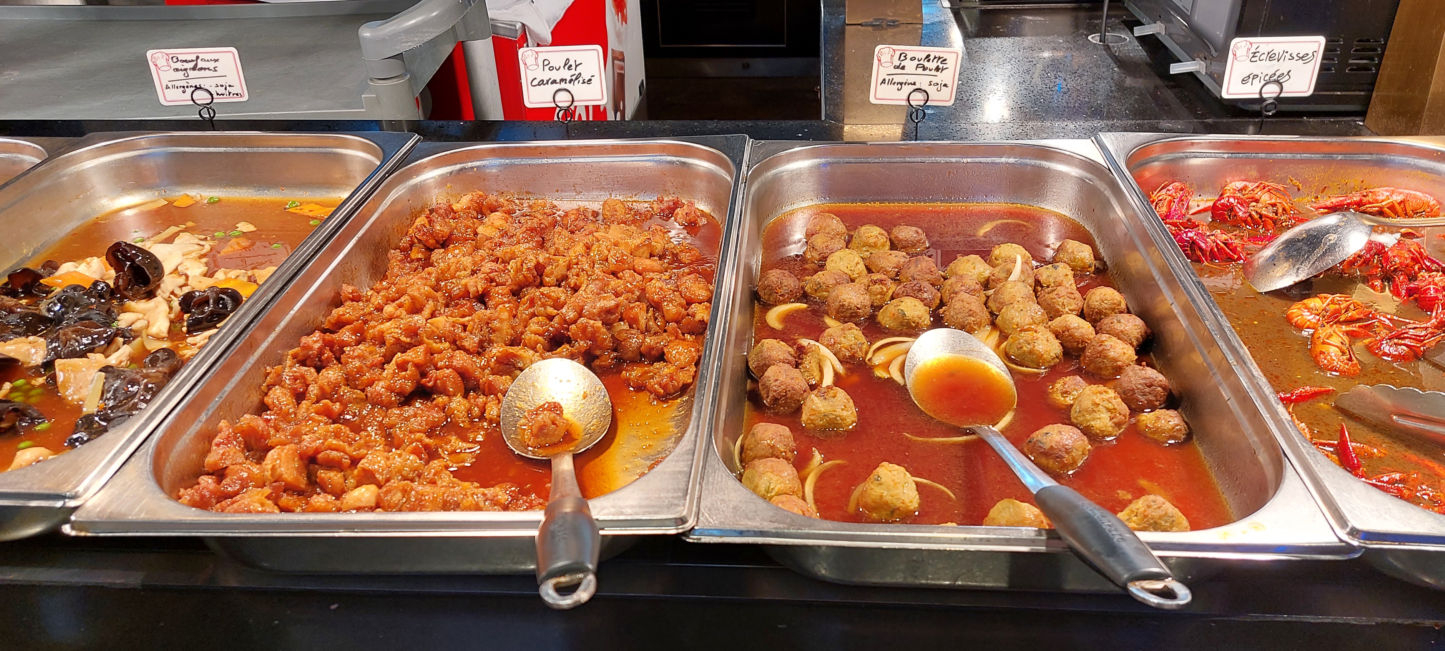 Énormément de choix, tout est bon voir très bon surtout les sushis/California, brochettes, boulettes de poulet ... Il y'a un stand pour faire sauter des aliments cru, ils font des naans fromages et des crêpes sucrées. Ce qui m'a le plus étonné c'est la qualité des desserts : délicieux ! Tartes, perles coco, mousse au chocolat, pannacotta ou gâteaux bref je recommande !