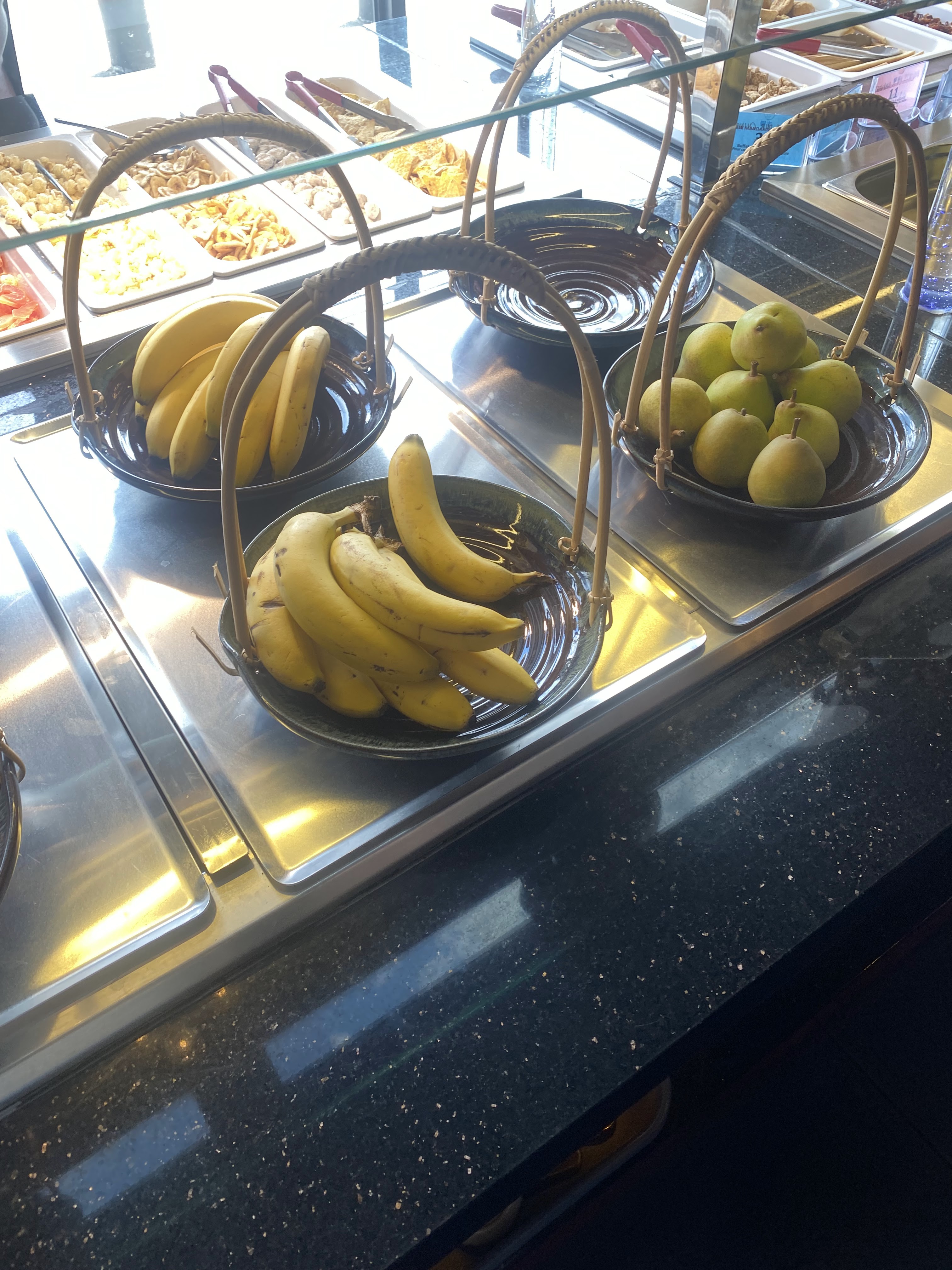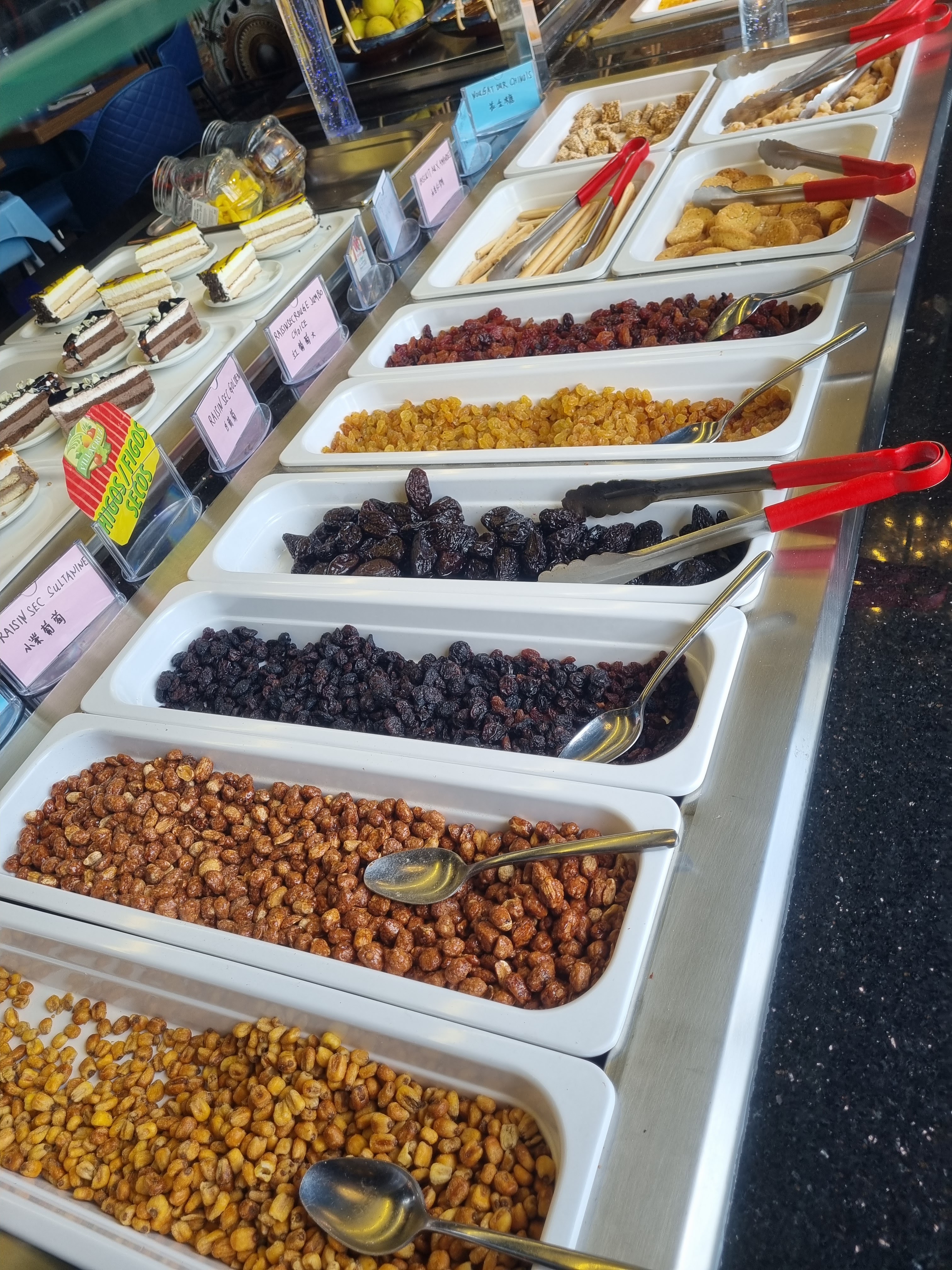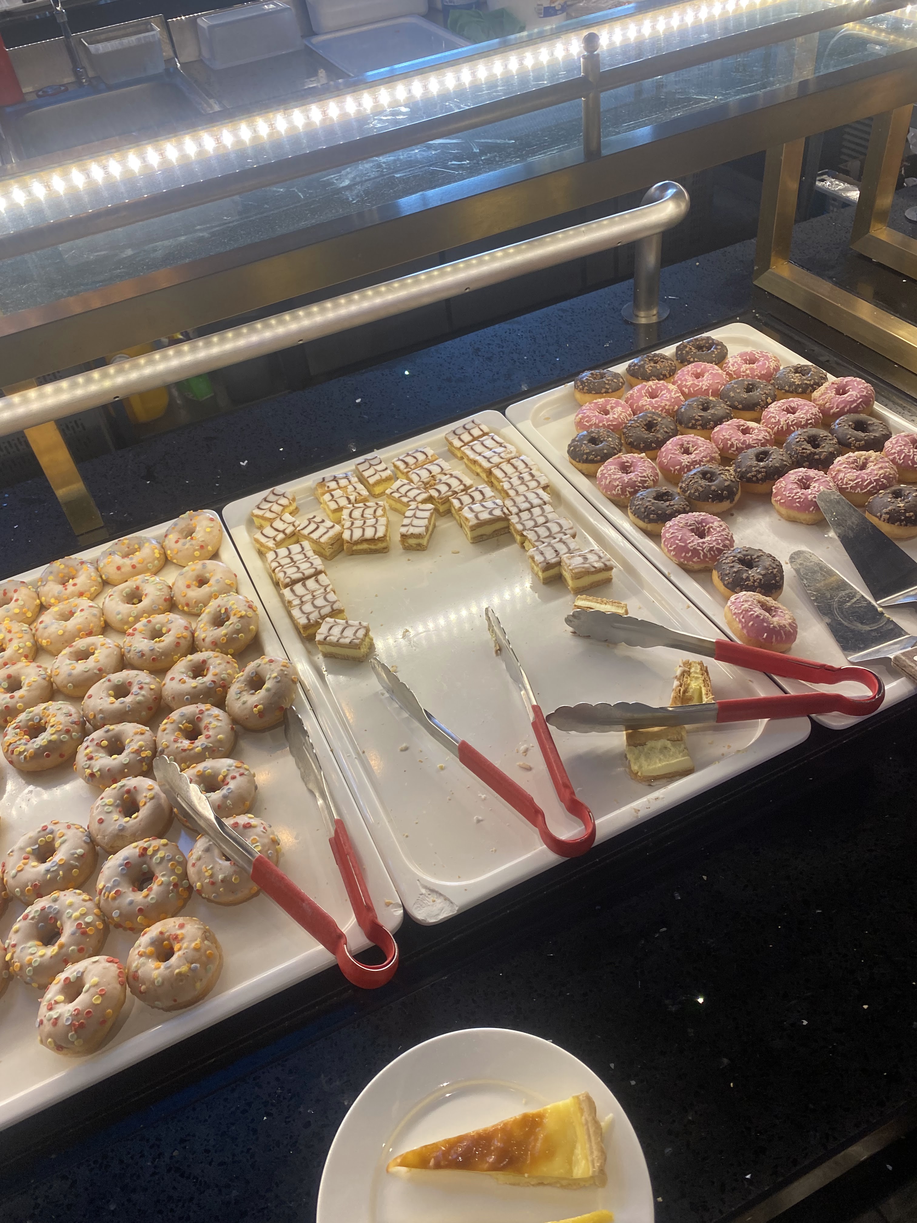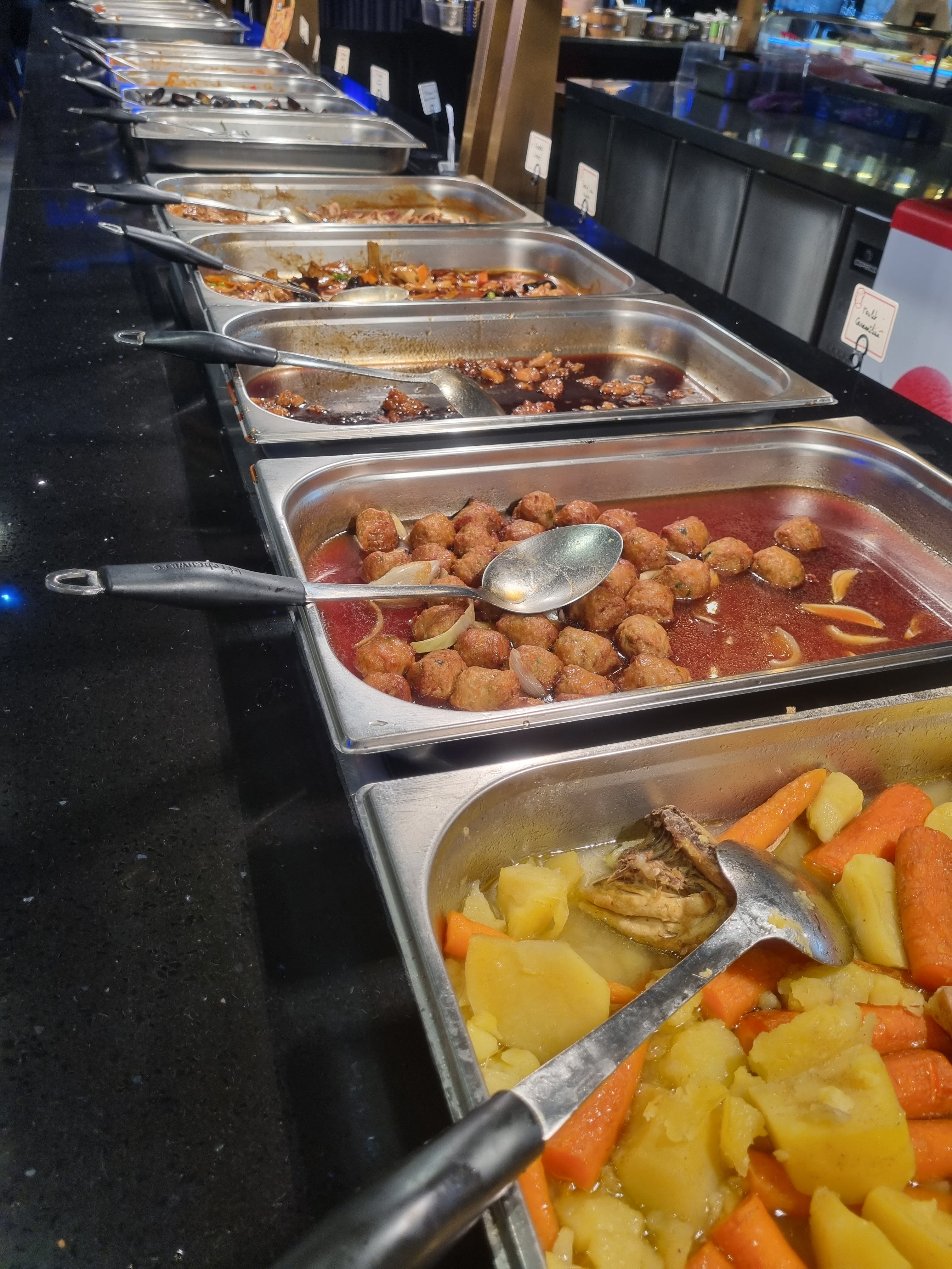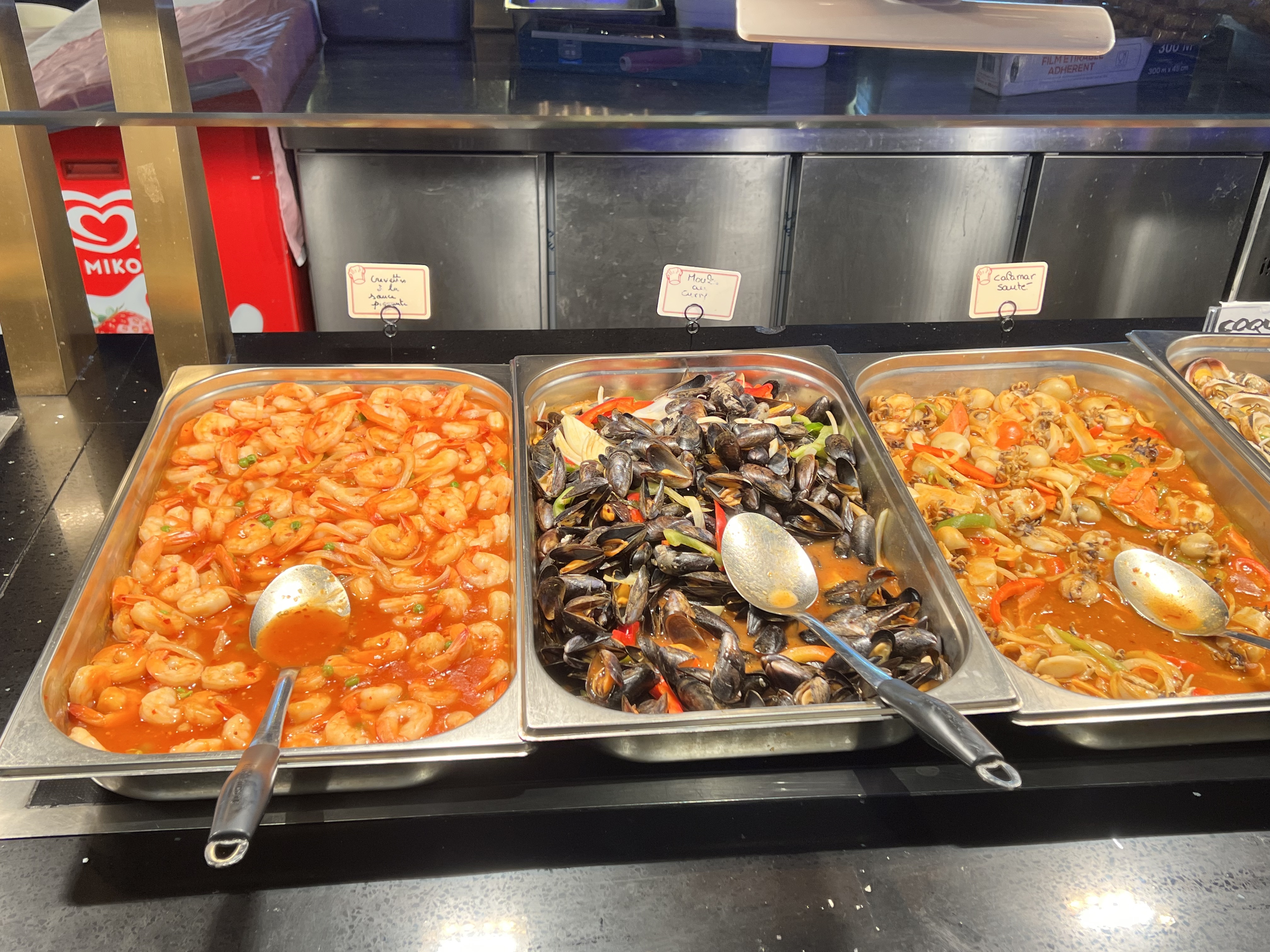 Énormément de choix, tout est bon voir très bon surtout les sushis/California, brochettes, boulettes de poulet ... Il y'a un stand pour faire sauter des aliments cru, ils font des naans fromages et des crêpes sucrées. Ce qui m'a le plus étonné c'est la qualité des desserts : délicieux ! Tartes, perles coco, mousse au chocolat, pannacotta ou gâteaux bref je recommande !