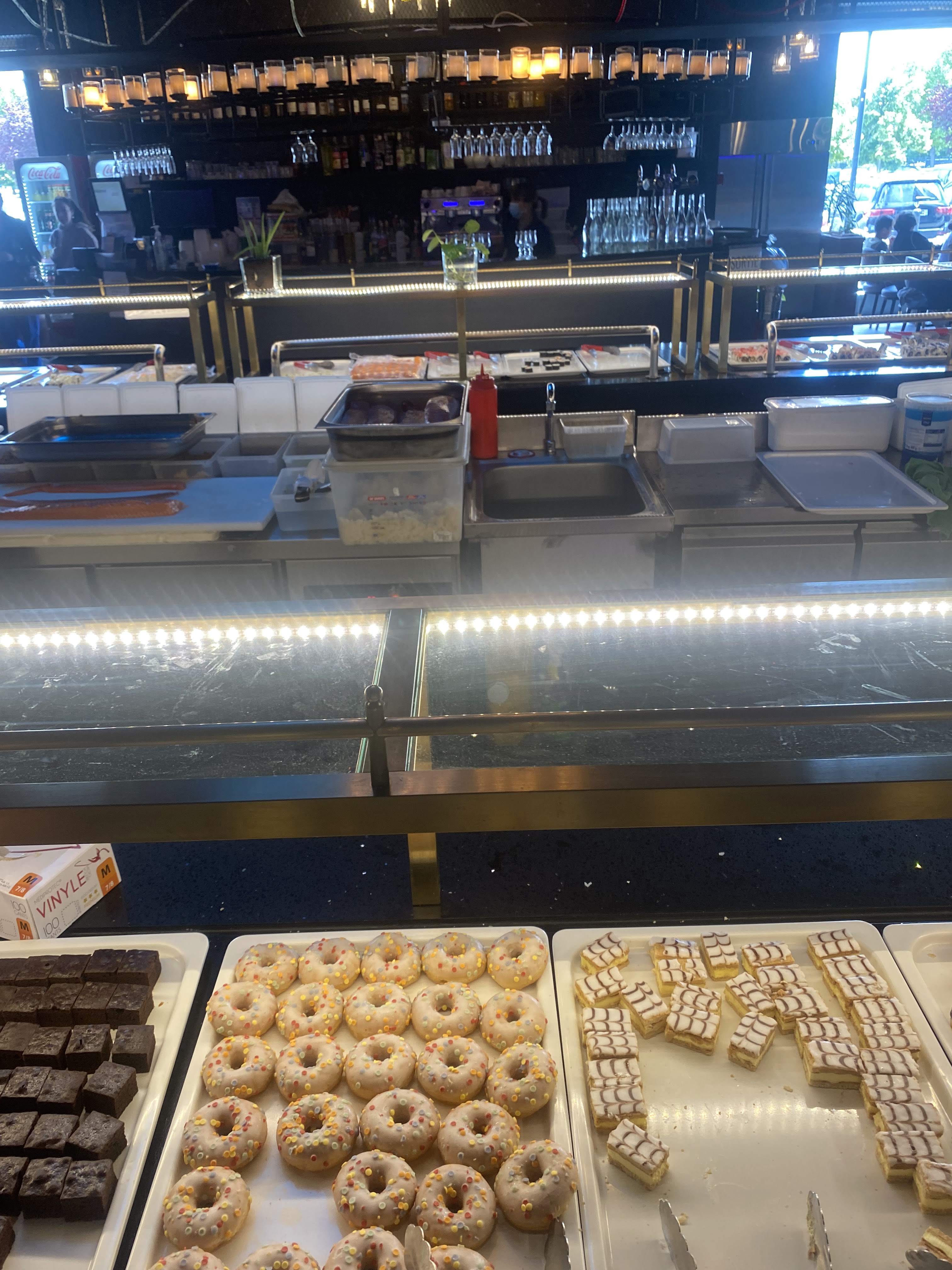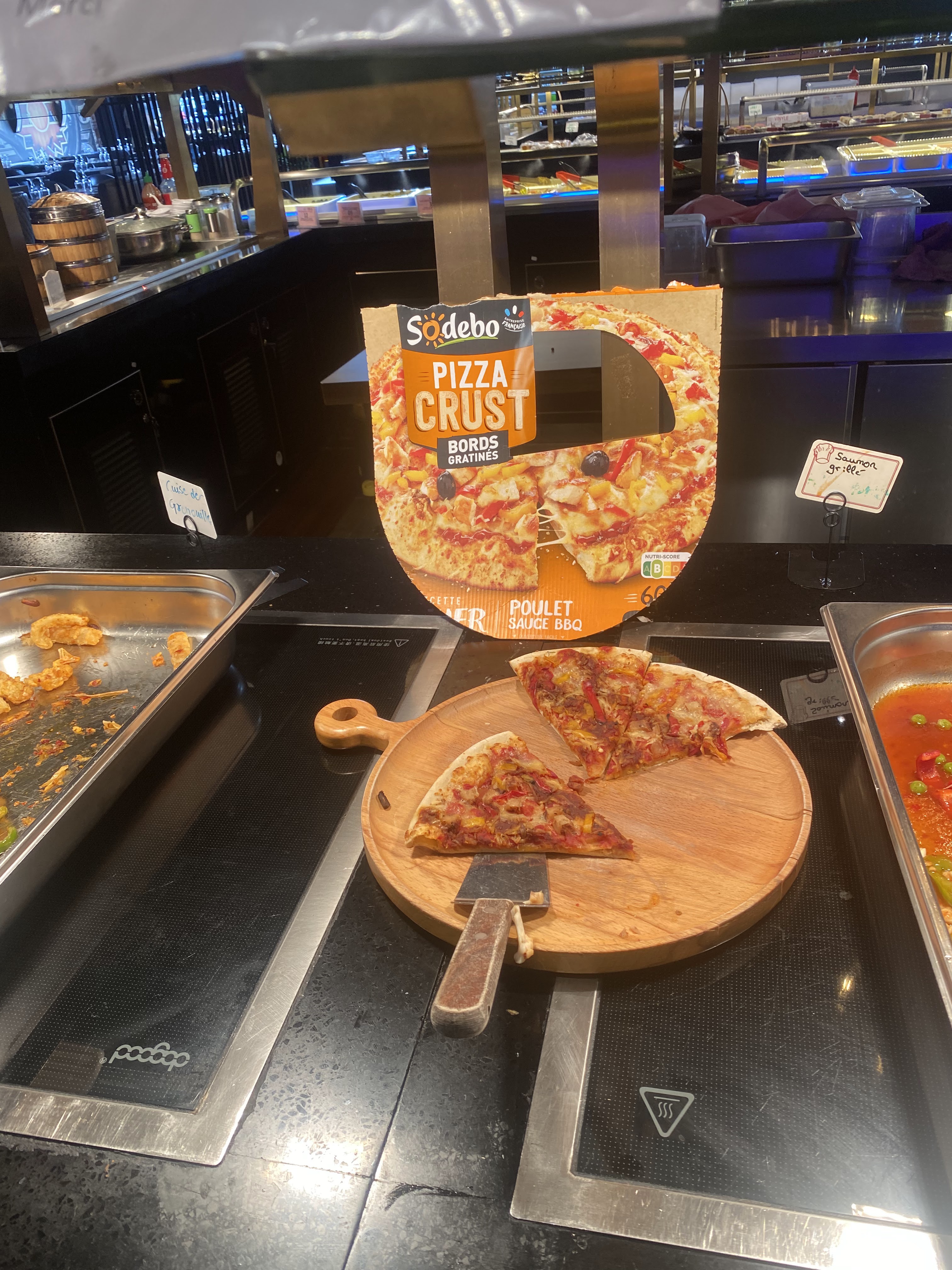Restaurant bien décoré et spacieux. Mais malheureusement très bruyant. Les plats ne sont pas savoureux et ils sont tous froids. Il n'y a qu'un seul micro-ondes pour tout le restaurant (qui est très grand). Le riz des sushis est mauvais. Bien qu'il y ait beaucoup de choix, peu de plats en valent le coup. Heureusement que les perles de cocos achetées sont difficilement rattables. Les cheese naan sont correctes mais manquent un peu de fromage. De plus, certains membres du personnel sont désagréables et peu aimables. Ps : très étrange la pizza sodebo exposée avec son carton (voir photo).