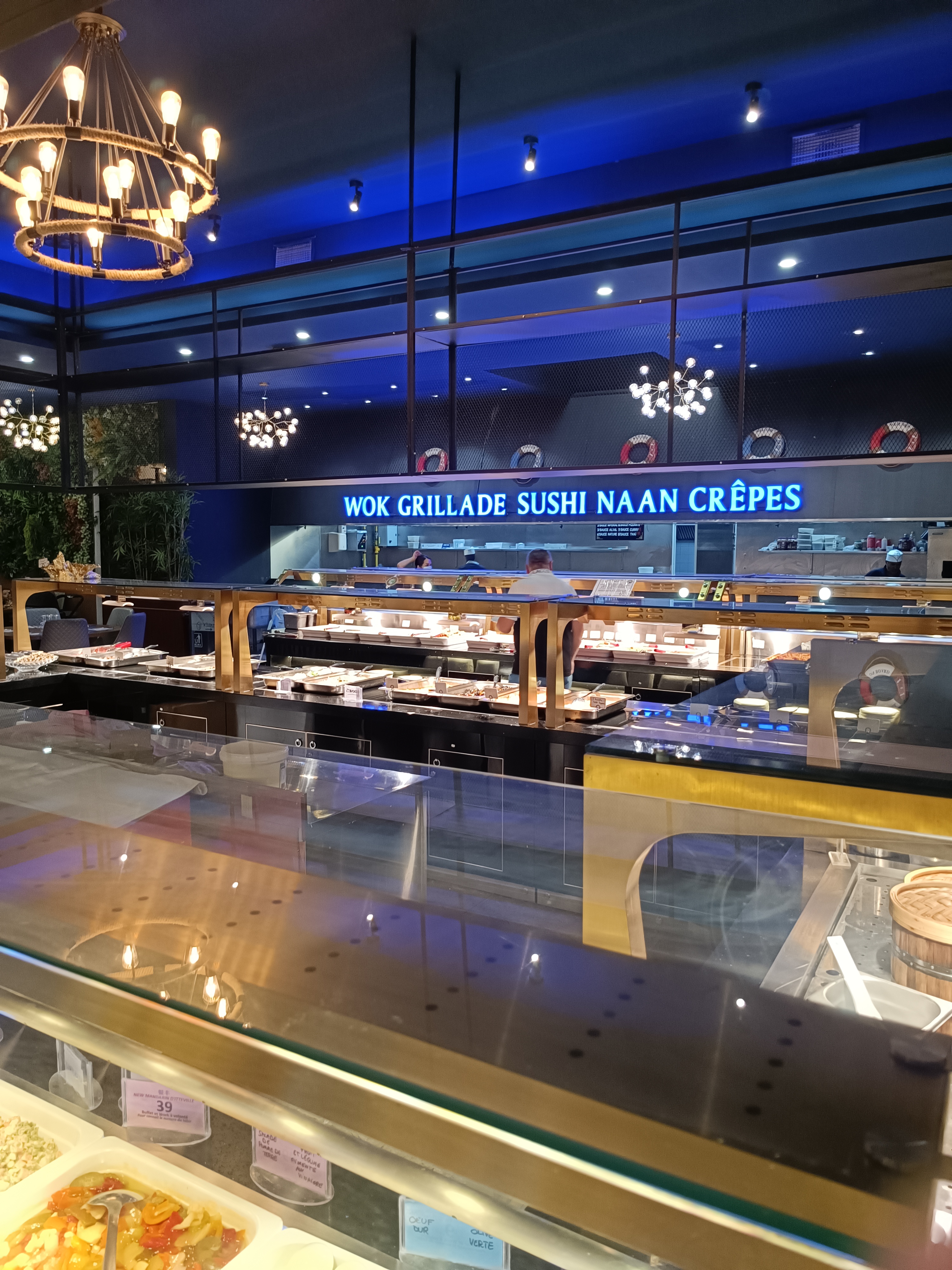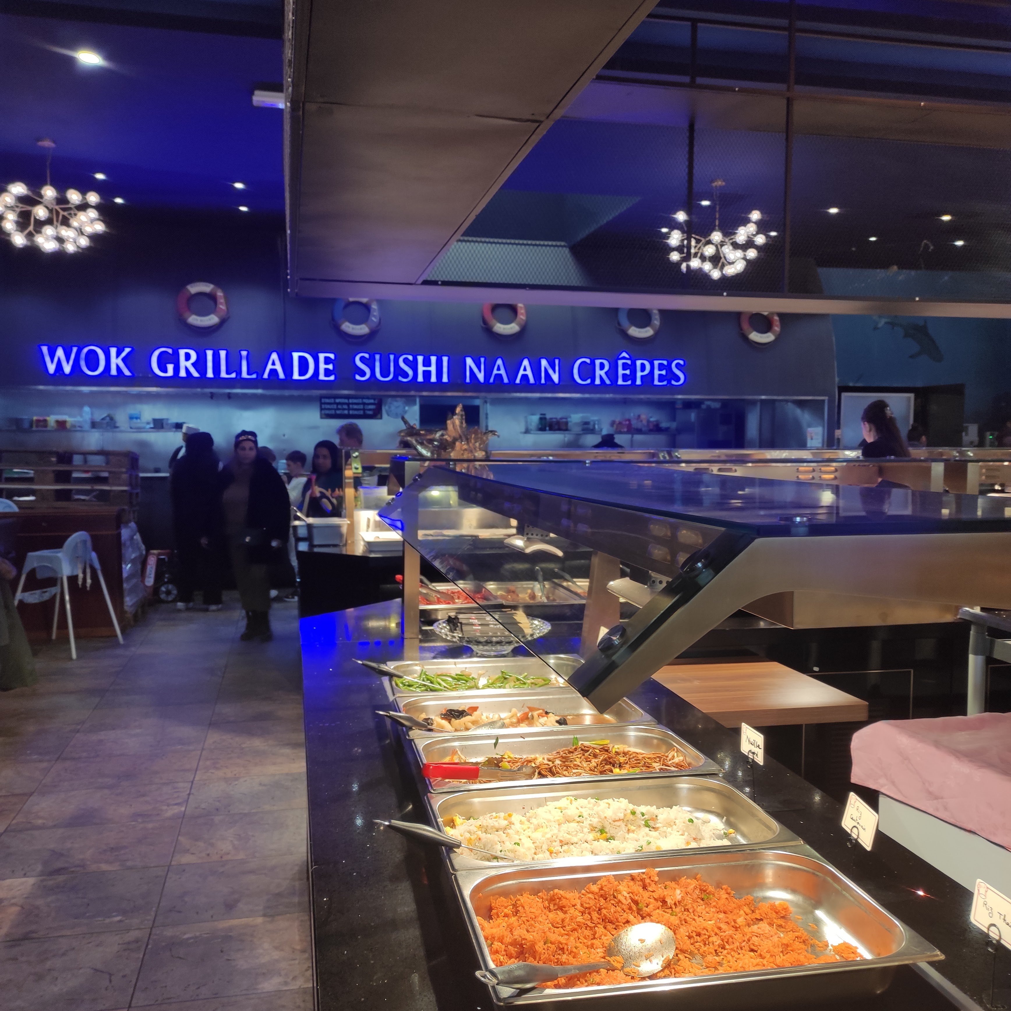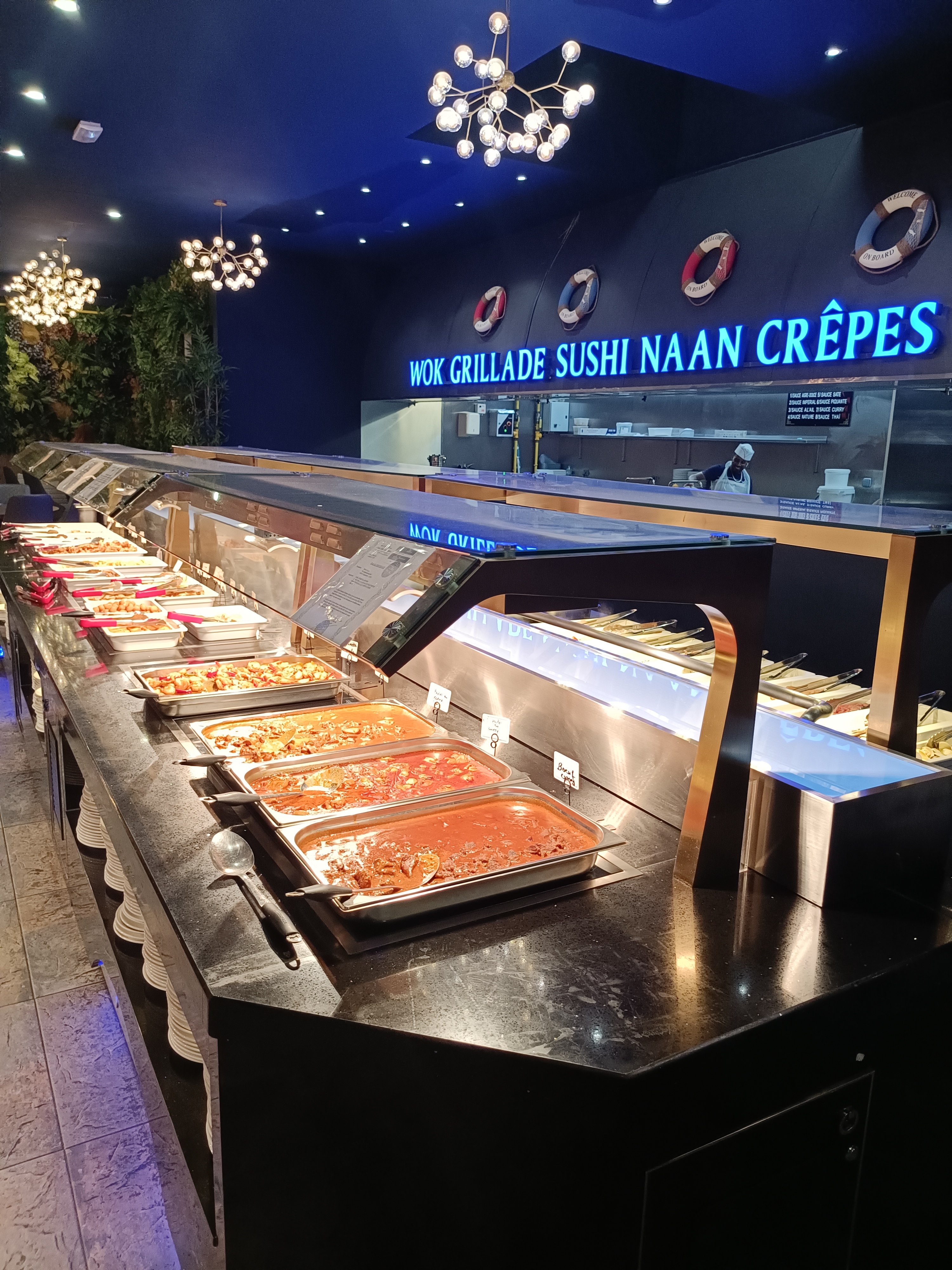 restaurant a volonté très sympathique. les serveurs sont très attentifs et vifs. les cuisiniers au wok sont compétents. l'ambiance maritime de la déco est géniale. les choix sont vraiment divers et variés j'aime beaucoup. seul bémol, les sushis et makis se vident rapidement, donc venez aux heures d'ouverture !