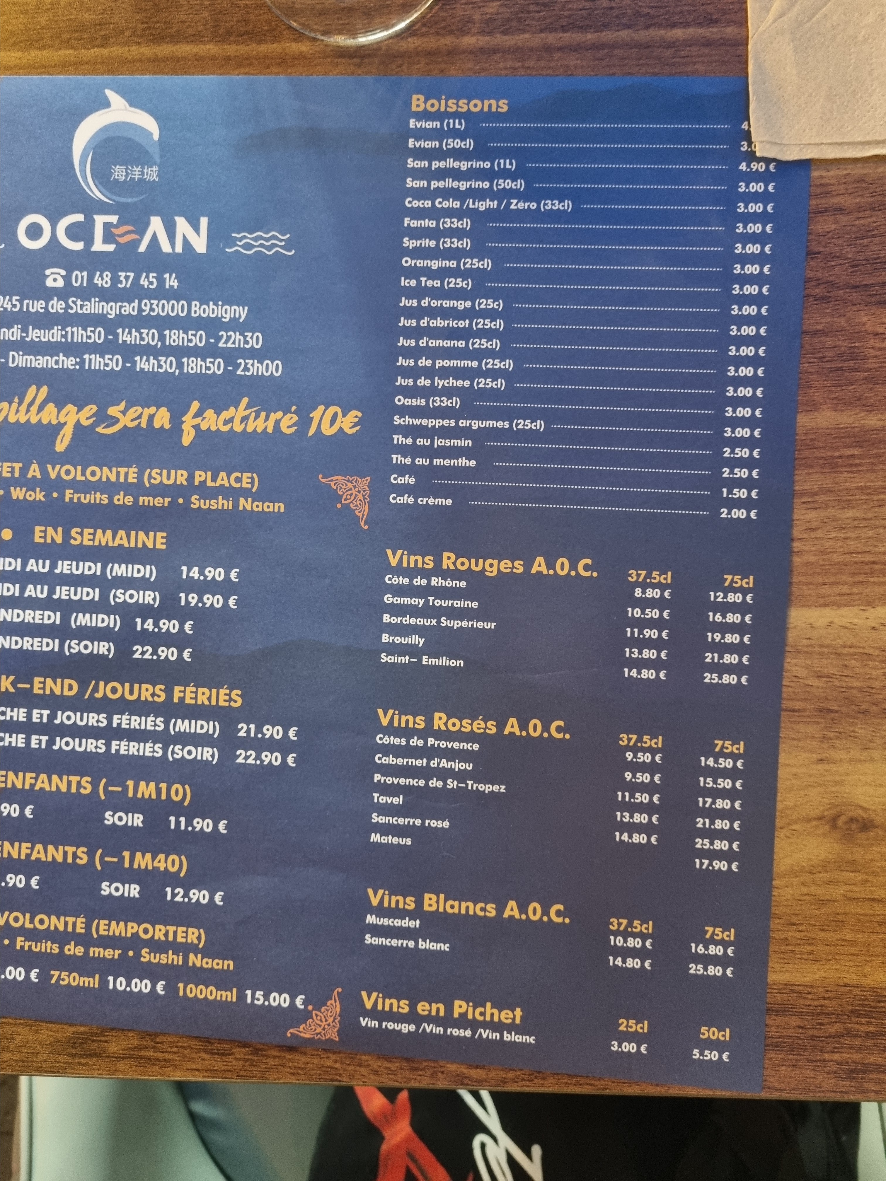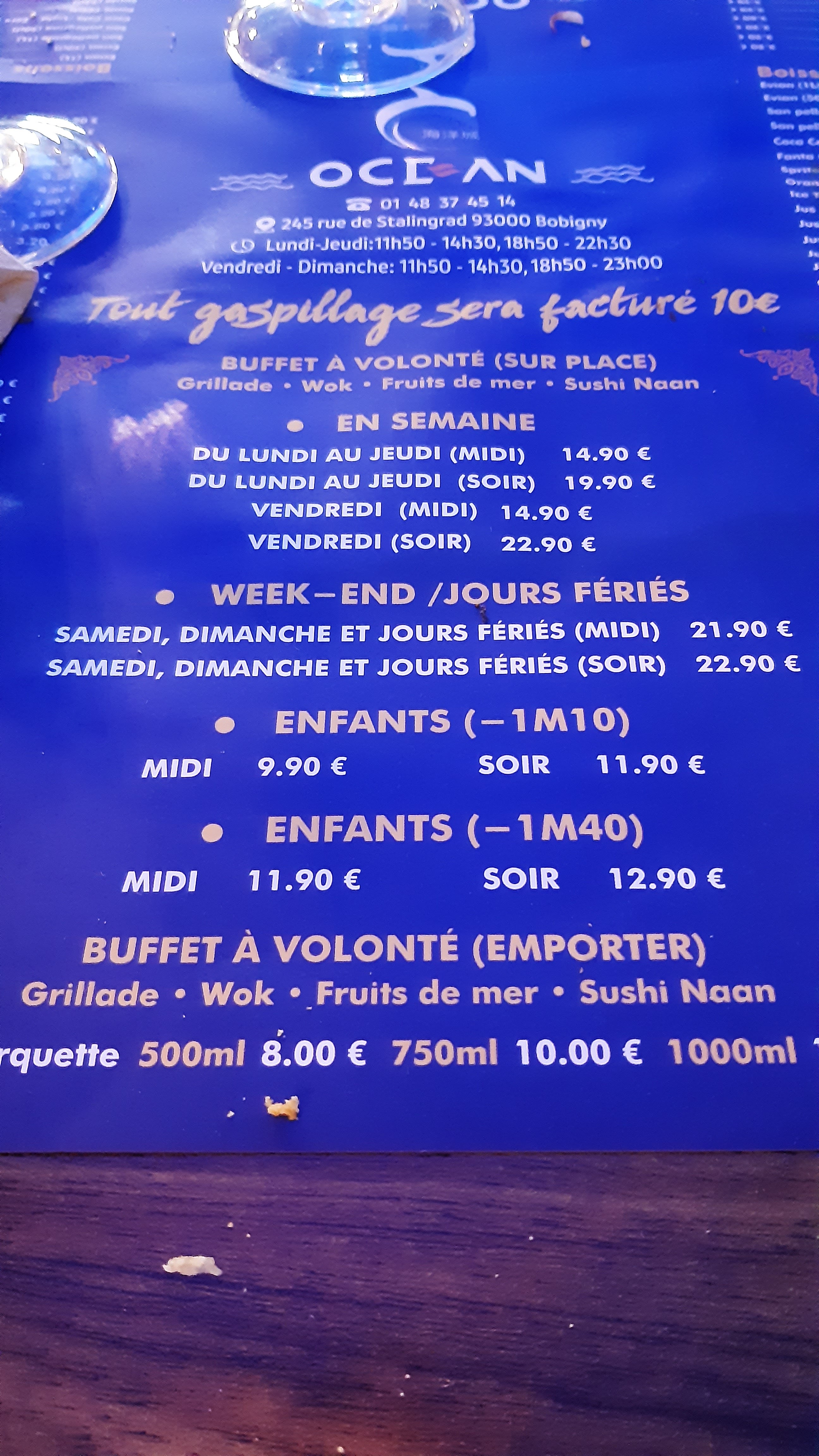 Bonjour, En effet, notre système repose sur la taille de l’enfant et non de l’âge. Le buffet ferme à 14:30 et l’établissement a 15:00 pour le service du midi. Le buffet ferme à 22:30 et l’établissement a 23:00 pour le service du soir. En raison du gaspillage quasi abusif de certains clients, nous avons été contraints d’appliquer cette mesure. Nous sommes navrés de lire votre avis, nous ne souhaitions pas vous stresser. À bientôt, nous l’espérons, L’équipe Océan