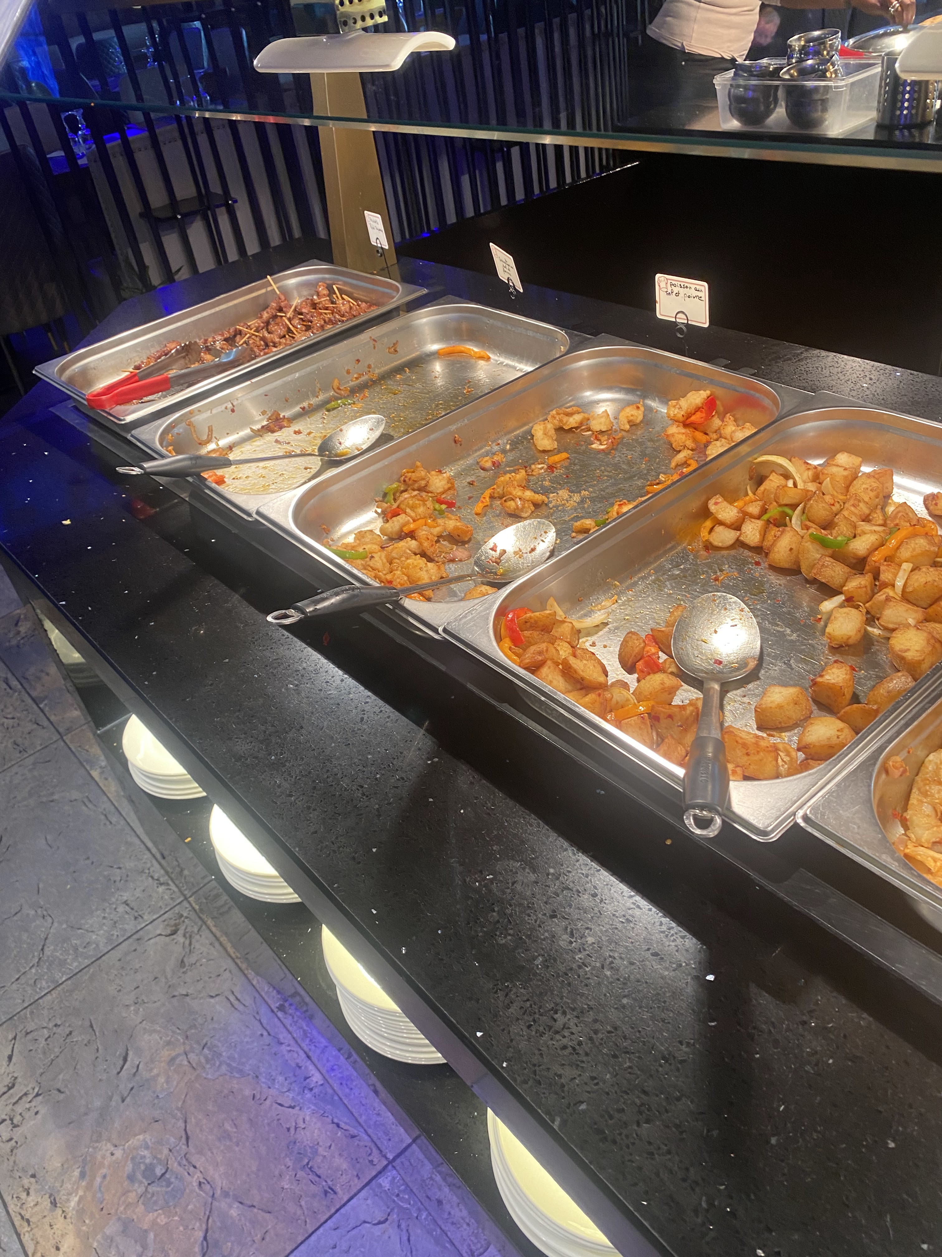 De passage à Paris nous avons voulu tester ce restaurant. Nous avons dû payer en avance ce que je comprends mais malheureusement nous sommes arrivé à 20h30 il n’y avait déjà plus grand-chose à manger le côté indien était vide , sushi pareil le peu de plat qui restait était très froid et malheureusement n’était pas à mon goût ni au personne qui m’accompagnait, les desserts aussi était vide. Nous avons parler au responsable de l’incident qui nous a toute fois offert 5 cannettes le geste commercial était appréciable mais payer 125€ pour 5 personnes et n’être satisfait que des canettes je trouve ça désolant et dommage l’expérience culinaire dans ce restaurant a été plus que décevant pour ma famille et moi.