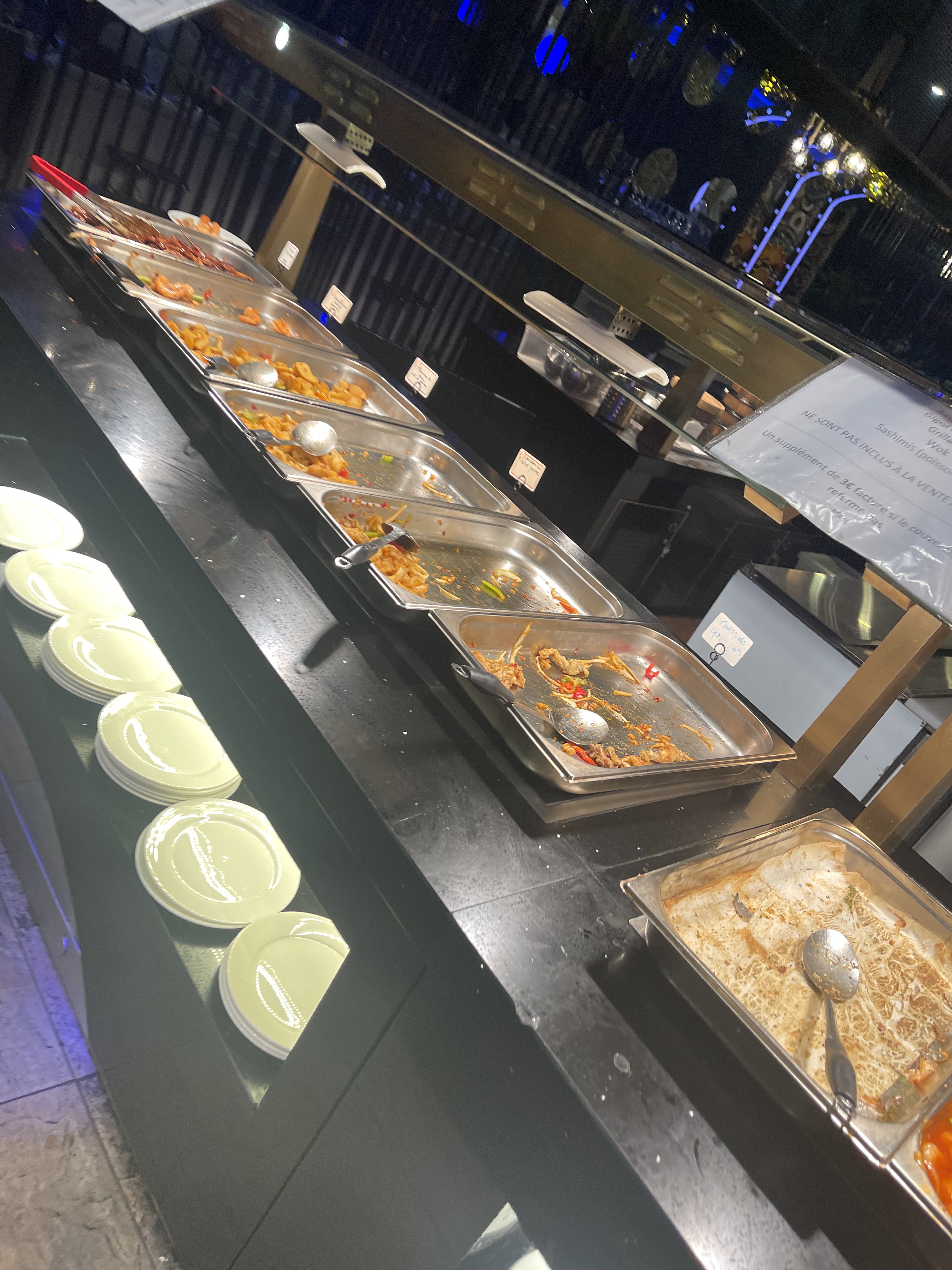 Nous sommes arrivée a 3 personnes a 21h15, la plupart des plats été déjà vides et froids. Nous n'avons pas eu de dessert, la nourriture étaient froides et pas bon. Un personnel pas sympathique. Manque de nourriture et trop cher pour ce que c'est. C'est du vol !!!
