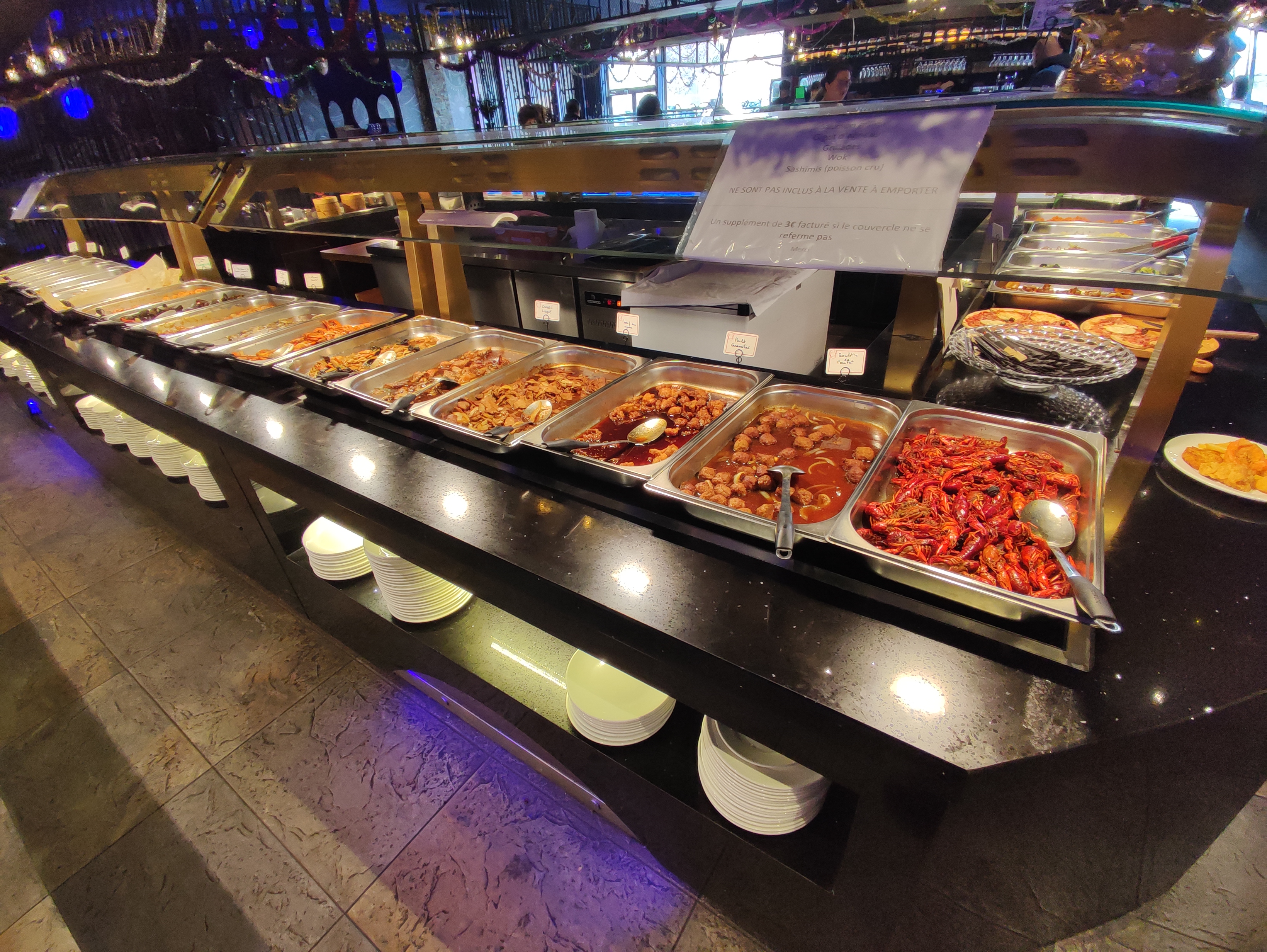 Première fois où je vais dans un restaurant buffet à volonté ( ou autre) où on paye avant de manger( attente assez longue pour passer en caisse) , dans les autre restaurant le prix enfant c est jusqu'à 10 ans ici on mesure votre enfant même si il a 8 ans si il mesure plus de 140 cm (et il vérifie).il paye le tarif adulte un adulte qui mesure moin de 140cm sera considéré enfant?. La certification hallal pour la viande n'est pas française (italienne...), pour le poulet c est du volaven ( mosquée Évry courcouronne). Le buffet, 90% des sushi sont au surimi le saumon presque inexistant ( buffet sushi presque vide depuis 12h30), le chease nan manque de fromage presque pas présent. Le pauvre monsieur qui gère le wook devait aussi gérer les grillades malgré le monde. On nous a tassé dans une table ou je devais me lever à chaque fois pour que les gens dans le banc s assoit bref ce qui est sûr c'est que je reviendrai plus.
