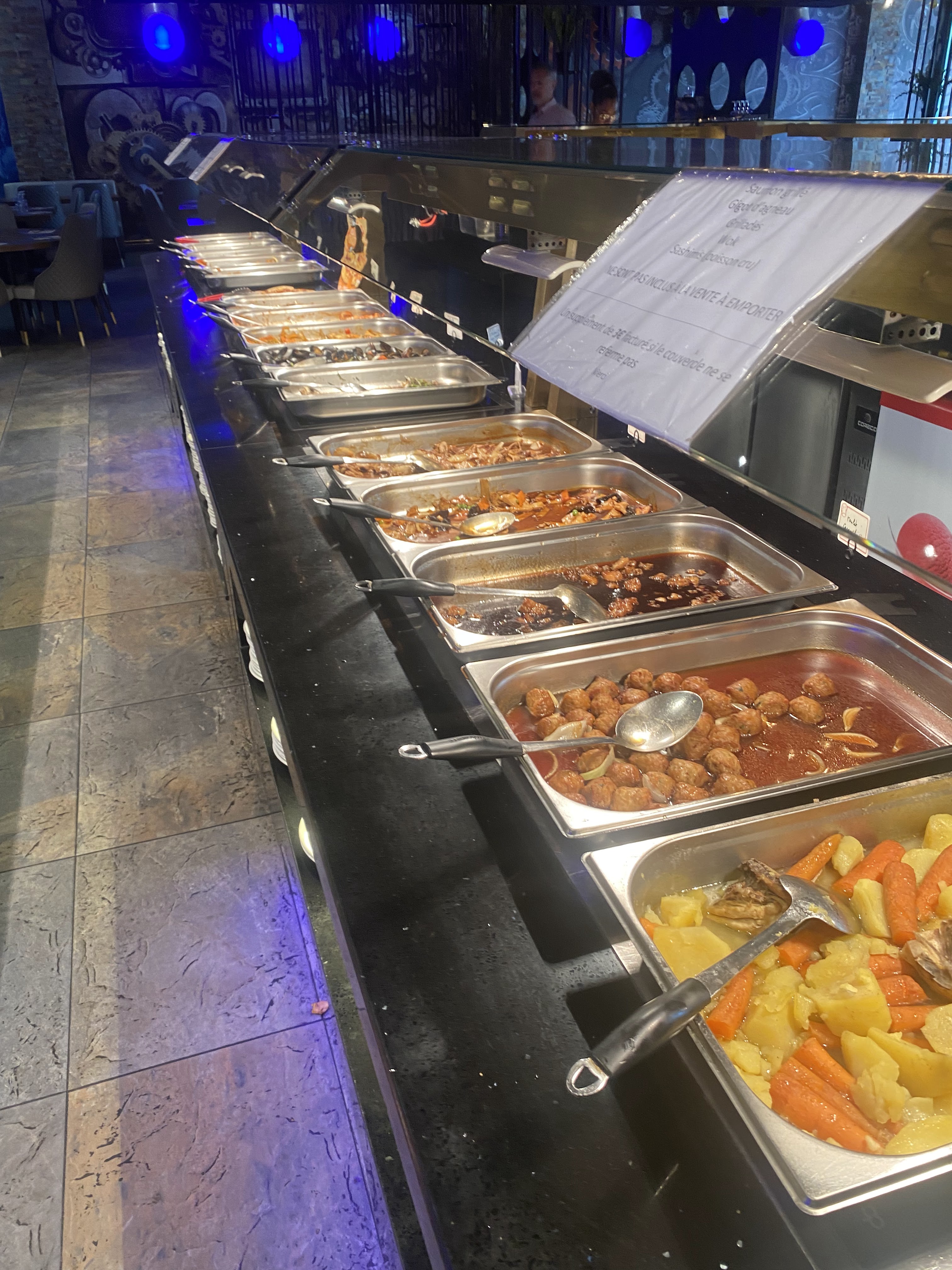 Je trouve les prix plutôt élevés à la qualité qu’il propose y’a que le bar à salade que je trouve intéressant le reste aucun goût, les desserts en laisse même plus le temps de décongeler limite en y arrive pas à manger, les règles d’hygiène absente bon bref c’est un buffet koi
