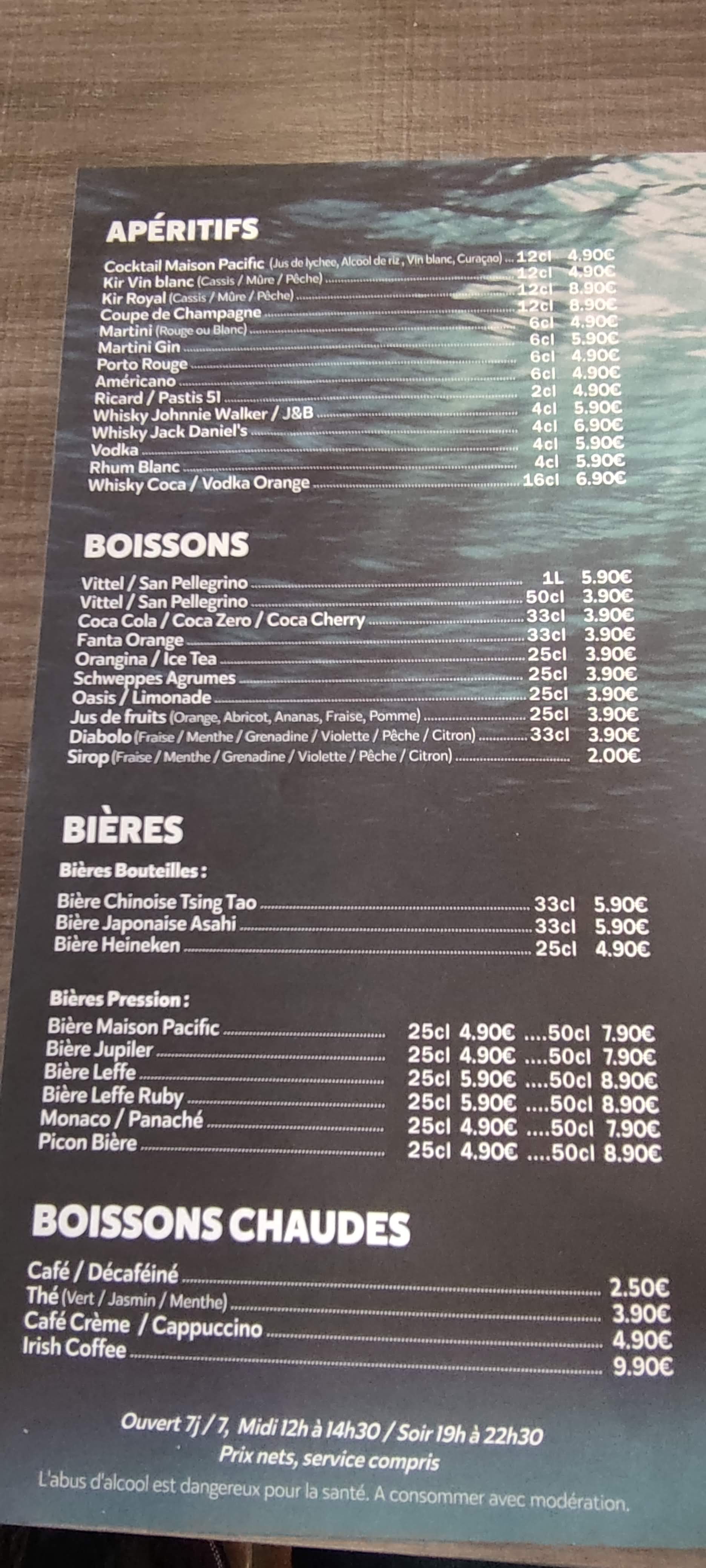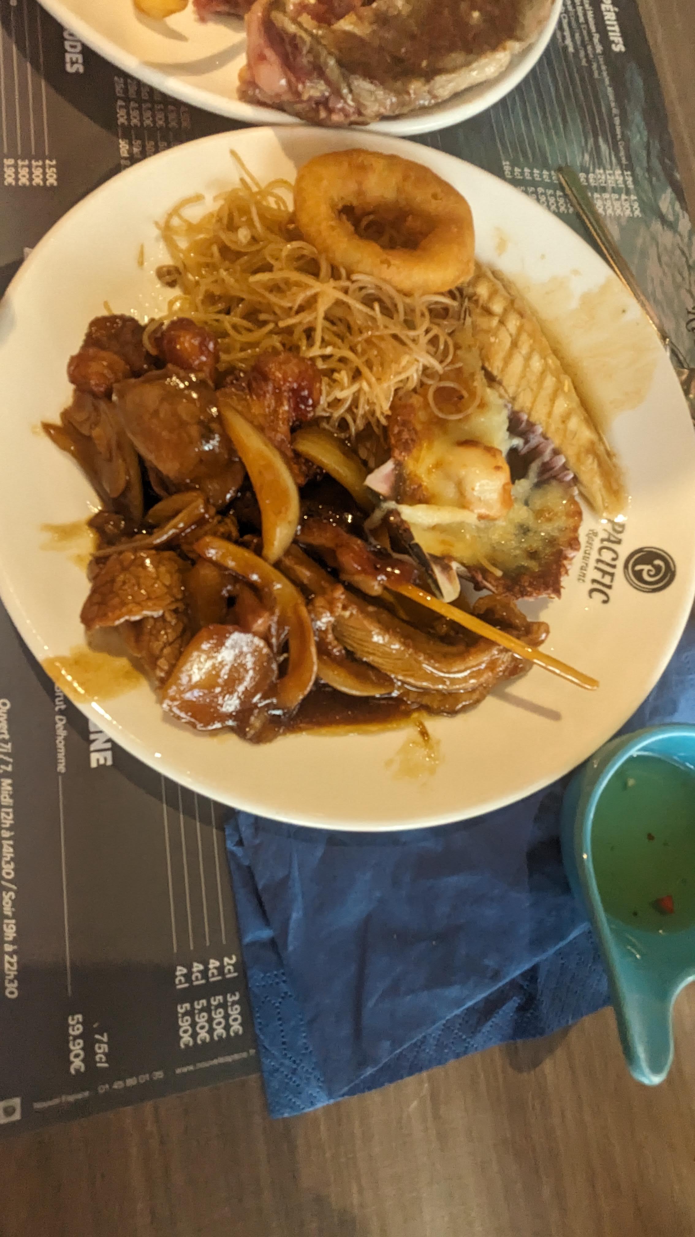 Bonjour , bonsoir cela dépend l’heure à la quel vous verrez ce commentaire . Je tien à dire très beau restaurant avec beaucoup de place assise avec un très grand buffet à multiple choix je ne savais plus où donner de la tête mais je tenais à souligner mon avis sur la nourriture bonne les premières heures où je consommer mais par la suite ce n’est pas un plaisir pour le ventre , certes je suis un grand mangeur mais même en ingurgitant beaucoup de nourriture je ne ressent jamais ce mal de ventre qui viens nuire à ma bonne humeur et ma joie de vivre . Je me demande bien comment est préparer cette nourriture. Donc c’est dans l’immense regret que je vous annonce aujourd’hui ma rupture avec le Pacific je n’y metterais plus les pieds pour le bien être de mon estomac merci de votre compréhension