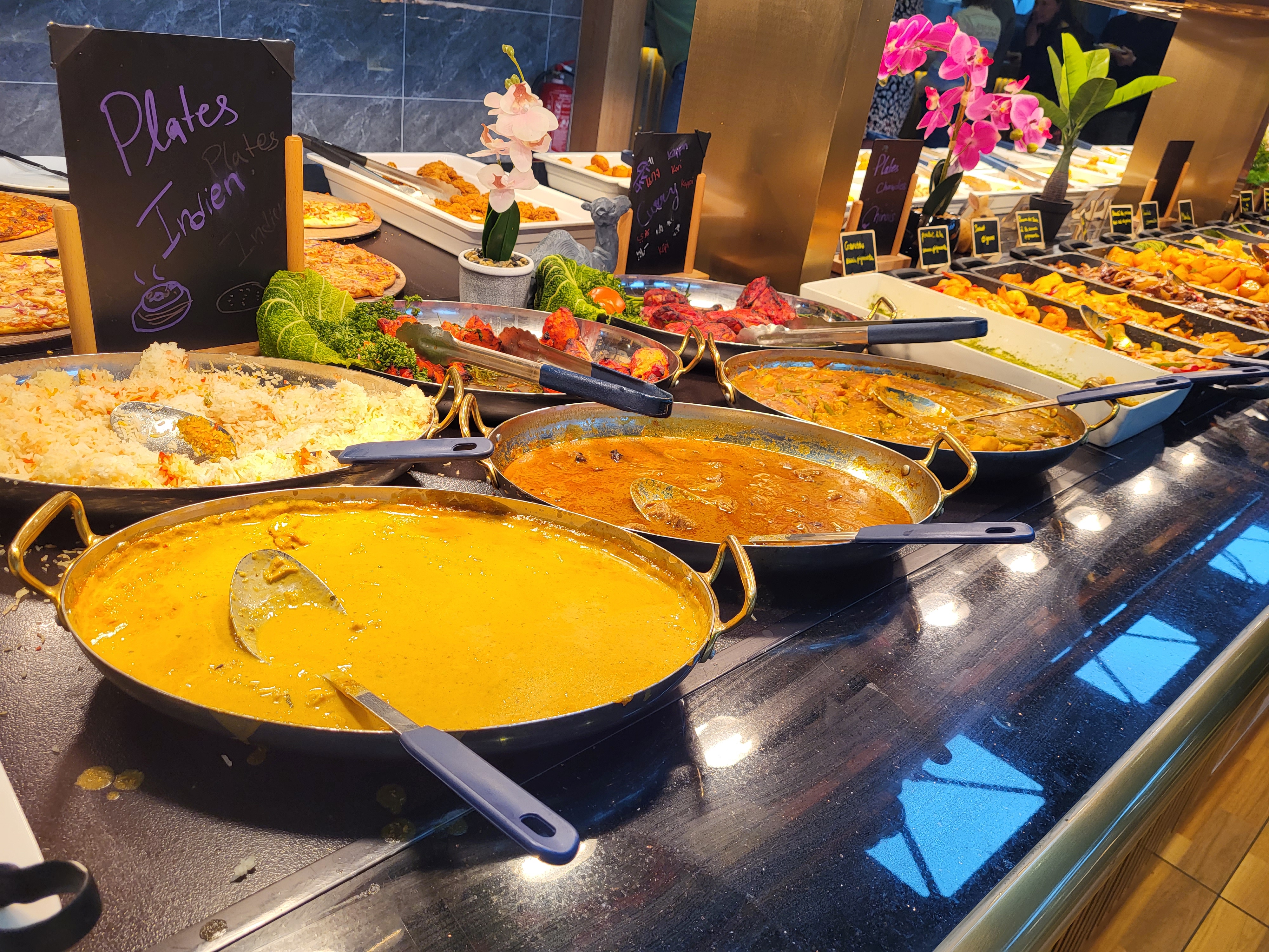 Grand choix pour composer son entrée à base de crustacés, sushis, crudités. Quant au plat, possibilité de créer son wok, choisir un naan, cuisine variée indienne, chinoise, etc... Pour les desserts, plateau de fromages, de nombreux fruits frais, mignardises, bonbons...