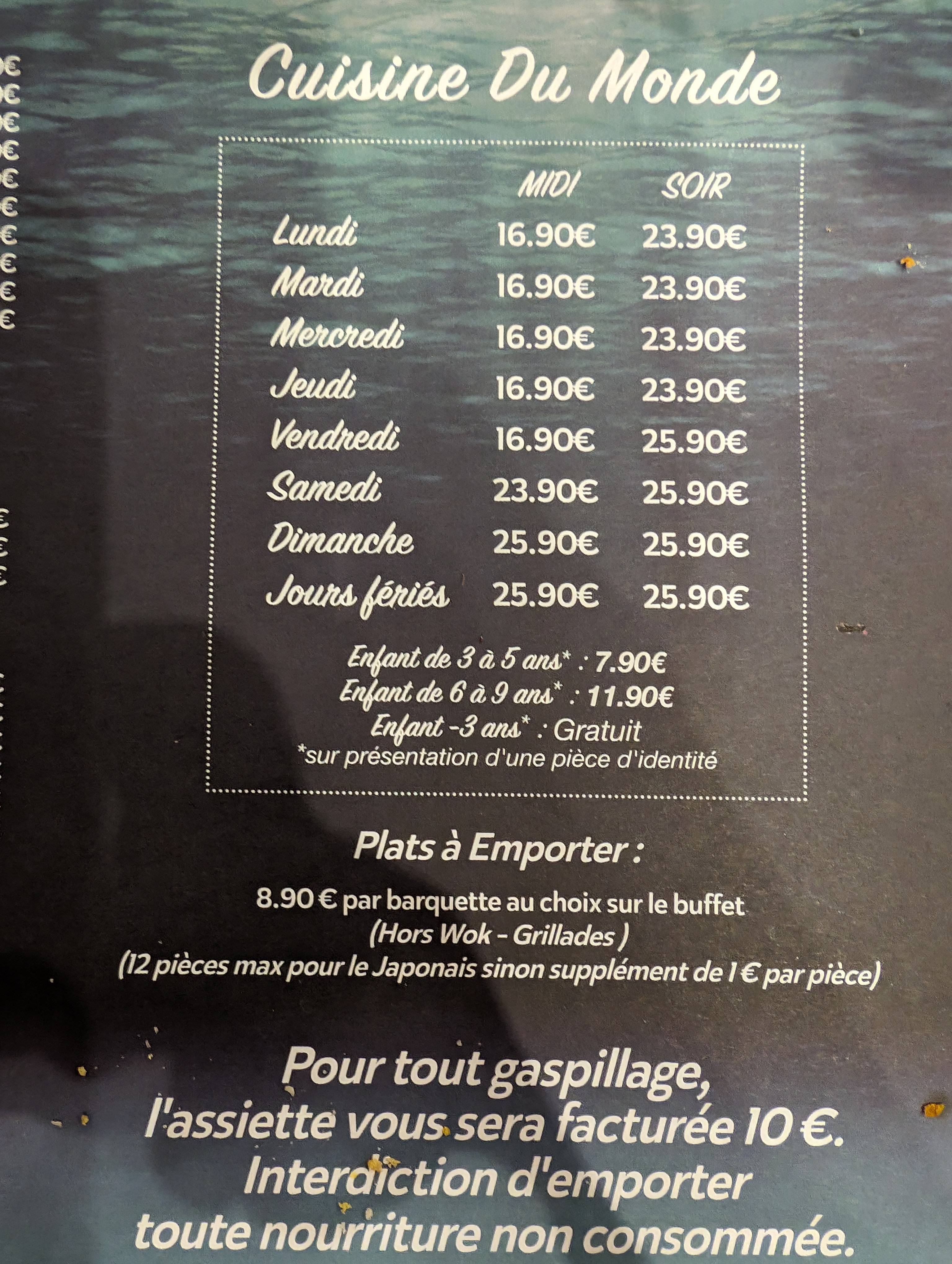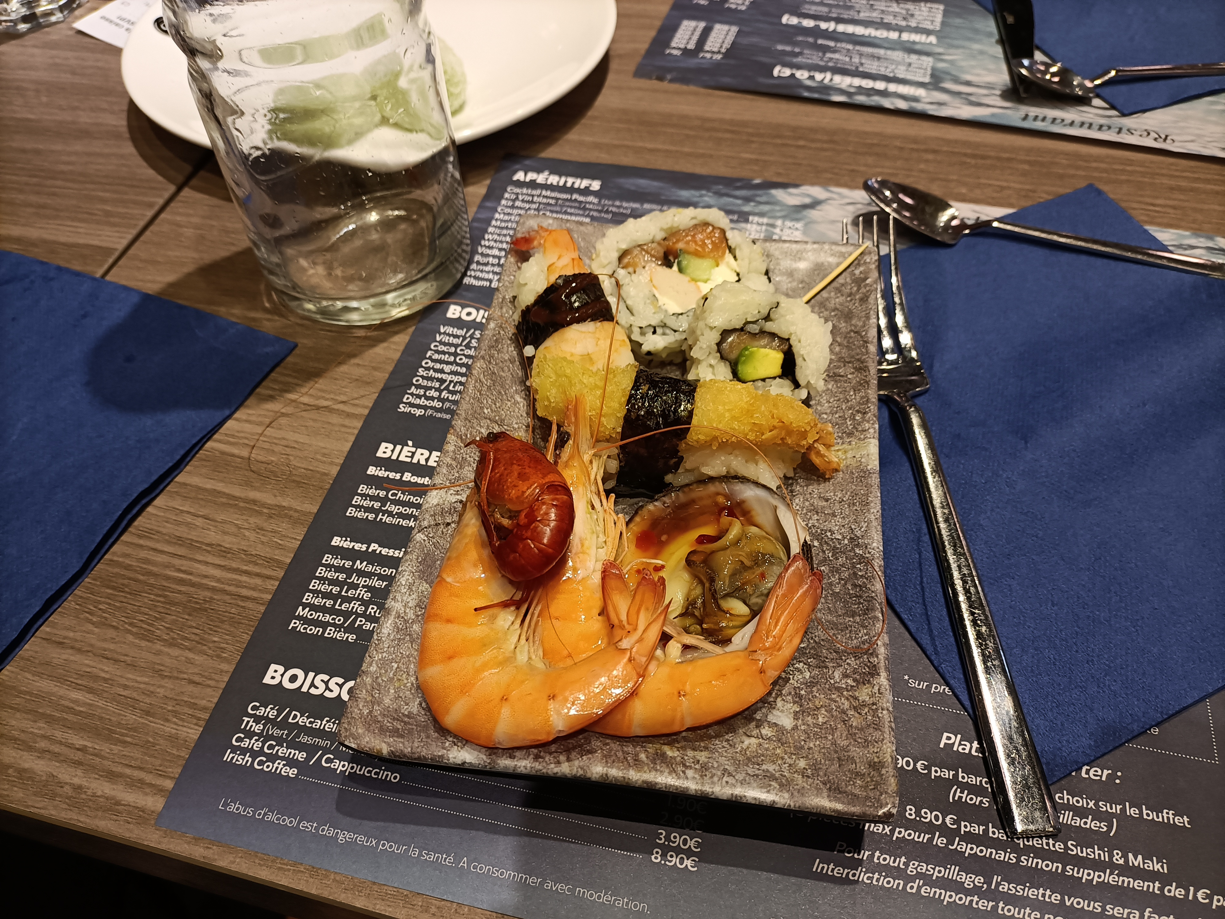 Très belle découverte. Restaurant au concept buffet à volonté. Il est selon moi l'un des meilleurs restaurants à volonté de la region. Vous trouverez énormément de choses. Les tarifs sont dans la moyenne des restos à volonté. Dans ce restaurant vous aurez l'habituel buffet froid avec de la salade, de la charcuterie avec du jambon sec que vous pourrez trancher vous même, les fruits de mer avec des pattes et pinces de crabe. Vous trouverez également des plats asiatiques et vous avez également un stand sushi. Et ce n'est pas tout, vous aurez droit aussi à des bons plats typiquement français, un buffet qu'avec des plats de poisson, un coin pizza, et l'incontournable grillades et wok. Mais ce n'est pas fini car il y a aussi un stand naan et cheese naan fait en direct. Et pour couronner le tout vous avez un buffet de dessert monstrueux, un buffet de fromage et de fruits mais surtout un stand de crêpes. Pour ma part, après avoir fait énormément de restaurants à volonté. Celui-là se situe dans mon top 3. Et petite cerise sur le gâteau, la décoration du restaurant et magnifique, entre un décor de bateau et un bout du Japon, vous aurez droit à un coin spécialement décoré One piece. Aussi prévoyez d'arriver tôt car il y a énormément de monde, et vous risquez de faire la queue des fois pendant une bonne heure. Seuls bémols le restaurant est bruyant et attire énormément de jeunes plus ou moins respectueux le vendredi et samedi soir... Si vous devez emmener ou inviter des personnes plus âgées prévoyez plutôt en semaine...