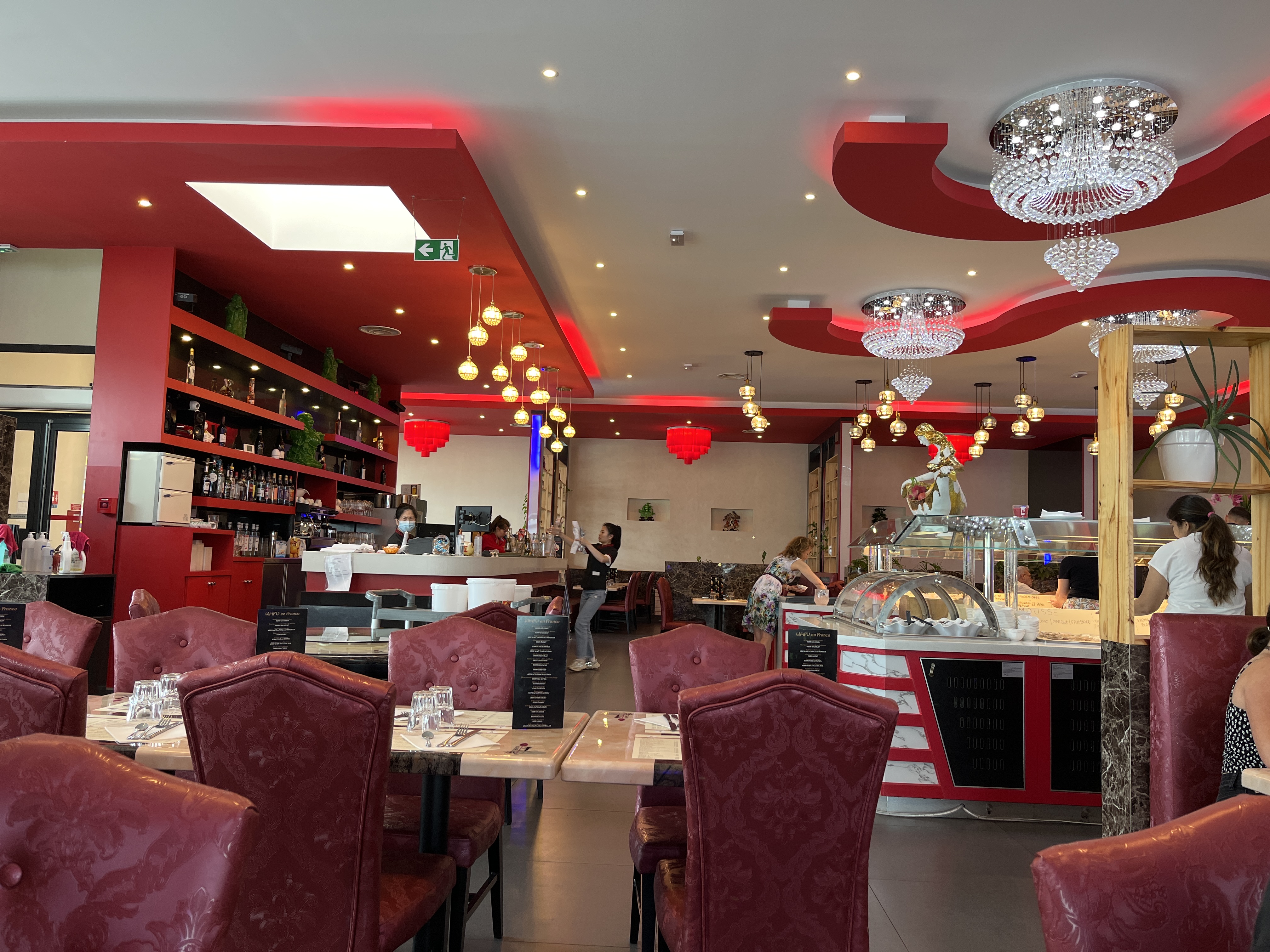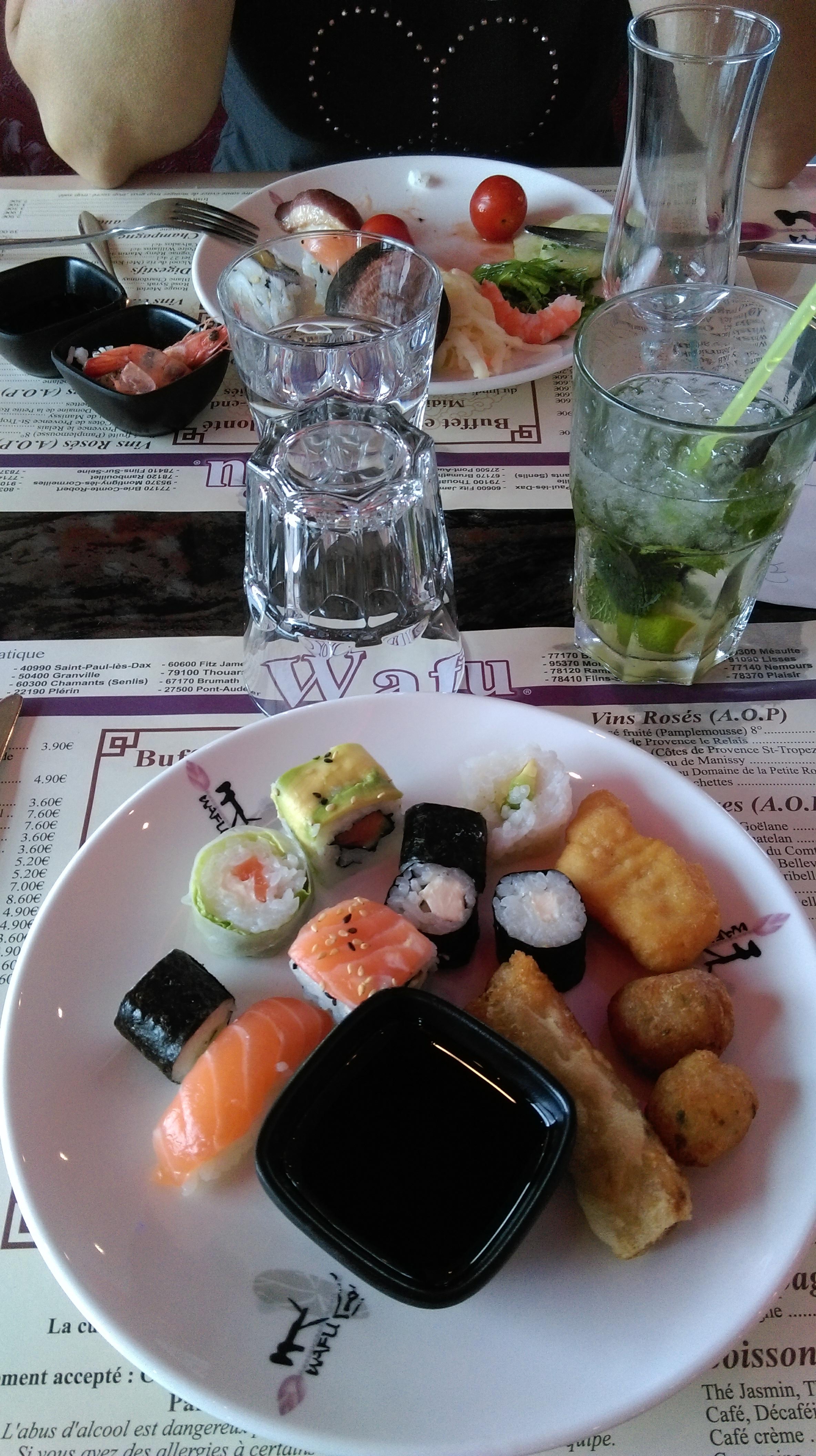 Le restaurant est très beau. La nourriture y est très variée, en quantité, et de très bonne qualité. Très large choix d'entrées : charcuterie, crudités, rillettes ... Buffet de sushis assez bien garni, et très bons. L'offre des plats est très grande : pinces de crabe, rouleaux de printemps, canard laqué, poulet curry, crevettes sauce piquante ... Vous pourrez choisir entre beaucoup de desserts : beaucoup de sortes de tartes, buffet de glaces, crêpes, verrines en tout genre (tiramisu, mousses, îles flottantes, crème anglaise ...) Un large choix de sauces est disponible. Buffet de fruits de mer, buffet de viandes (nous pouvons choisir le morceau de viande et le faire faire cuire selon nos goûts). Chips de crevette (il me semble) offerte à l'arrivée. A la fin du repas on vous propose du saké et des serviettes humides chaudes très agréable. Nous regretterons cependant le fait que dès lors que votre assiette est vide on vous la retire très rapidement ... ainsi que quand on commande de l'eau on ne nous la délivre pas si on n'insiste pas plusieurs fois, par contre les boissons payantes sont données de suite ... Nous avons été étonnés de la différence des prix pour le buffet à volonté : 12,90€ la semaine, 19€ le week end, jours fériés et le soir. Sinon absolument rien à redire, je recommande.