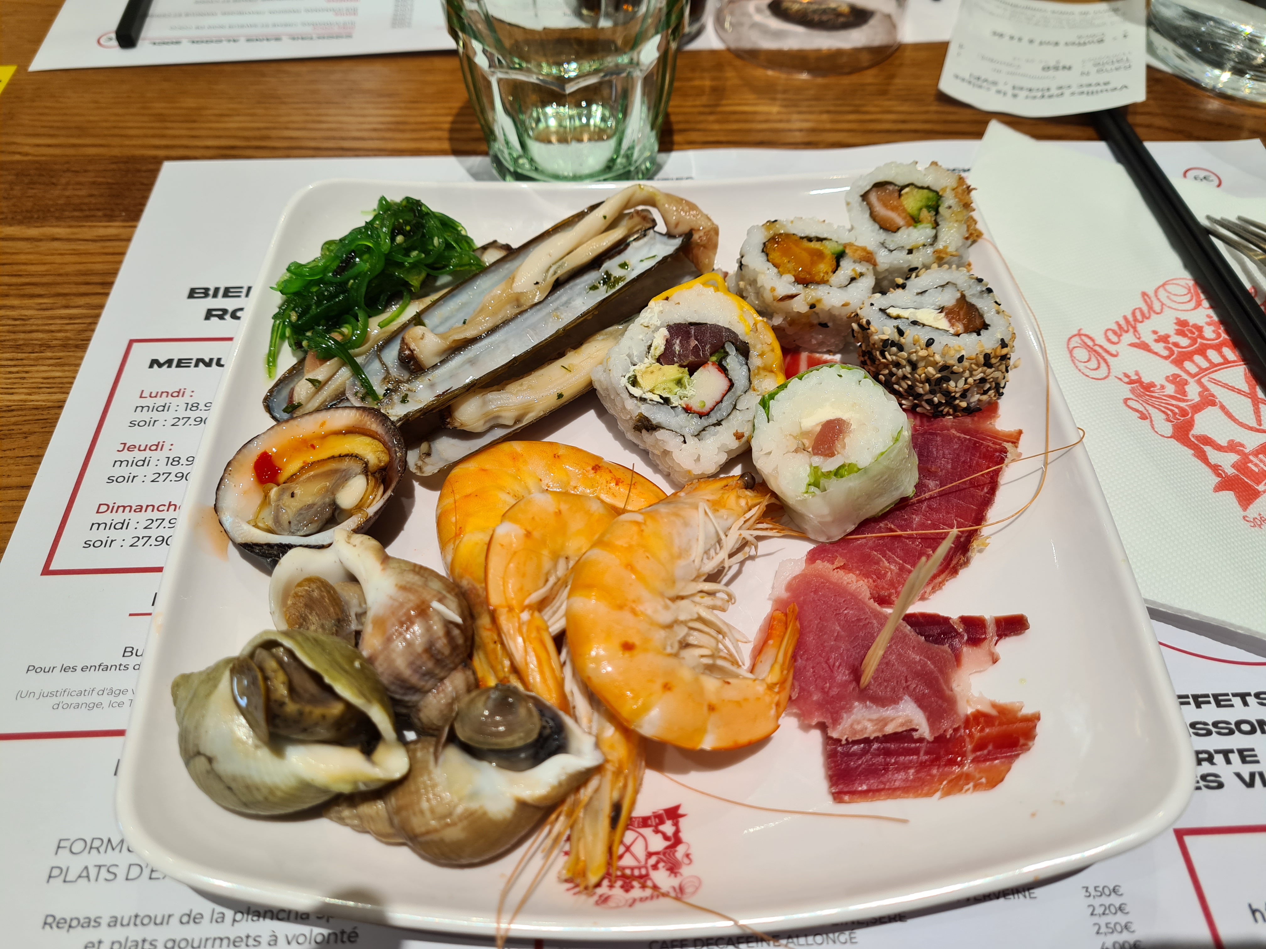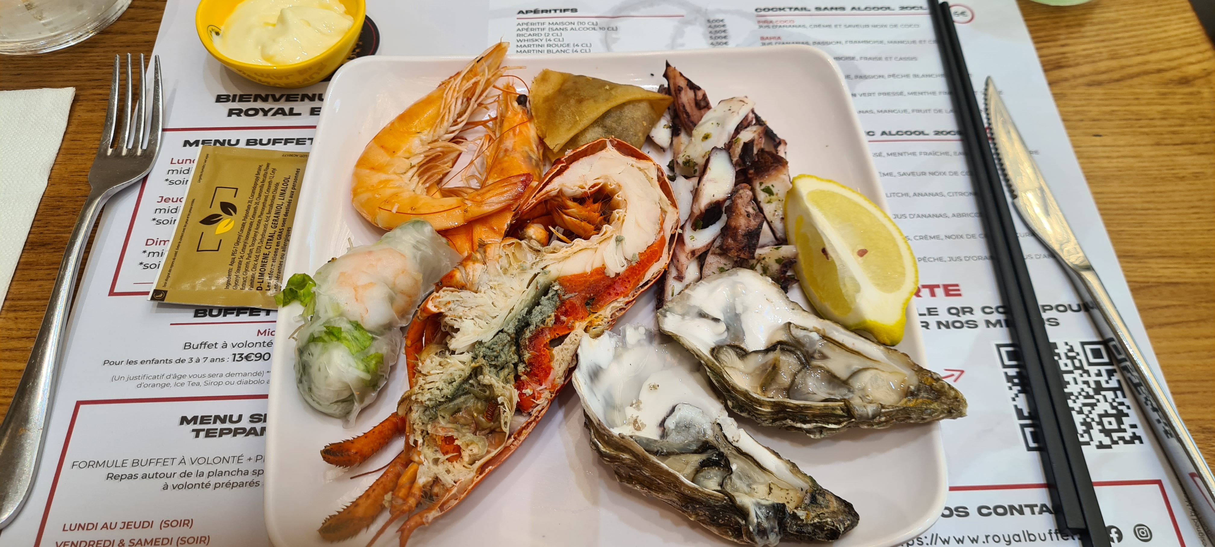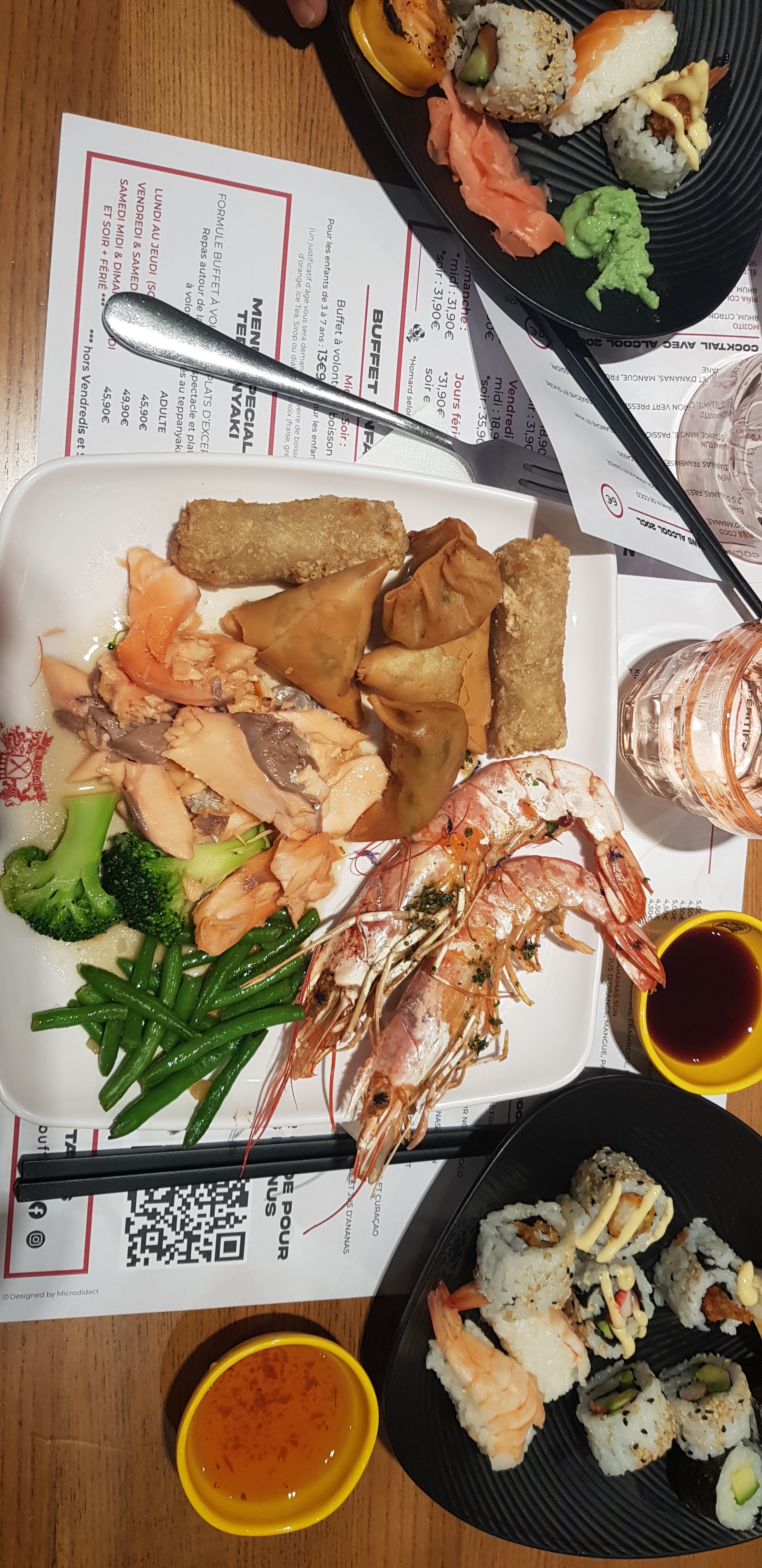 La déco est vraiment top et neuve en plus. Un effort a été fait sur les plafonds afin de limiter le bruit, la salle étant immense. Il vaut mieux venir tôt, dès 19h00, afin d'éviter la queue interminable qui vite se forme dès 19h30. Le parking est plutôt petit et partagé avec le supermarché d'a coté, qui lui ferme à 19h00. Sympa, les petits robots qui se déplacent pour amener les boissons, cela fait toujours son petit effet. Bon après, on trouve de tout : pizzaiolo, sushis, grillades au charbon, plancha, de très nombreux plats, charcuterie, desserts, ... Forcément, c'est beaucoup à base de congelé, mais on le sais quand on va dans ce genre de restaurant. Plutôt que de s'empiffrer comme pas possible, je préfère mettre l'accent sur les fruits de mer, le demi-homard et le poisson à la plancha. Mine de rien, pas forcément facile de trouver ailleurs une telle diversité et du coup, le tarif, certes élevé, devient nettement plus intéressant, idem pour la cote de bœuf (que je n'ai pas testé) d'1 kg pour 2 qui alors vaut le coup en rapport qualité/prix. Je n'ai pas vu la provenance de la viande (mais peut être est-ce néanmoins indiqué quelque part). Spécial dédicace au personnel à la plancha qui est efficace, ce n'est pas un poste facile. A noter, cela peut être utile, de gigantesque table ronde, tournante, pour au moins 10 ou 12 personnes, à réserver je pense : idéal pour une fête de famille. Pour le dessert, je suis resté sur les fruits (congelés) avec juste une incursion sur un tiramisu au café, ma foi fort agréable. Je pense revenir pour tester le coté Teppanyaki, à réserver également