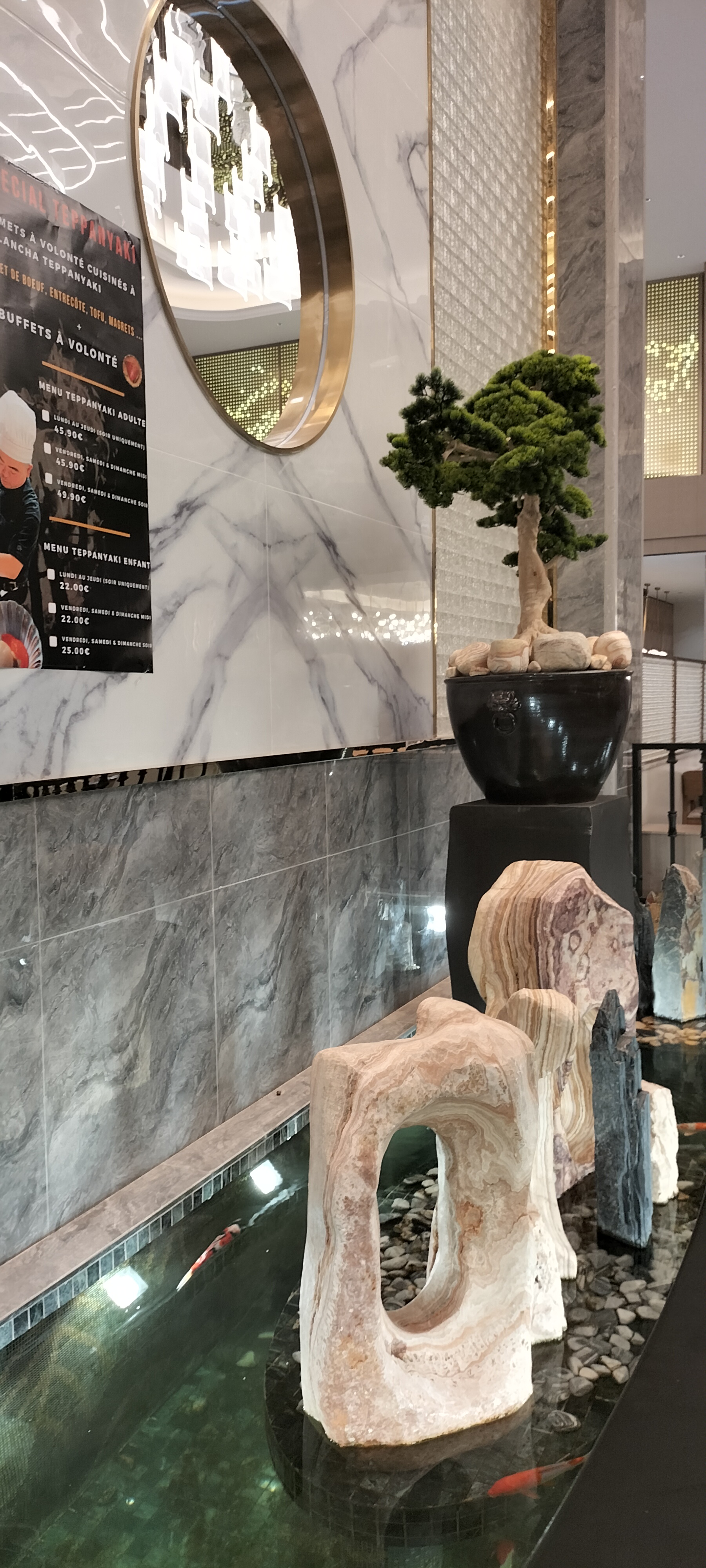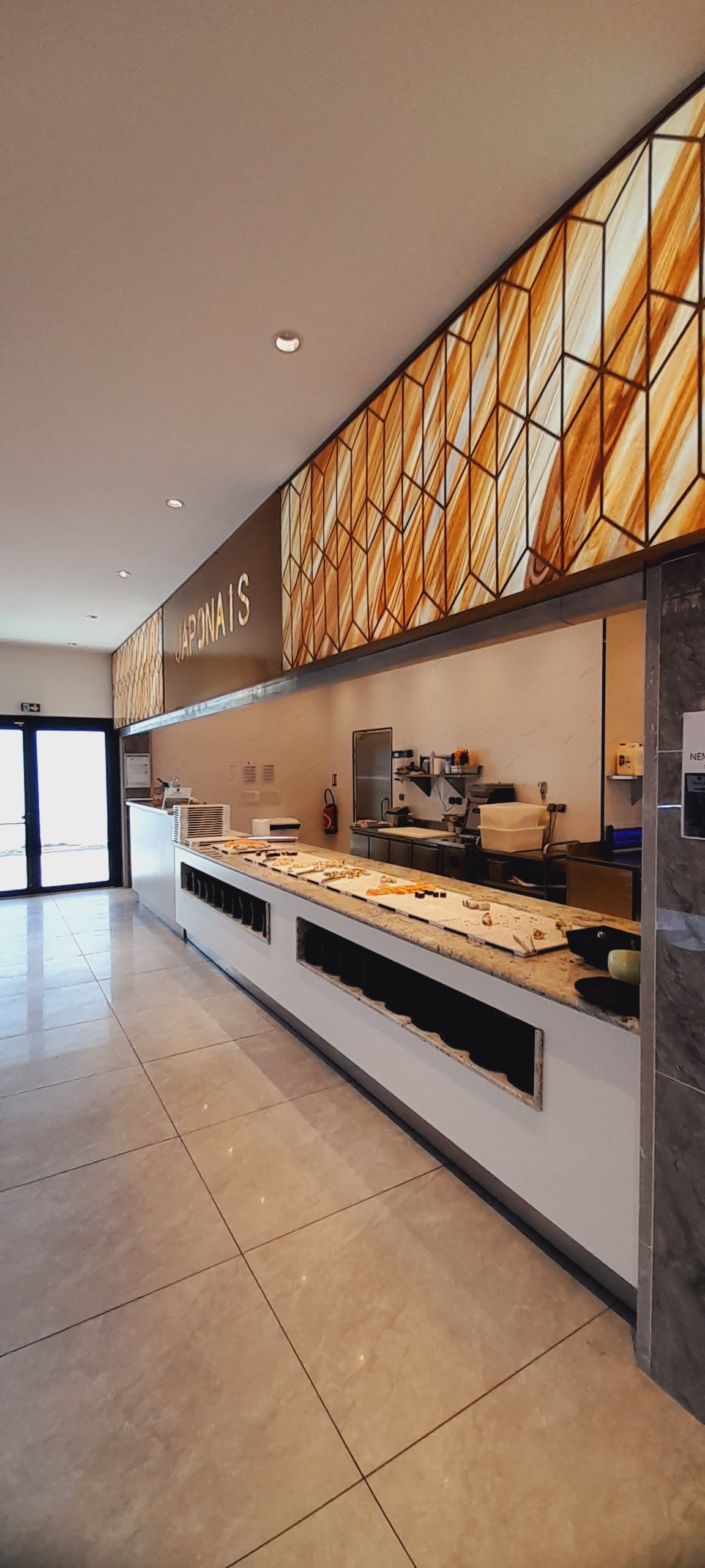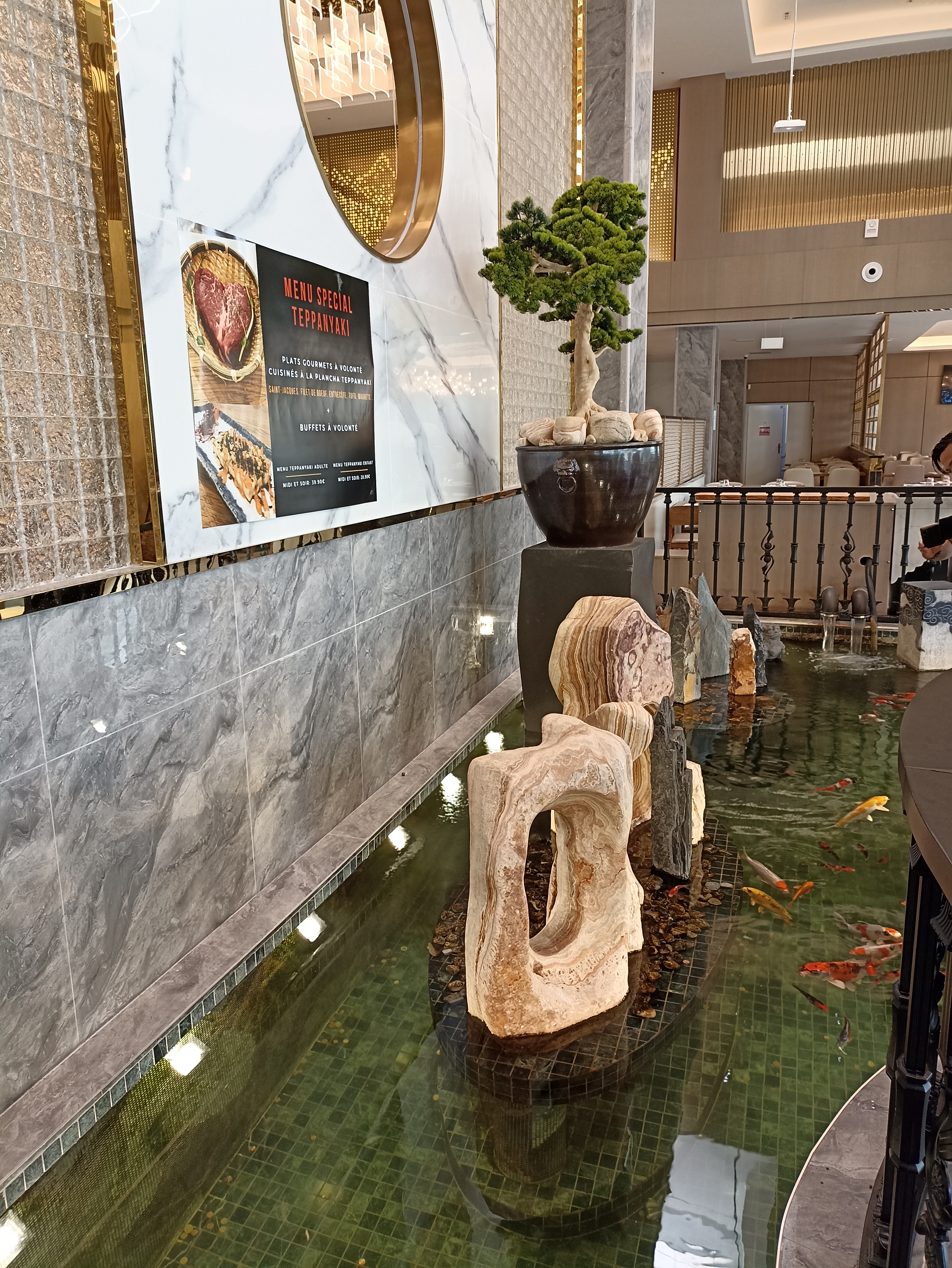 La déco est vraiment top et neuve en plus. Un effort a été fait sur les plafonds afin de limiter le bruit, la salle étant immense. Il vaut mieux venir tôt, dès 19h00, afin d'éviter la queue interminable qui vite se forme dès 19h30. Le parking est plutôt petit et partagé avec le supermarché d'a coté, qui lui ferme à 19h00. Sympa, les petits robots qui se déplacent pour amener les boissons, cela fait toujours son petit effet. Bon après, on trouve de tout : pizzaiolo, sushis, grillades au charbon, plancha, de très nombreux plats, charcuterie, desserts, ... Forcément, c'est beaucoup à base de congelé, mais on le sais quand on va dans ce genre de restaurant. Plutôt que de s'empiffrer comme pas possible, je préfère mettre l'accent sur les fruits de mer, le demi-homard et le poisson à la plancha. Mine de rien, pas forcément facile de trouver ailleurs une telle diversité et du coup, le tarif, certes élevé, devient nettement plus intéressant, idem pour la cote de bœuf (que je n'ai pas testé) d'1 kg pour 2 qui alors vaut le coup en rapport qualité/prix. Je n'ai pas vu la provenance de la viande (mais peut être est-ce néanmoins indiqué quelque part). Spécial dédicace au personnel à la plancha qui est efficace, ce n'est pas un poste facile. A noter, cela peut être utile, de gigantesque table ronde, tournante, pour au moins 10 ou 12 personnes, à réserver je pense : idéal pour une fête de famille. Pour le dessert, je suis resté sur les fruits (congelés) avec juste une incursion sur un tiramisu au café, ma foi fort agréable. Je pense revenir pour tester le coté Teppanyaki, à réserver également