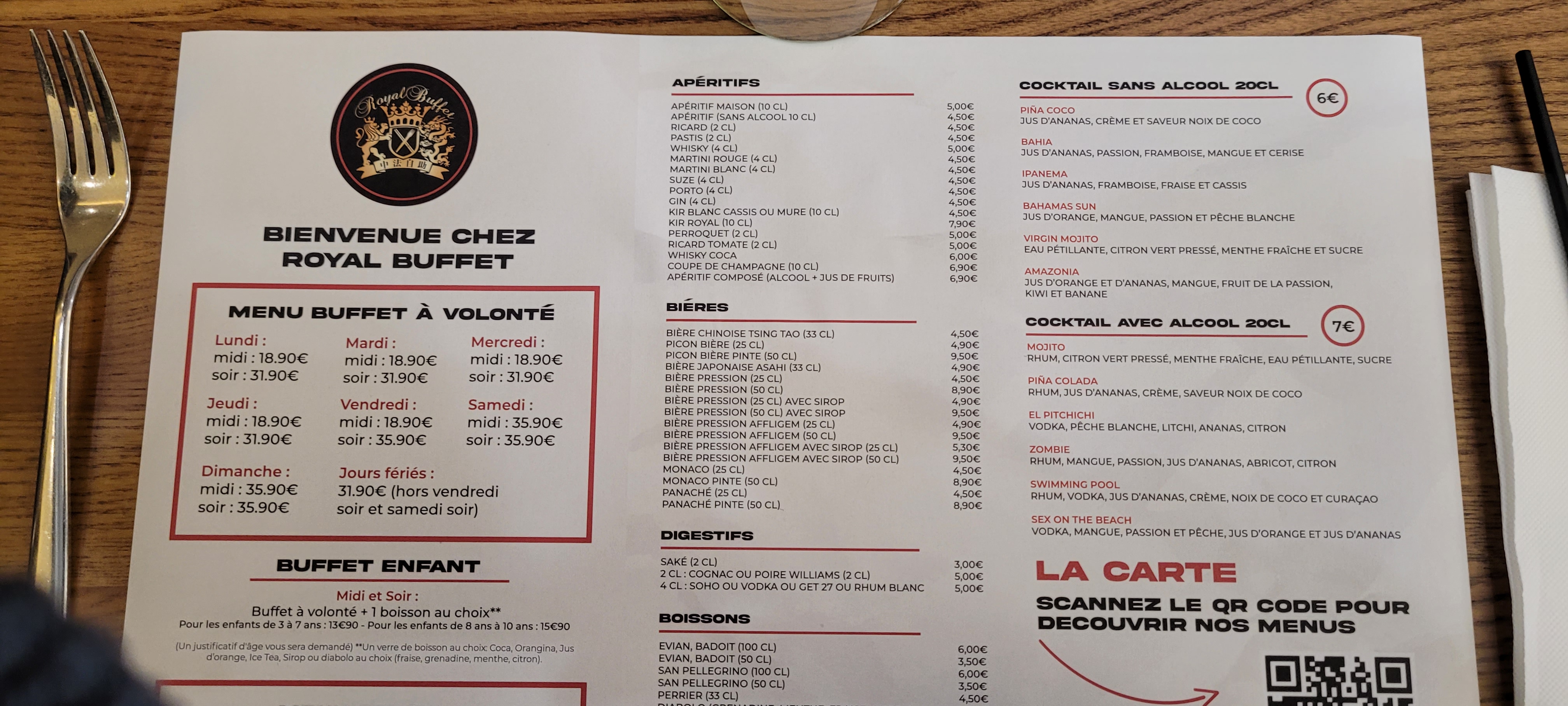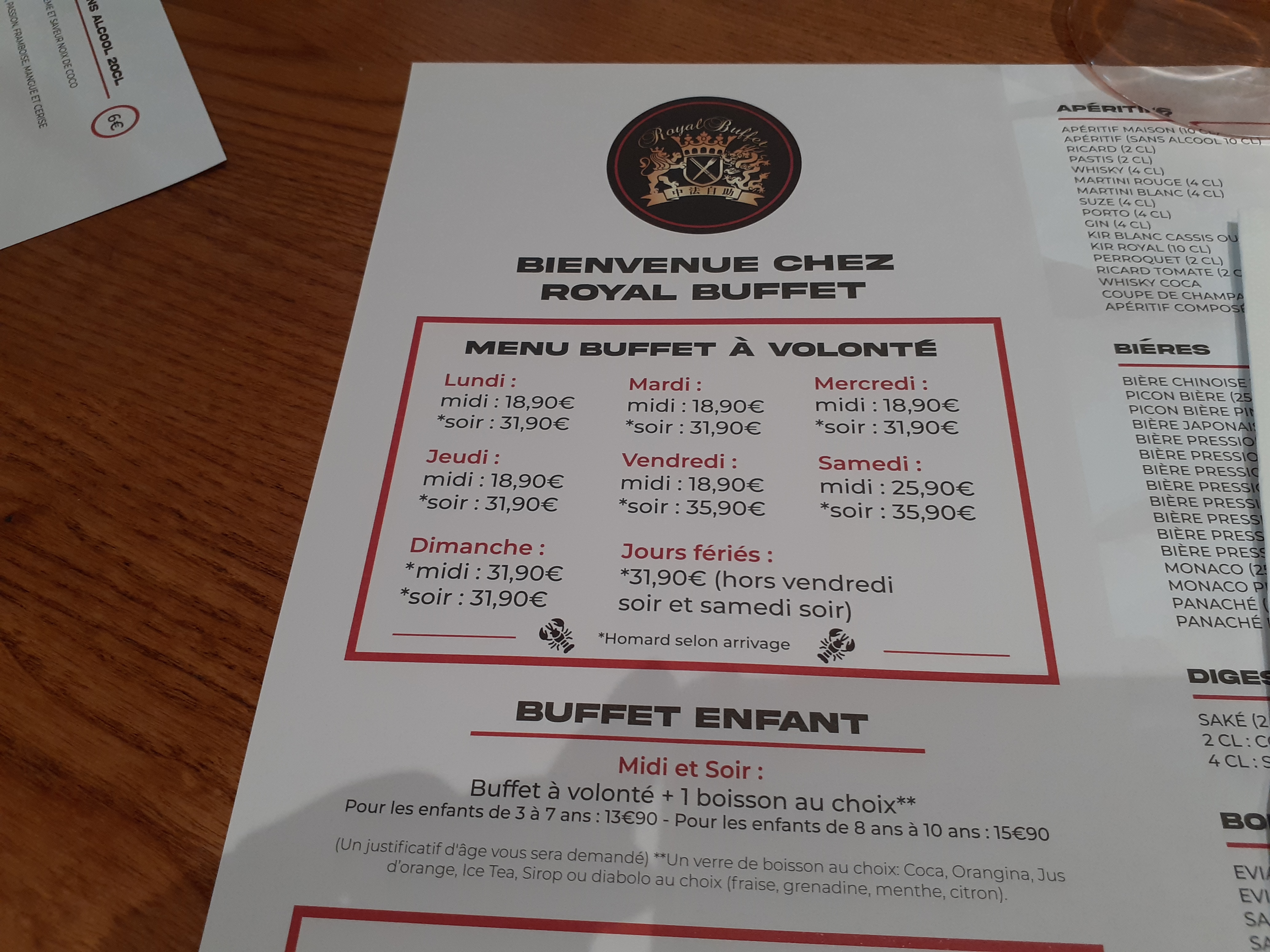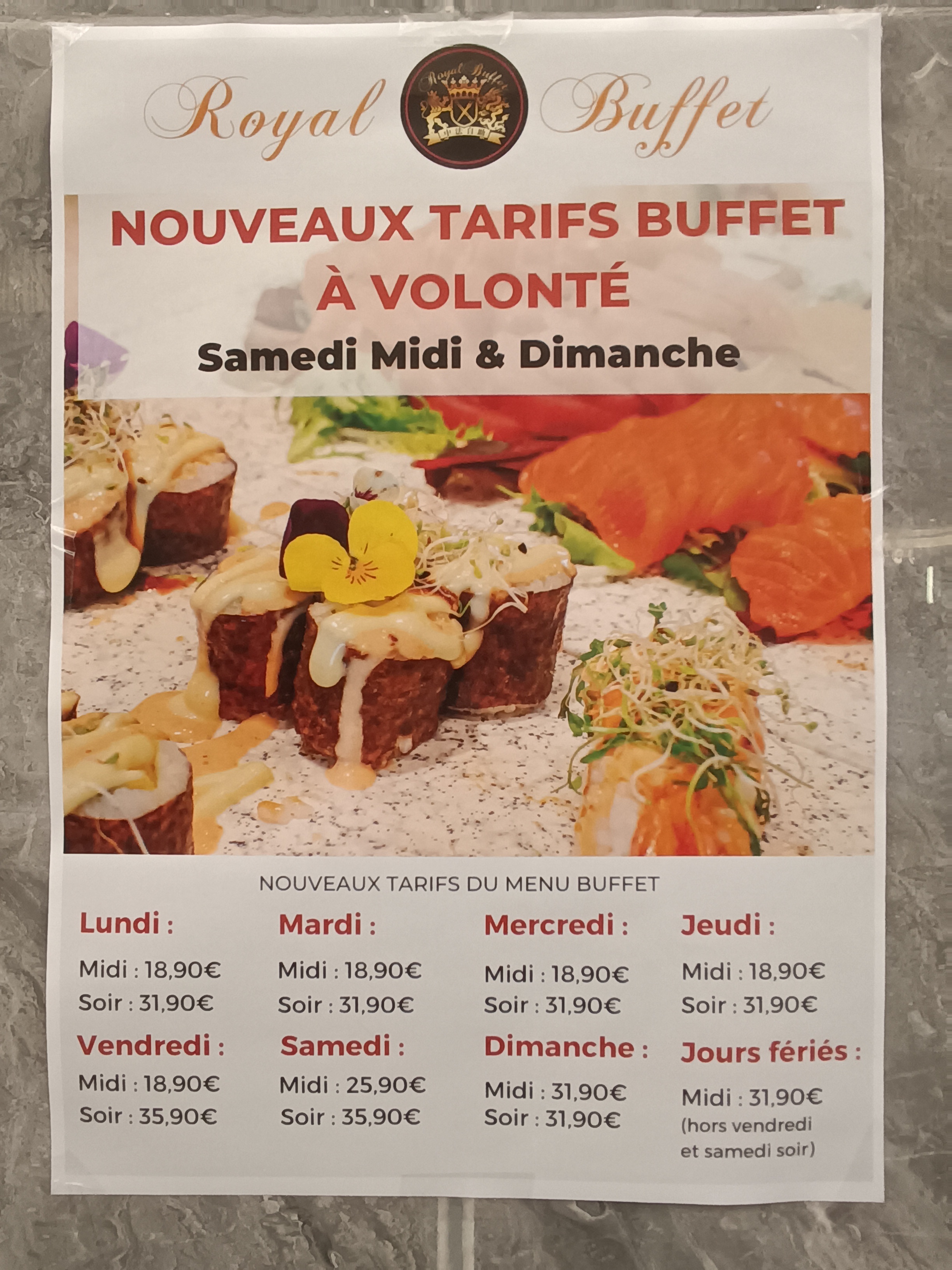 Bonjour Monsieur, nous vous remercions pour votre retour, Merci encore pour votre retour d’expérience. Nous espérons que vous retenterez l'expérience Royal Buffet. À bientôt chez Royal Buffet