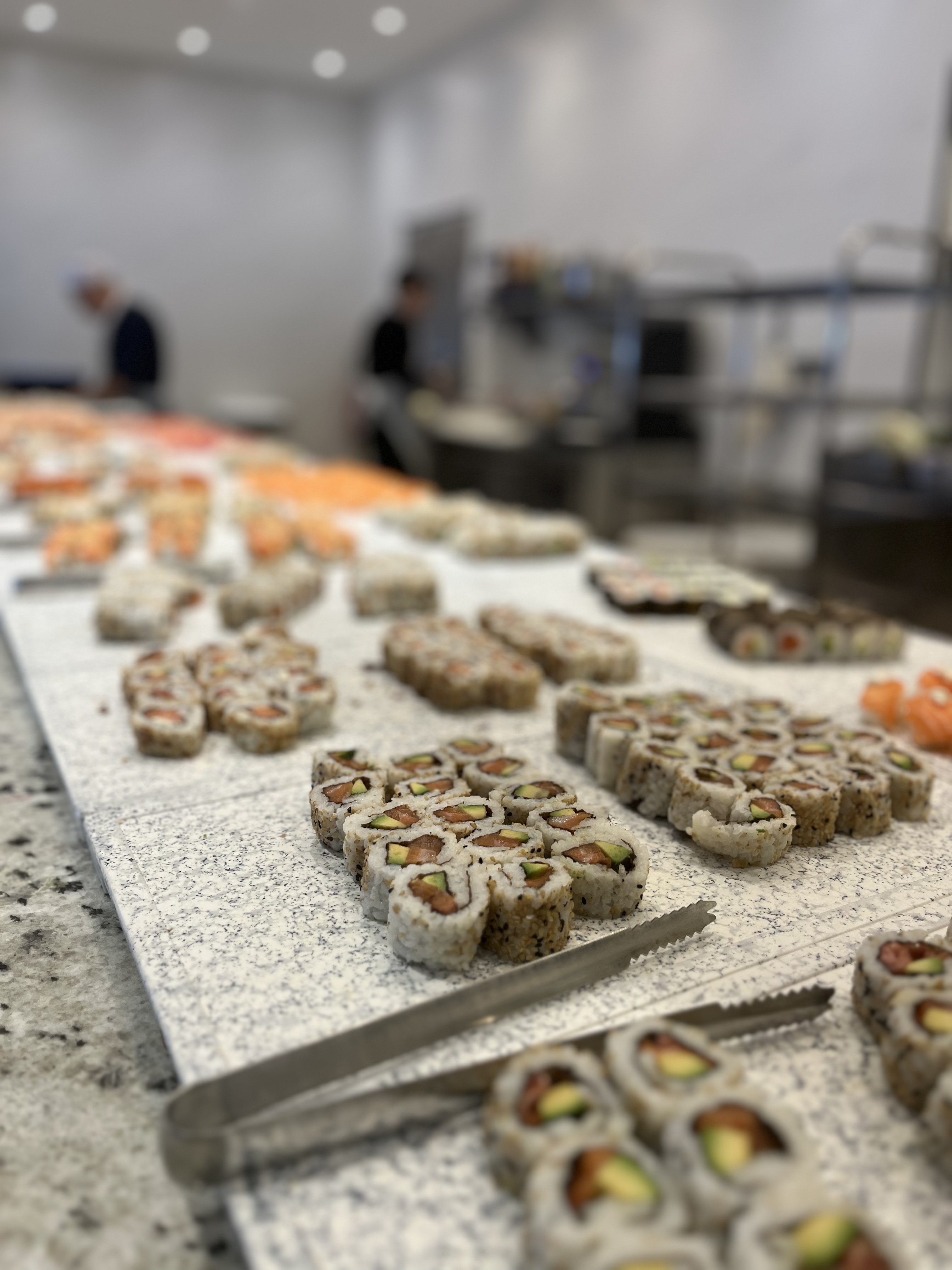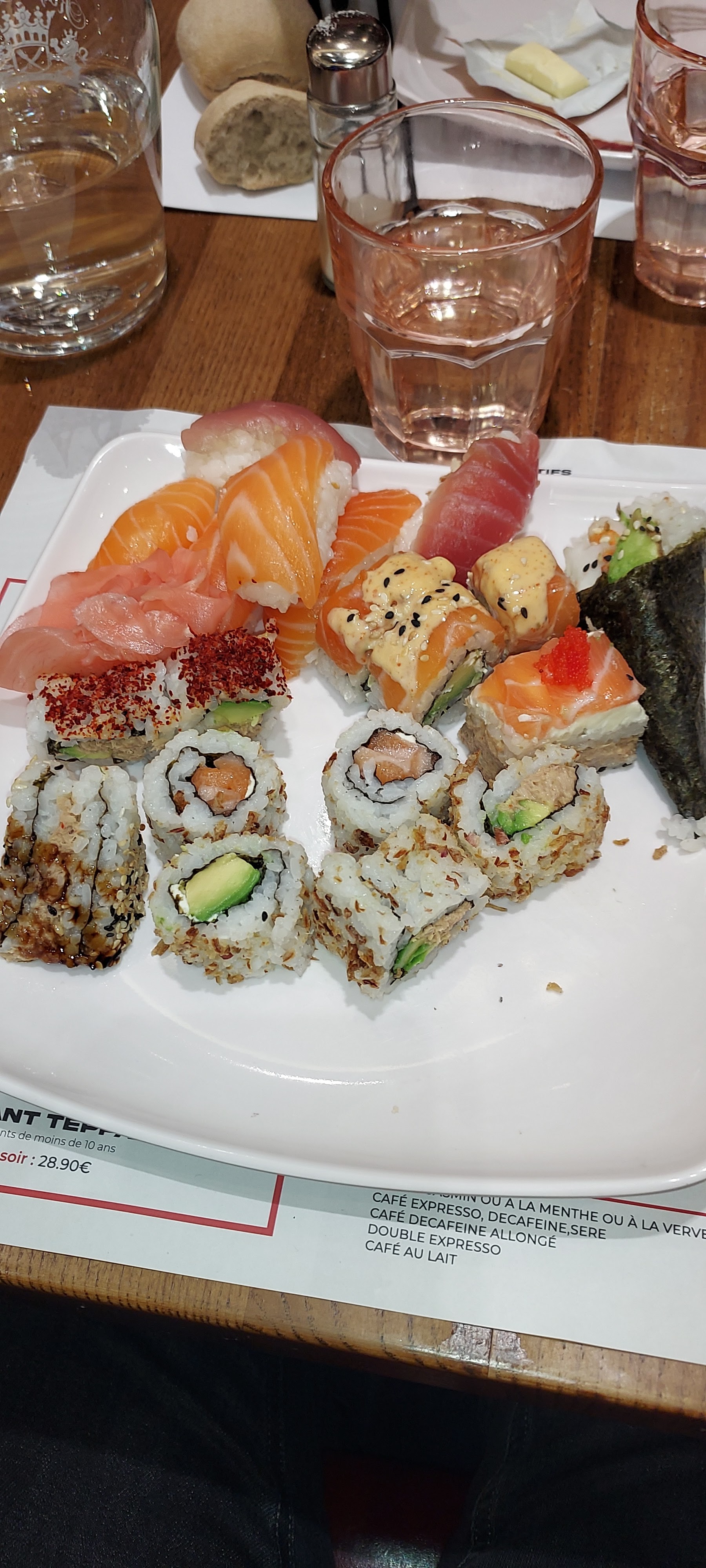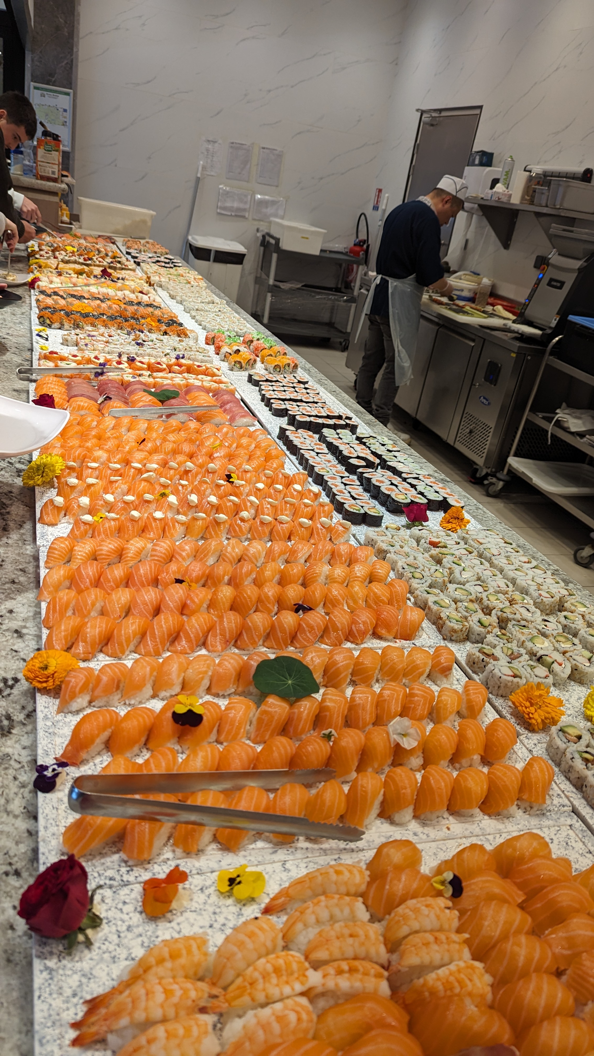 Pas mal le midi (19€) pour un buffet à volonté mais assez moyen au niveau des sushis avec beaucoup de fromage blanc ou de choses pas très japonaises pour rentabiliser. Le choix de plat est intéressant et j'ai été agréablement surpris par les desserts (mais pas les churros). Par contre les boissons sont très chères, par exemple un coca à 4,50 €. La déco est sympa et on a la surprise d'être accueilli par un agent de sécurité et de pouvoir être servi par un robot. A tester le midi.