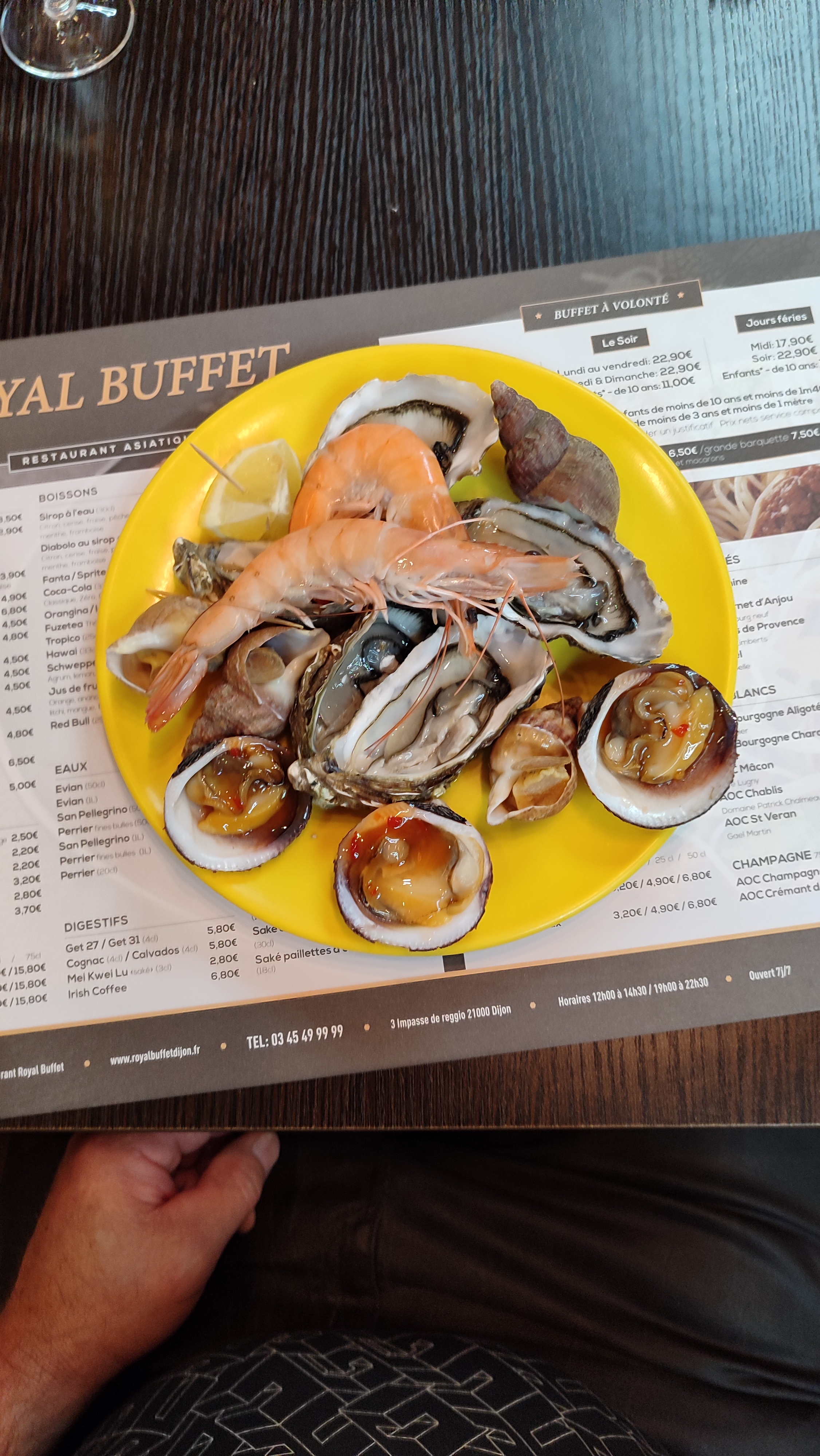 Bon... j'y suis allé 2 soirs de suite. Le serveur m'a reconnu et était mort de rire en me replaçant à la même table. Sinon le buffet est assez traditionnel pour ce genre d'endroit à part peut-être les huîtres et les escargots.