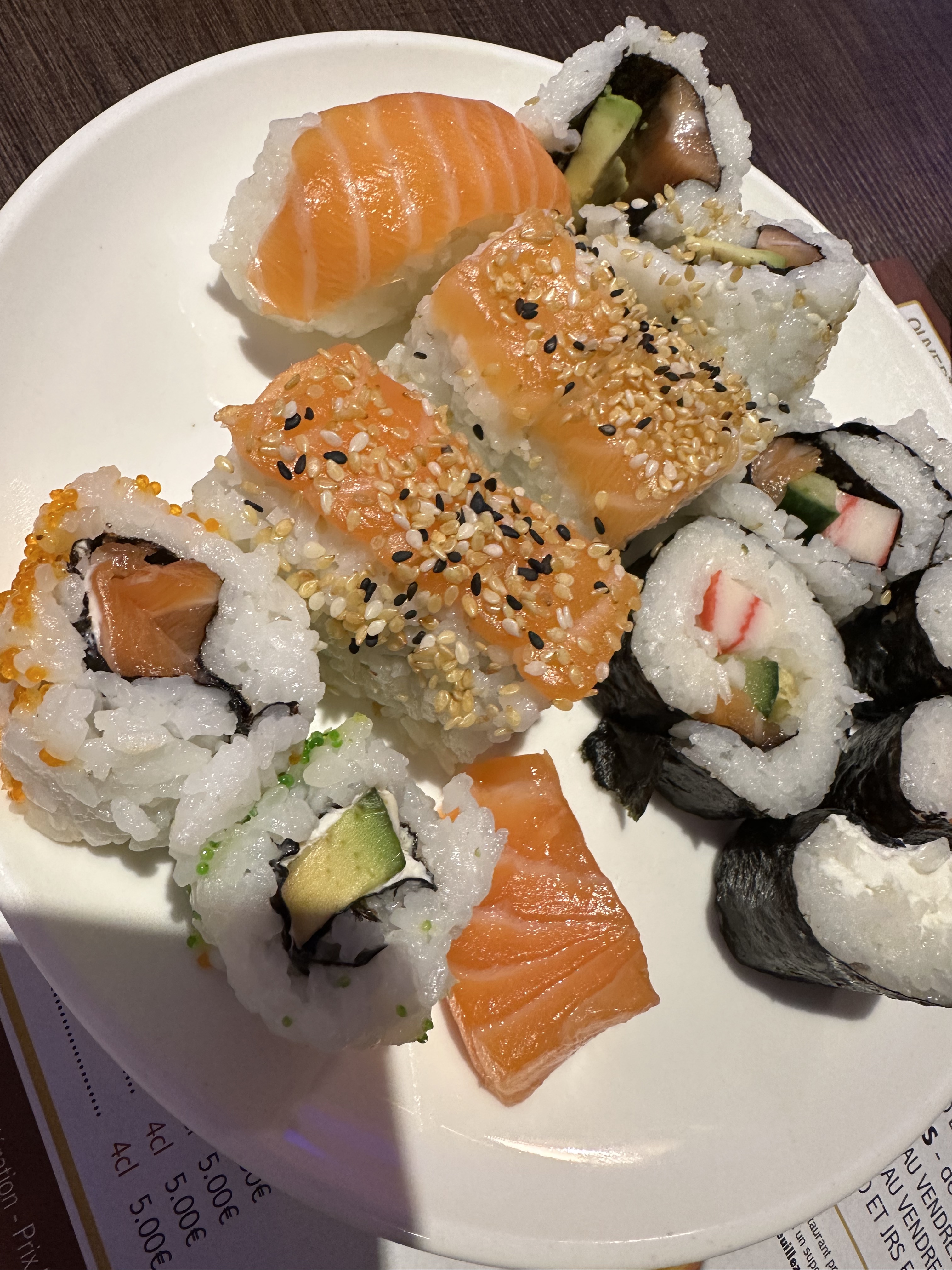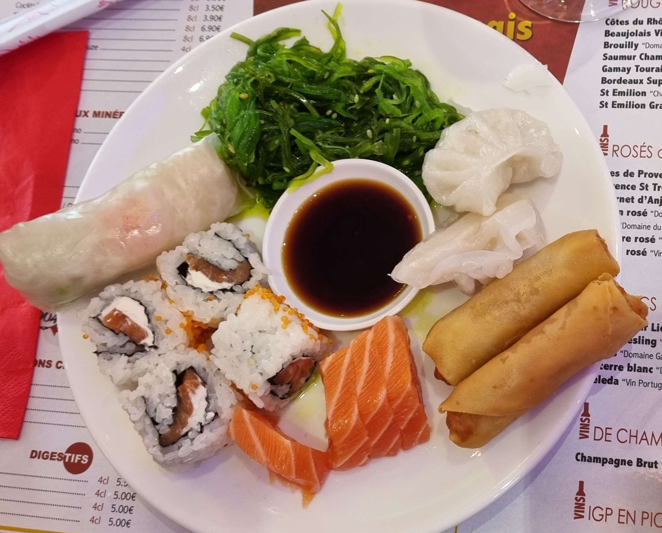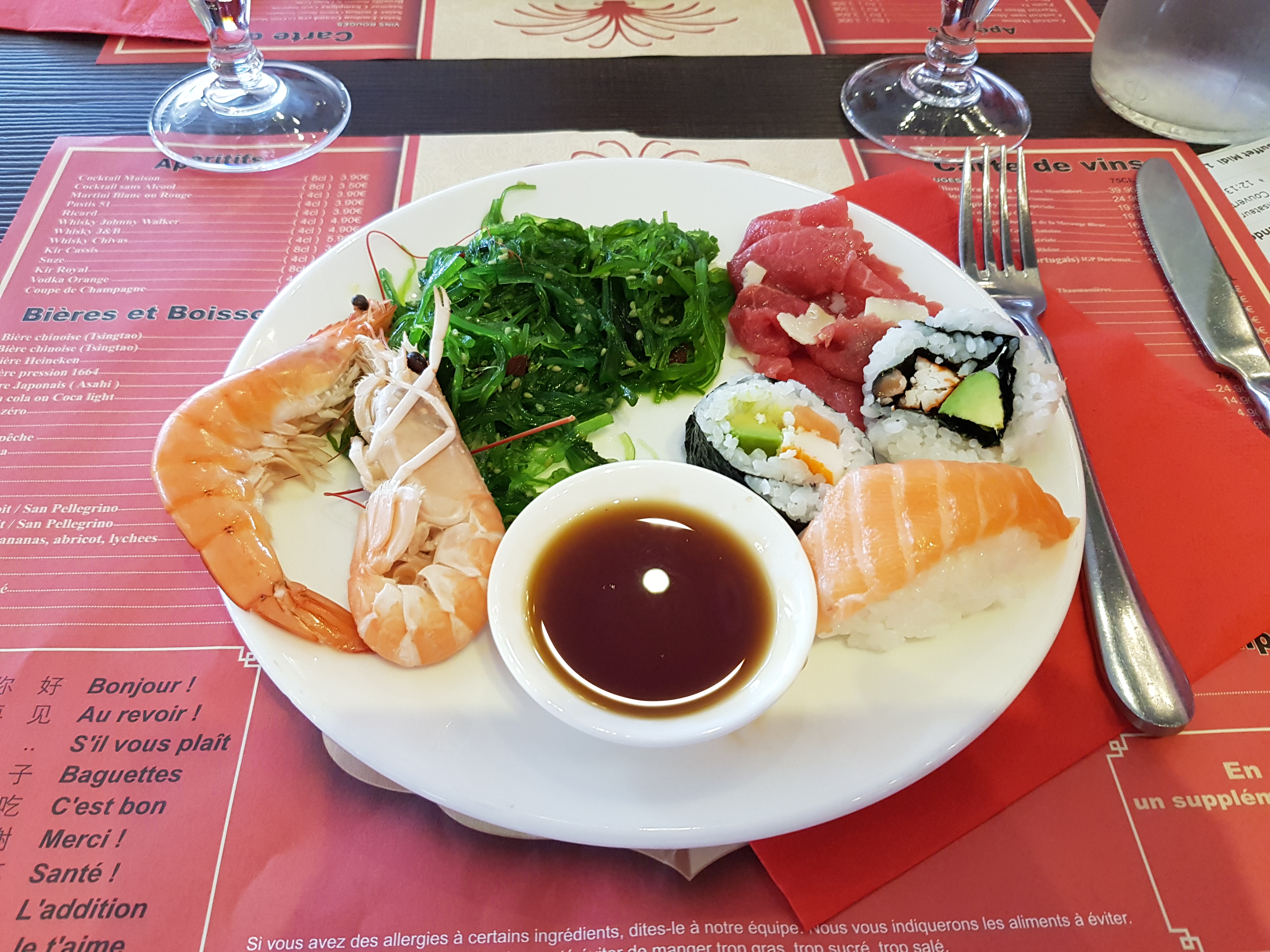 Très grand choix au buffet : fruits de mer, salades, sushi/maki/sashimis, fritures, vapeurs , quelques plats chauds et surtout un grand choix pour le wok. De bonnes attentions envers les jeunes enfants en leur donnant des verres en plastique adaptés à leur morphologie. Un service agréable, ni trop ni pas assez, juste ce qu'il faut. Menu à 20,90e par adulte le soir et WE et 10,90e pour les enfants.