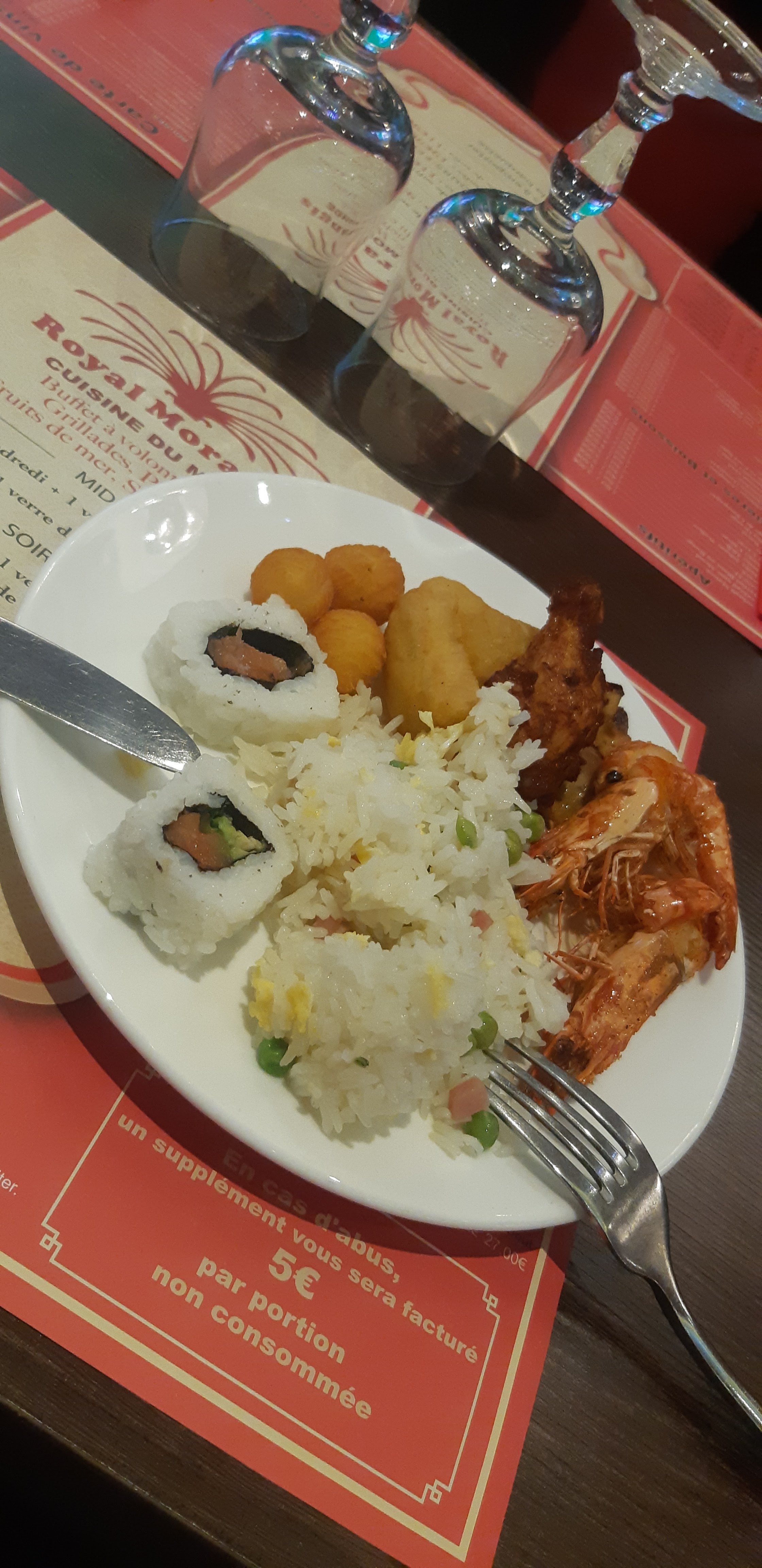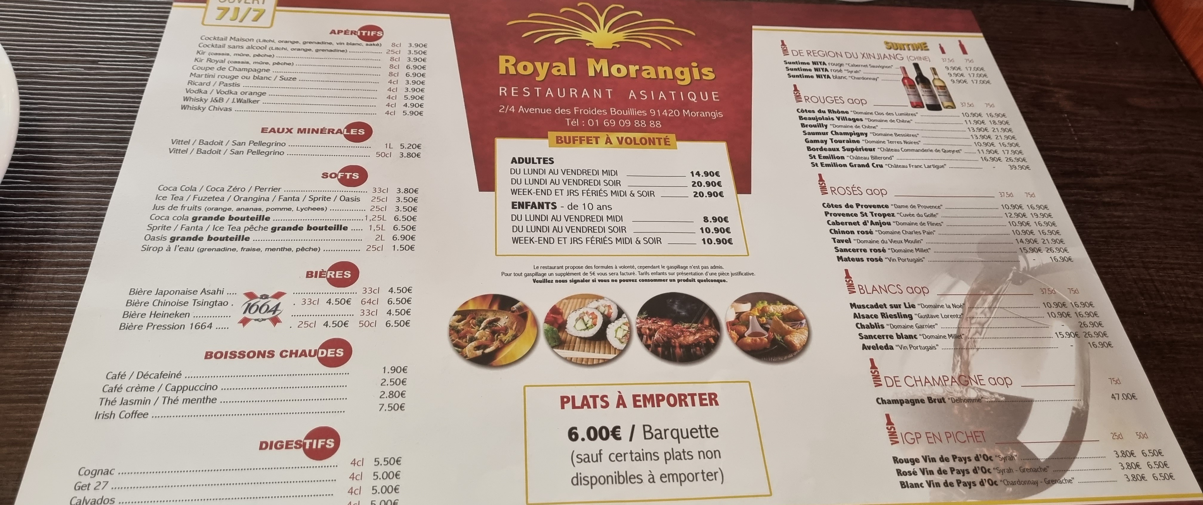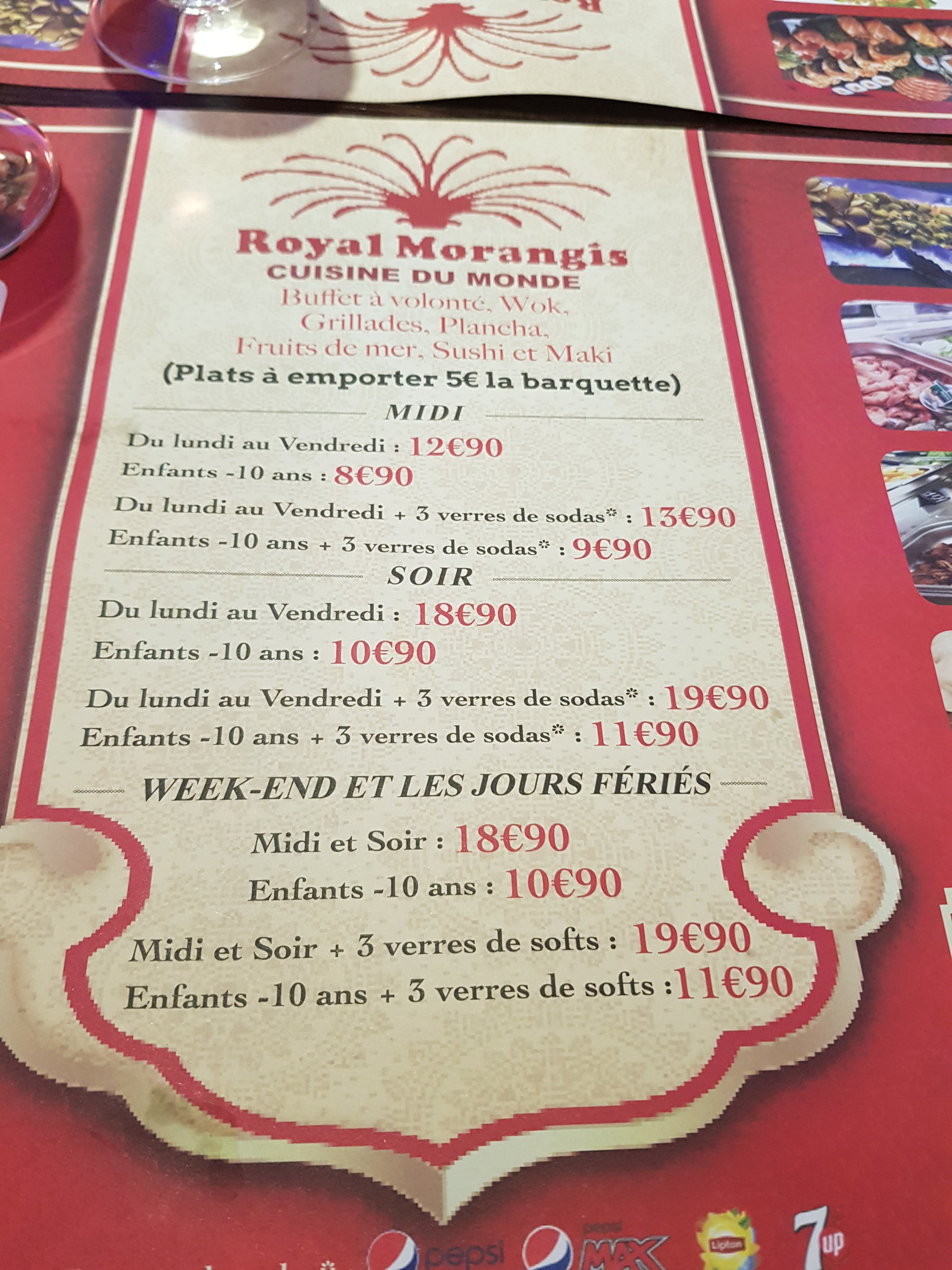 Nous avons manger vendredi soir au Royal Morangis. Propose un choix de plats juste impressionnant plus de choix que la plus part des buffet à volonté. Dans le menu est inclu un soft donc pour 19.99 vous avez le buffet plus un soft. Le restaurants vous facturera 5€ si ils considèrent que vous en laissez trop ce qui est bien pour éviter le gaspillage. Le restaurant q une bonne ambiance familiale.