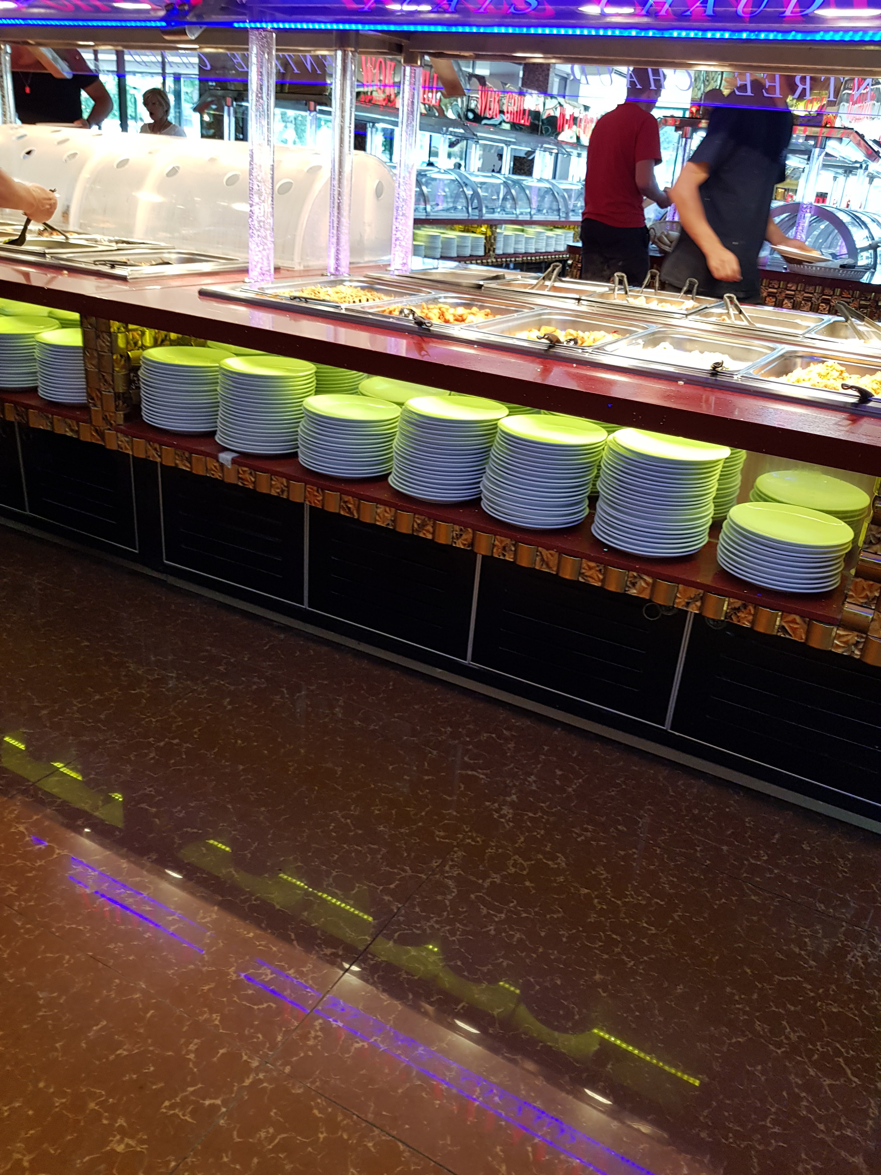 Vaisselle avec les traînées d'eau apparentes. Buffet avec beaucoup de choix mais c'est sec, rassis, pas bon, je me demande si la chaîne du froid est respectée, et des mouches qui squattent dans la bouffe aussi... Le cuisinier du wok, plus désagréable, je pense que ça n'existe pas ! Et les desserts immondes... Les glaces fondues dans les bacs... Et puis quand c'est l'heure de fermeture, pas de répit, dehors ! Hyper déçue ! A fuir !