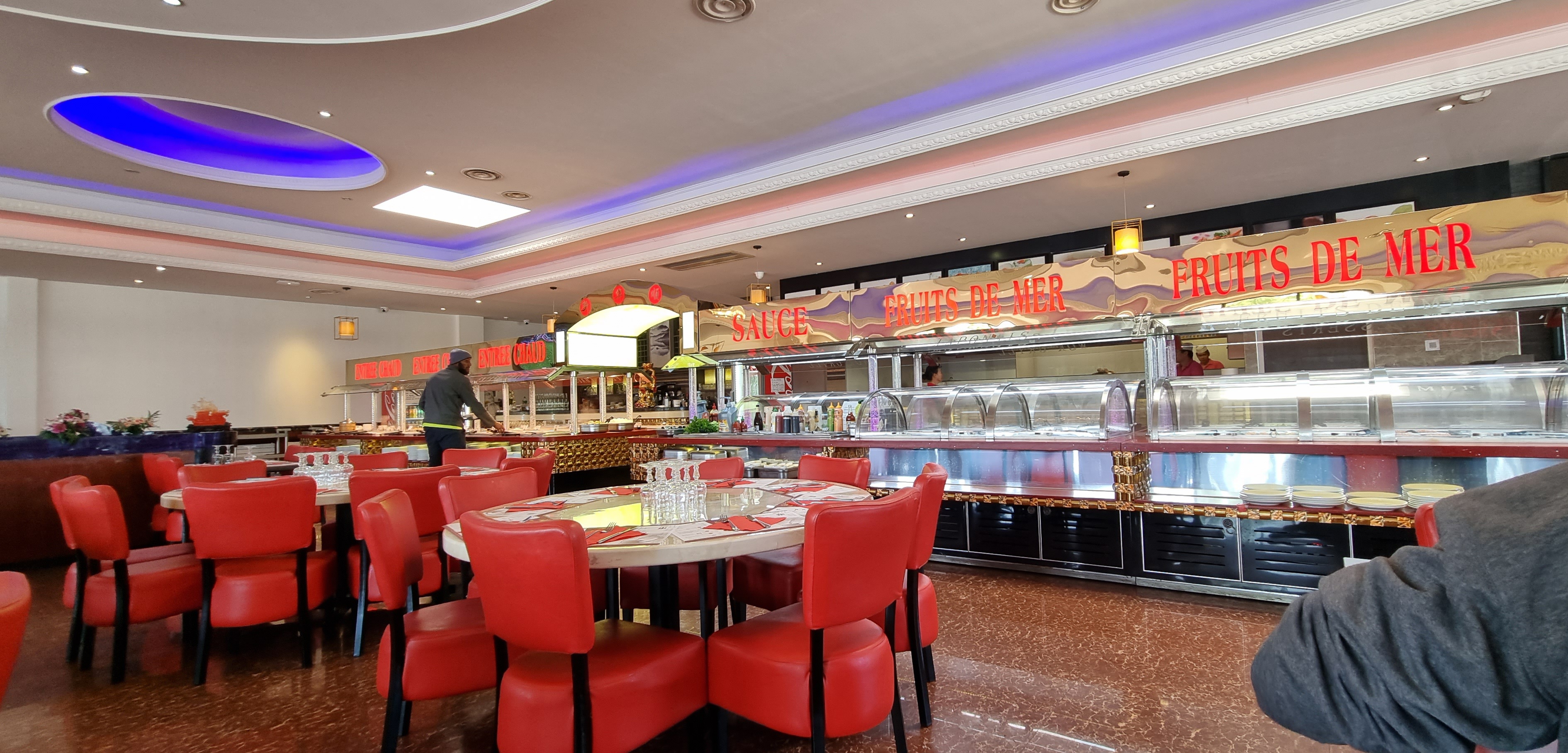 Grande salle, tables bien disposées facilitant le déplacement vers les buffets : entrées très variées, nombreux plats chauds, et un autre buffet pour le wok avec beaux morceaux de viande rouge. Les amateurs de dessert apprécieront aussi le buffet qui y est consacré, ainsi que les enfants...