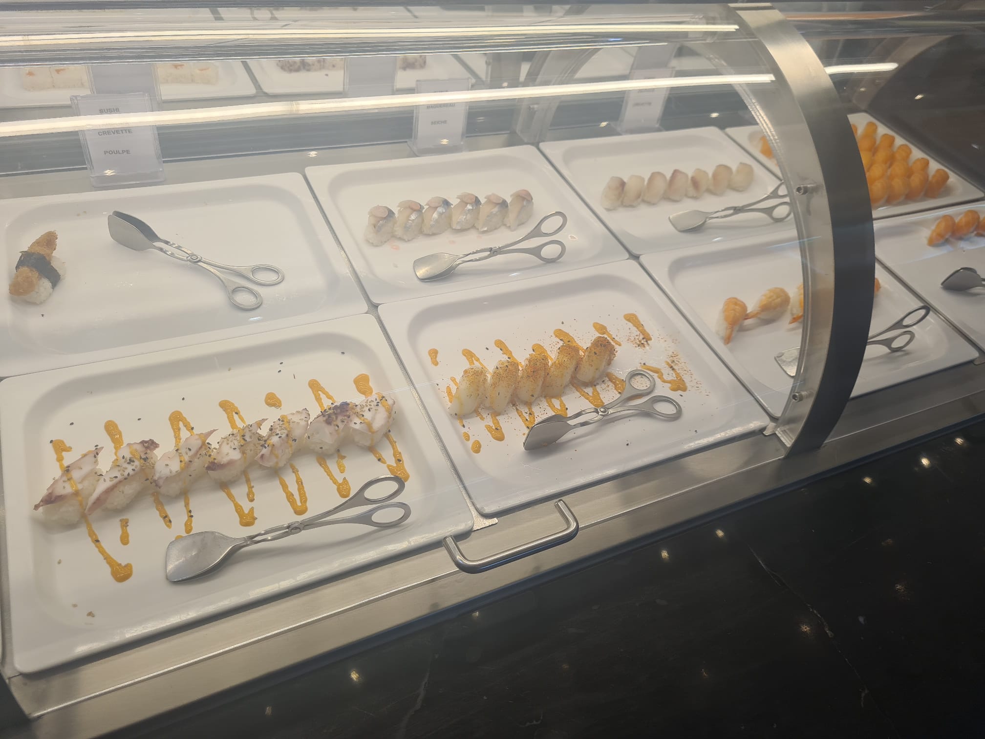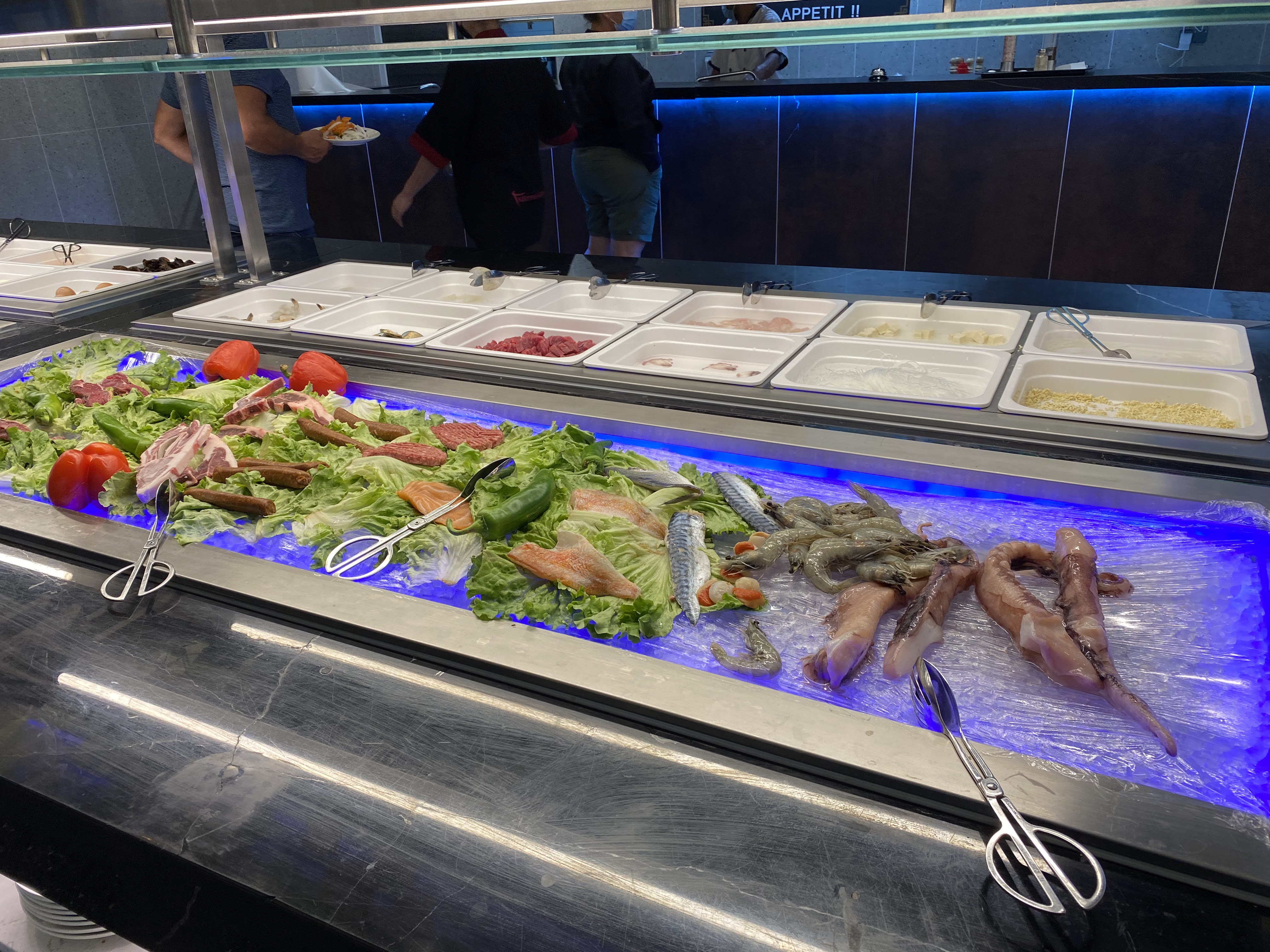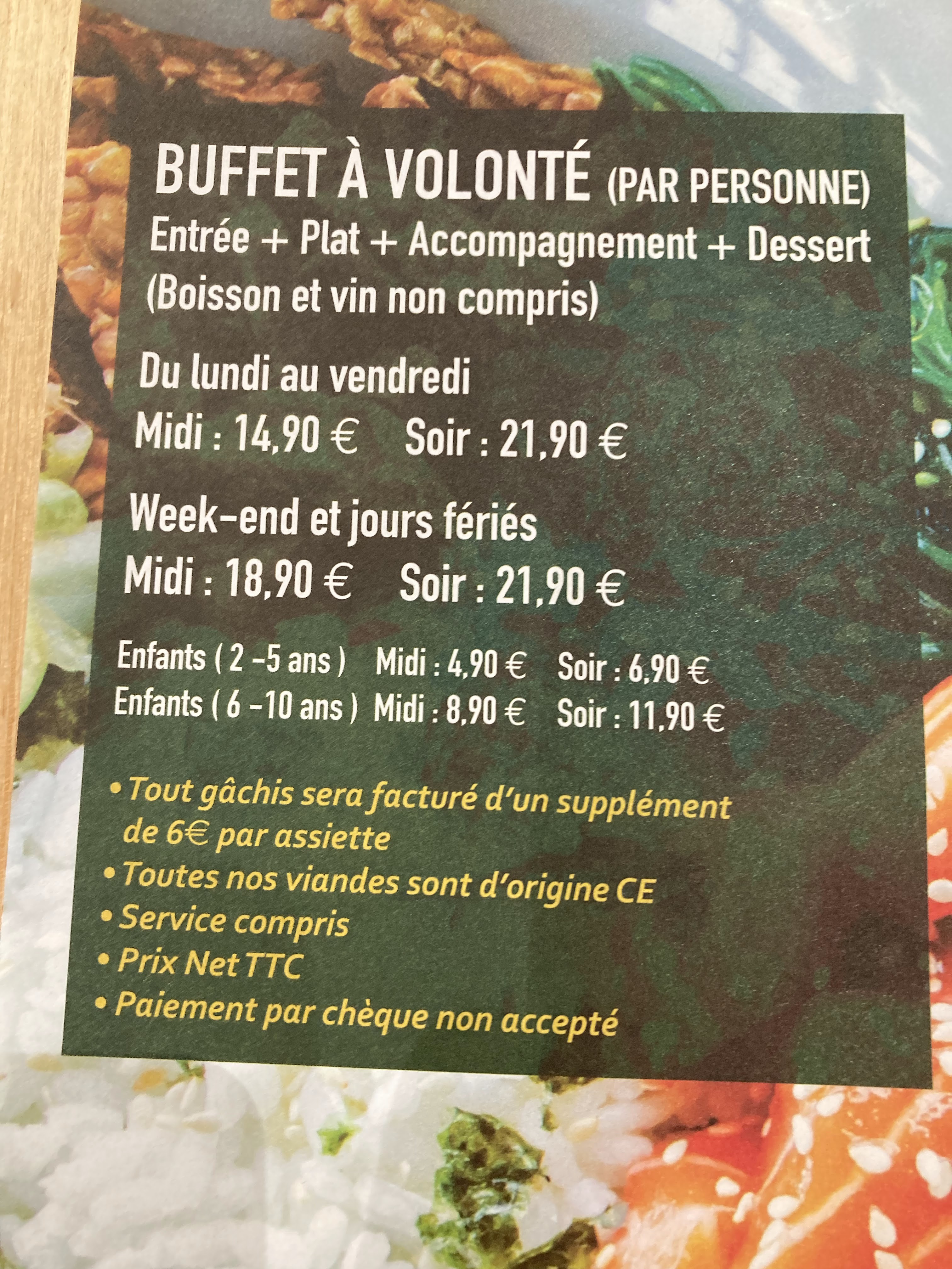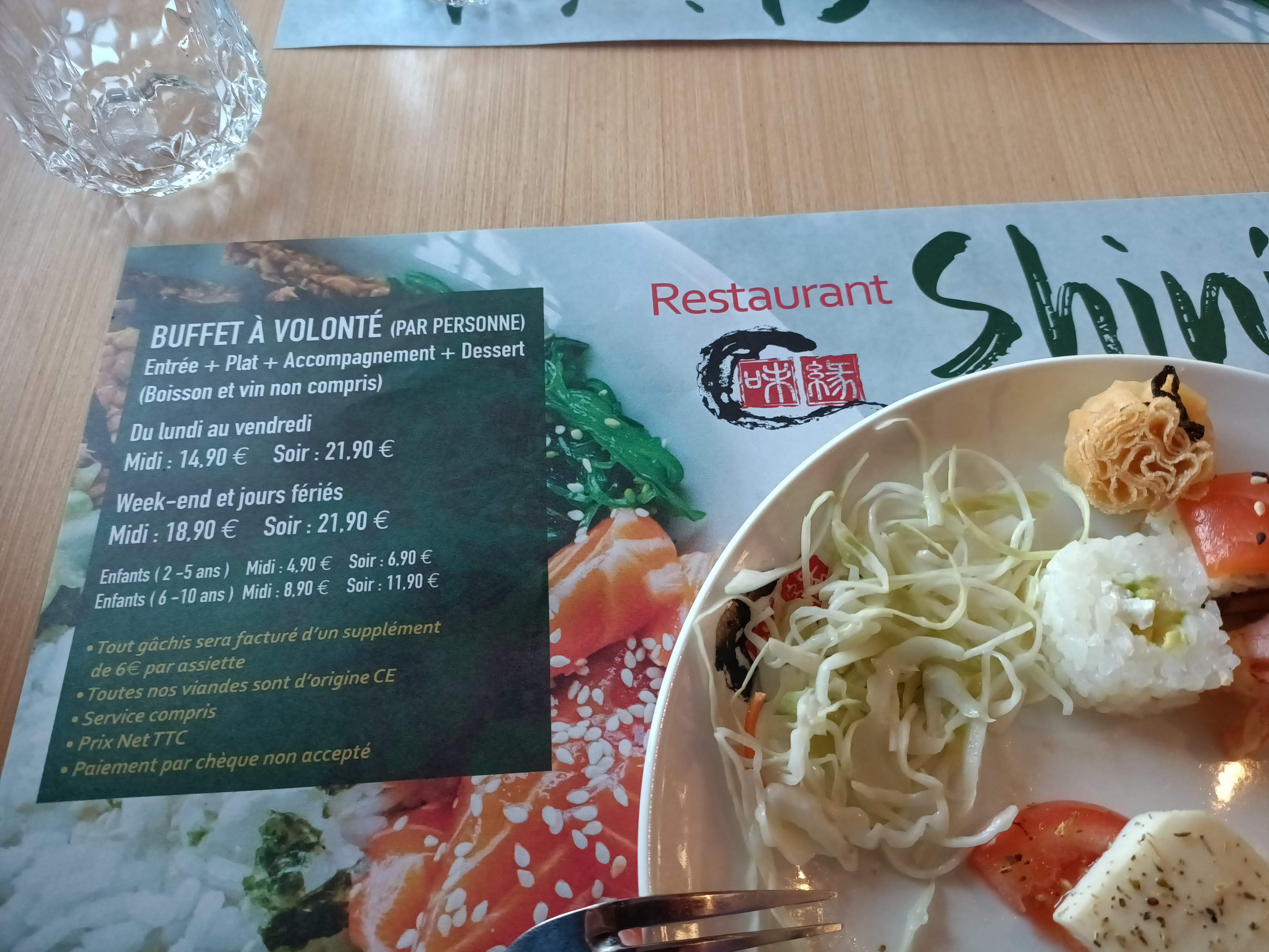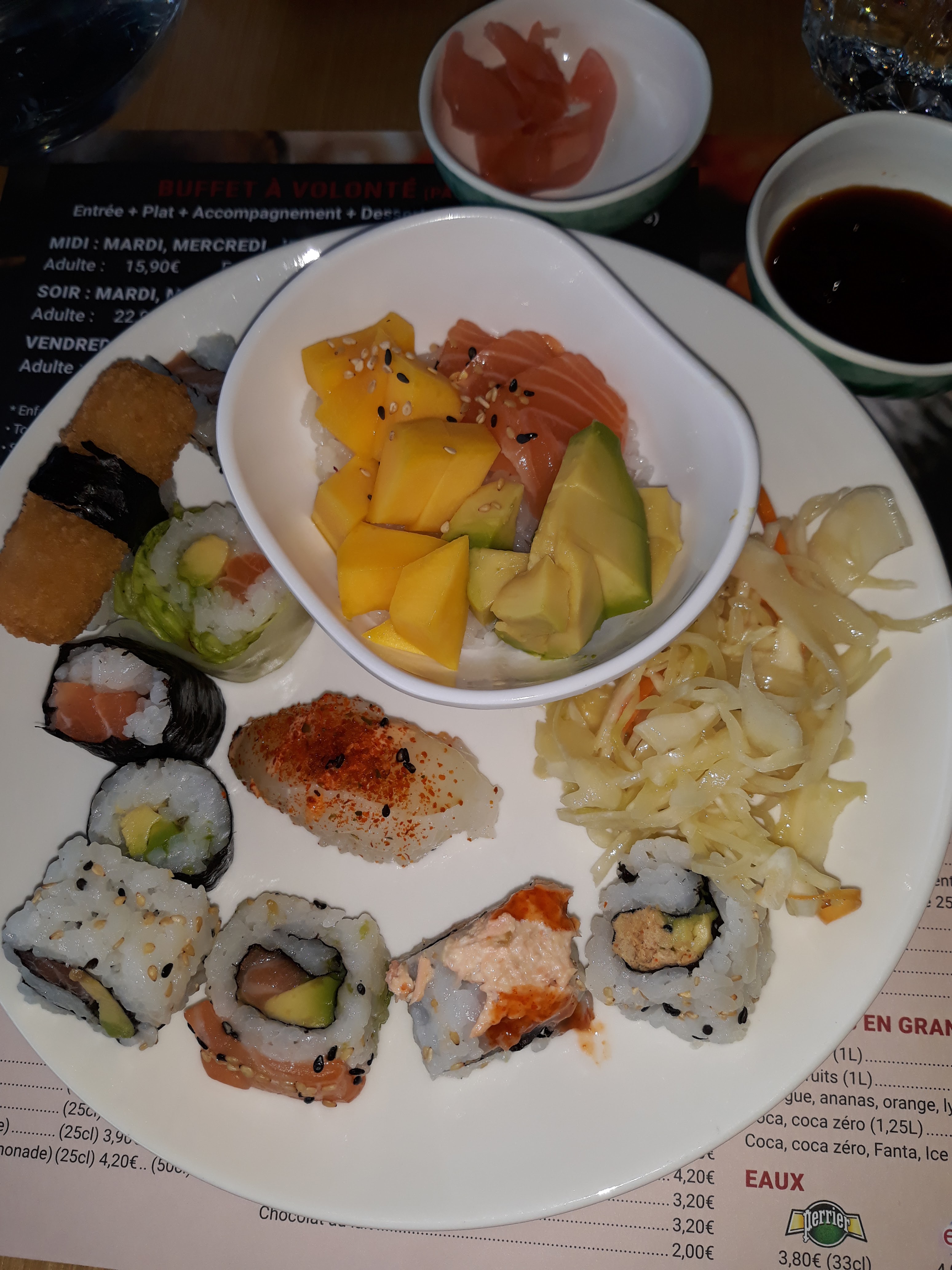 Je vous conseille fortement le buffet est à volonté hallal, 🍤, noix de St Jacques, Crabe, 🐙, brochettes à volonté, wok, fontaine aux chocolat au lait, desserts, viande, sushi, maki.......la liste est longue 🤣. Le personnel est au top professionnel, à l'écoute, prise de température sas pour se désinfecter 👏🏿👏🏿👏🏿👏🏿. Merci c'est la 1ère fois que je vais dans un restaurant à volonté avec une équipe de pro au top et des produits frais avec autant de choix.