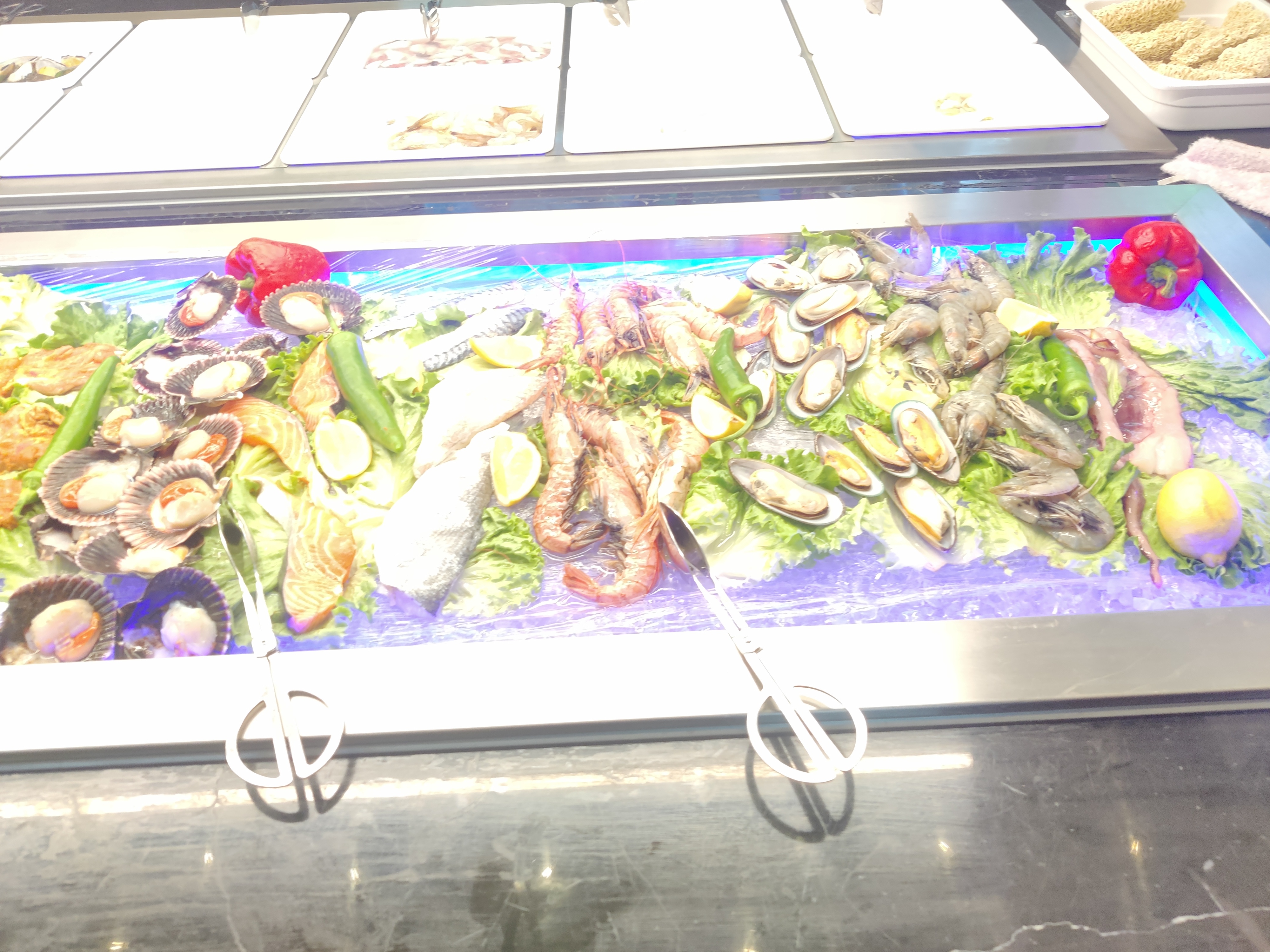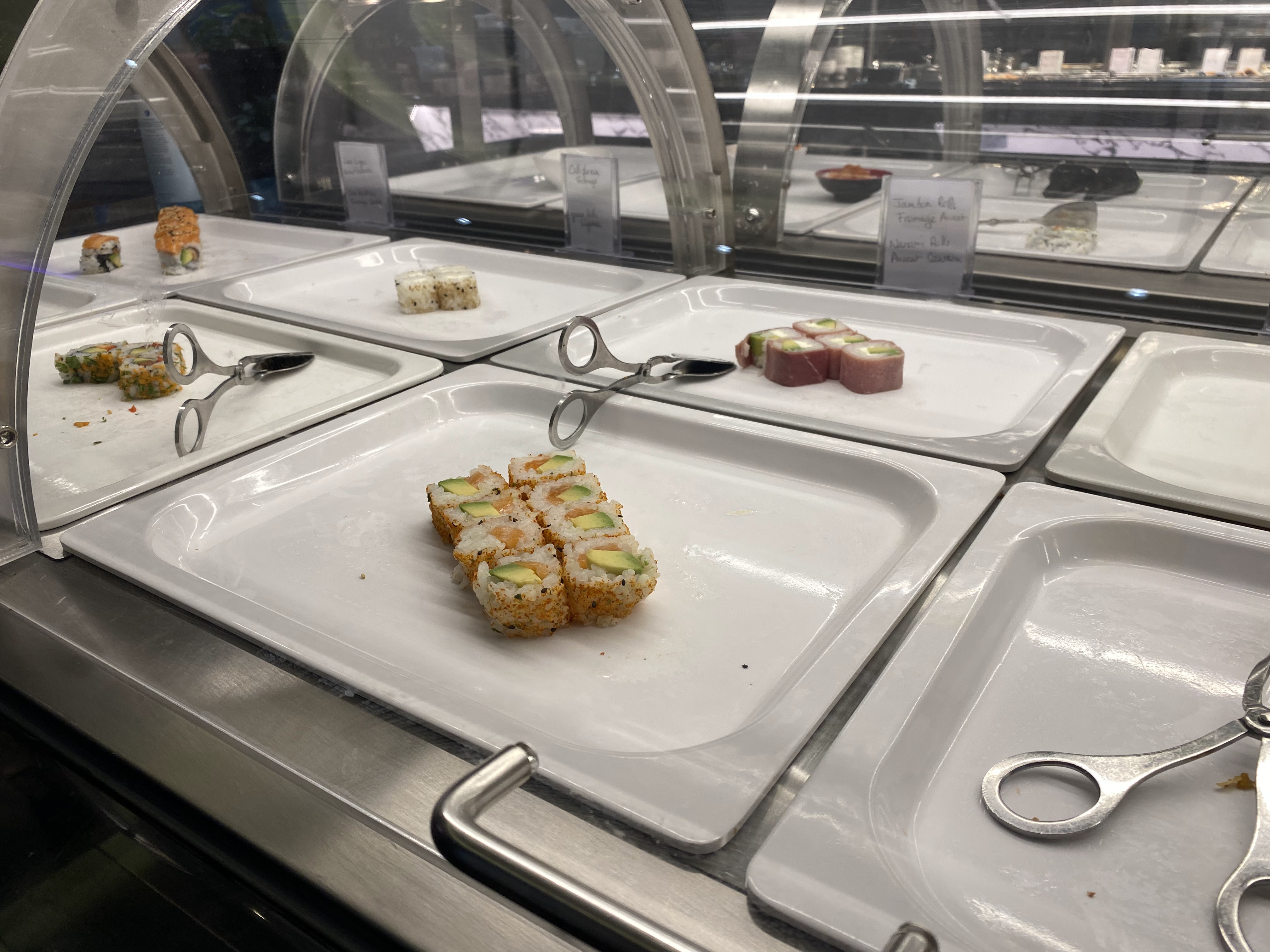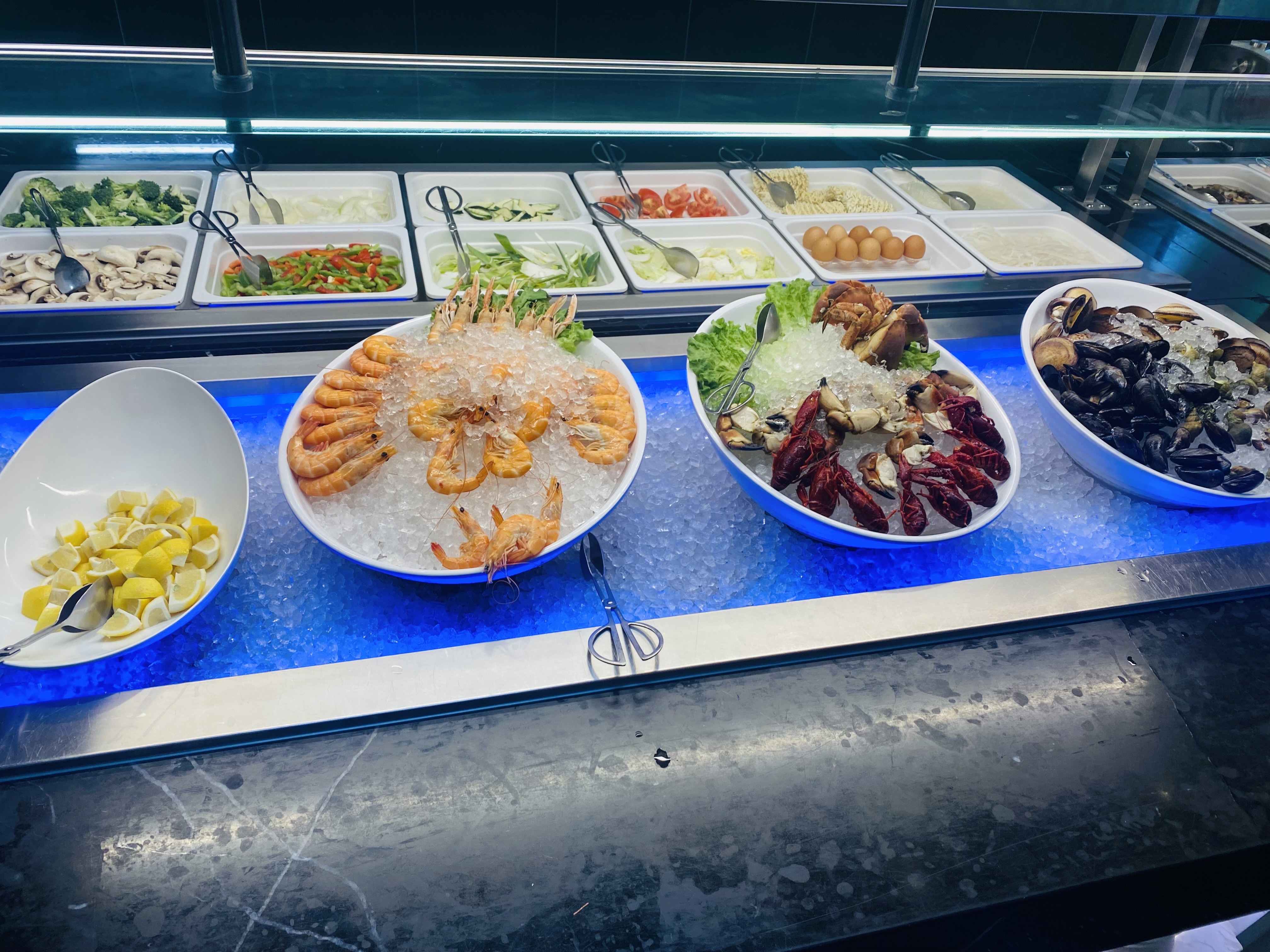 Dans l'ensemble, les choix sont nombreux. J'adore les huîtres et les coquillages servis frais sur un lit de glace. La décoration est magnifique, style 1930. Le restaurant est propre. Cependant, soyons réalistes, quelle est la fraîcheur réelle de tant de plats ? Je pense qu'ils font un excellent travail pour fournir de la fraîcheur et de l'originalité, mais la question se pose toujours : quelle est la part de ce qui est congelé et réchauffé ? Et d'où viennent-ils ? Honnêtement, lorsque plusieurs personnes manipulent les poignées de service, comment peut-on éviter la contamination croisée ? Ma principale préoccupation concerne les plats ouverts contenant des sauces, par exemple la mayonnaise, la sauce au piment et d'autres sauces, qui sont placées dans des plats ouverts et exposées aux microbes des autres convives qui toussent, éternuent, etc. Pourquoi ne pas utiliser le système de pompe ?