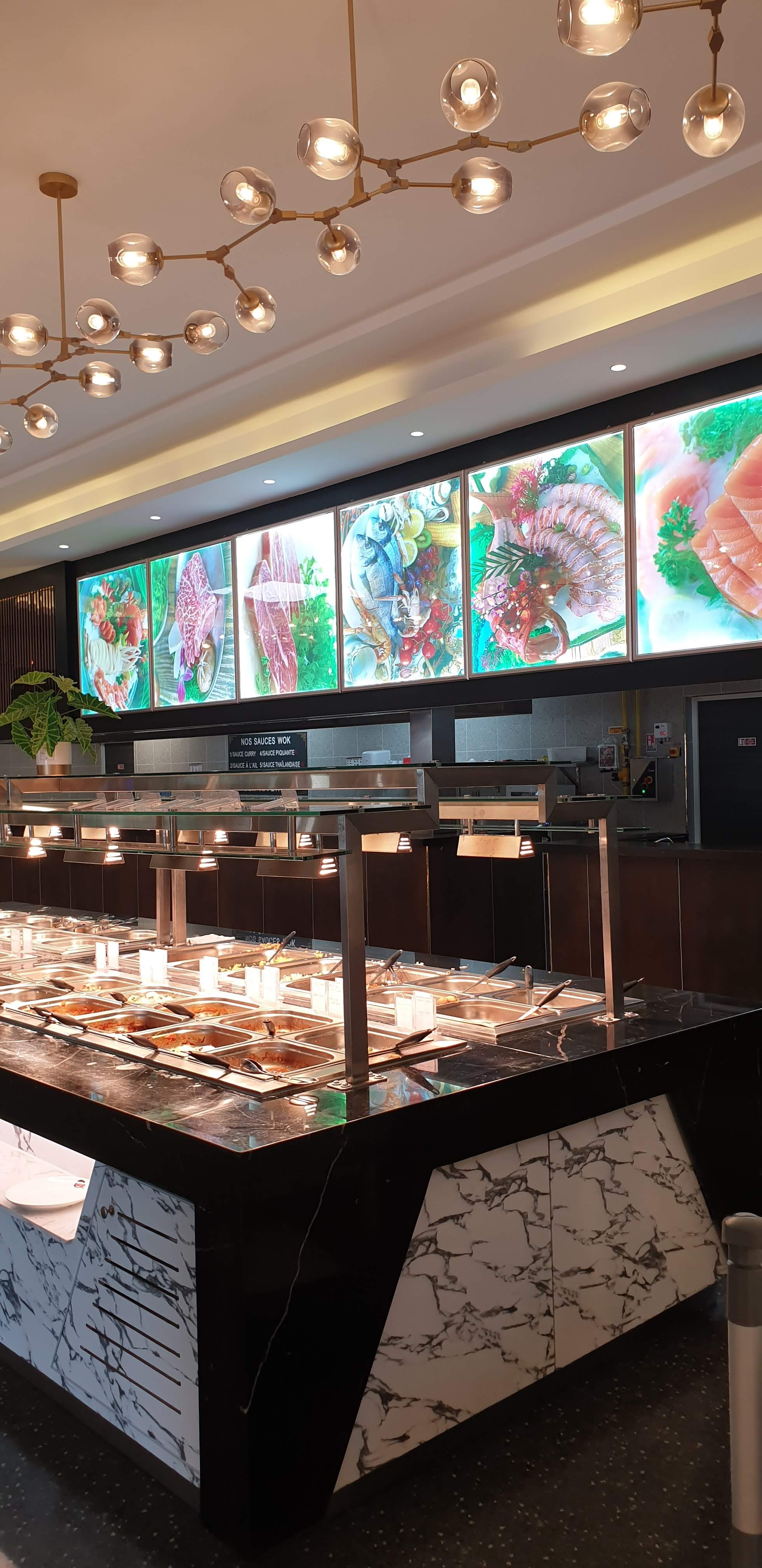Grande salle toute neuve, portique de désinfection covid et immense buffet asiatique très complet. On peut composer un wok et le donner à cuire ou profiter du buffet de sushis. Si l'on est gourmand, le buffet de dessert est varié. Très bon rapport qualité prix, les grosses faims sont vite calmées !