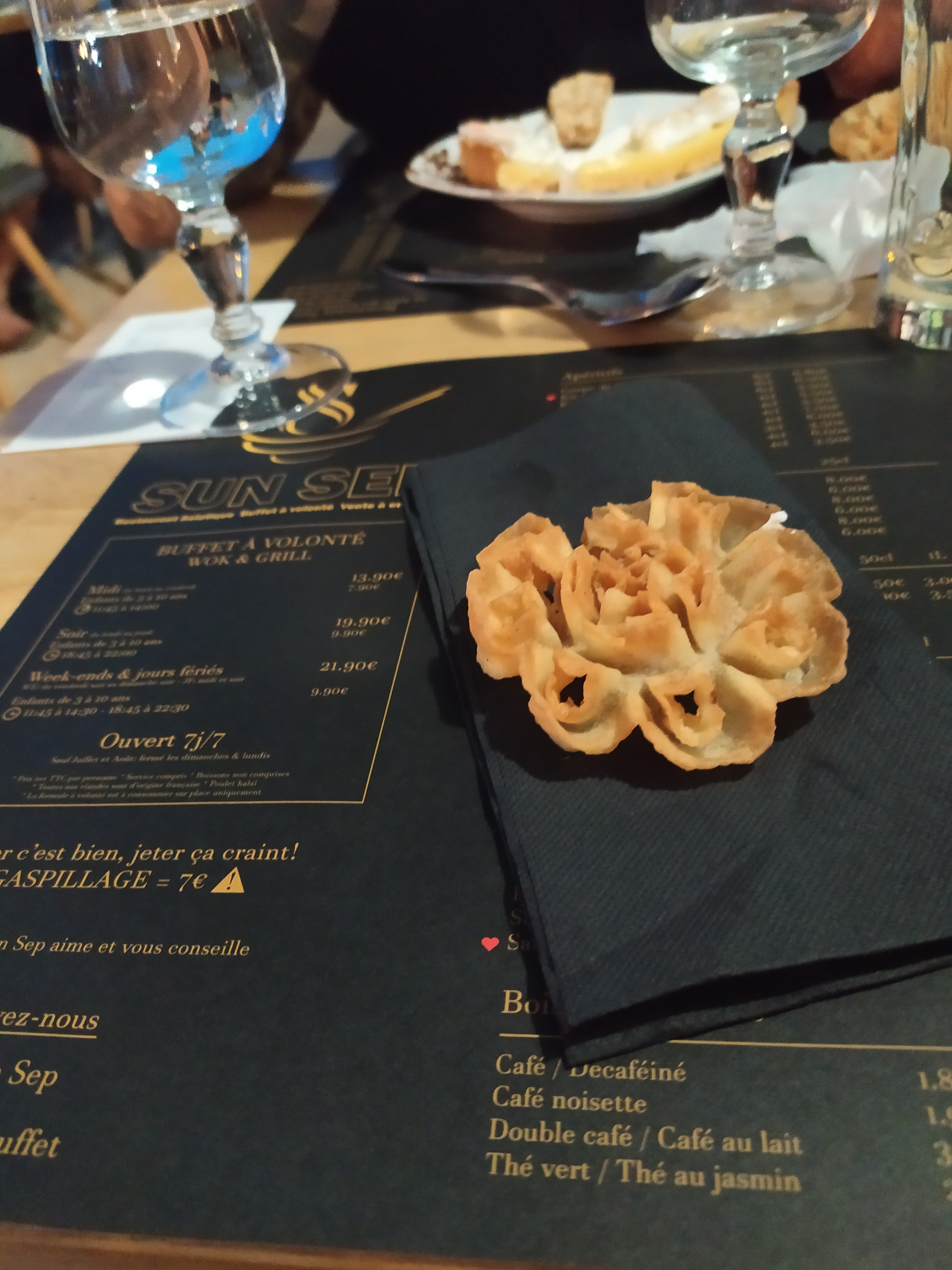Bonjour, Merci pour toutes ces étoiles et ce commentaire. En effet notre buffet est un peu moins fourni que d’autres mais comme vous le dites, nous privilégions la qualité à la quantité. Nos plats sont 100% asiatiques 100% authentiques 100% faits maison. Nos desserts ne le sont pas tous certes (faute de pâtissier…), mais nous prenons soin sélectionner des douceurs de qualité et pouvons vous assurer que nos desserts “spécialités sun sep” le sont ;) Au plaisir de vous revoir très bientôt! La team Sun Sep