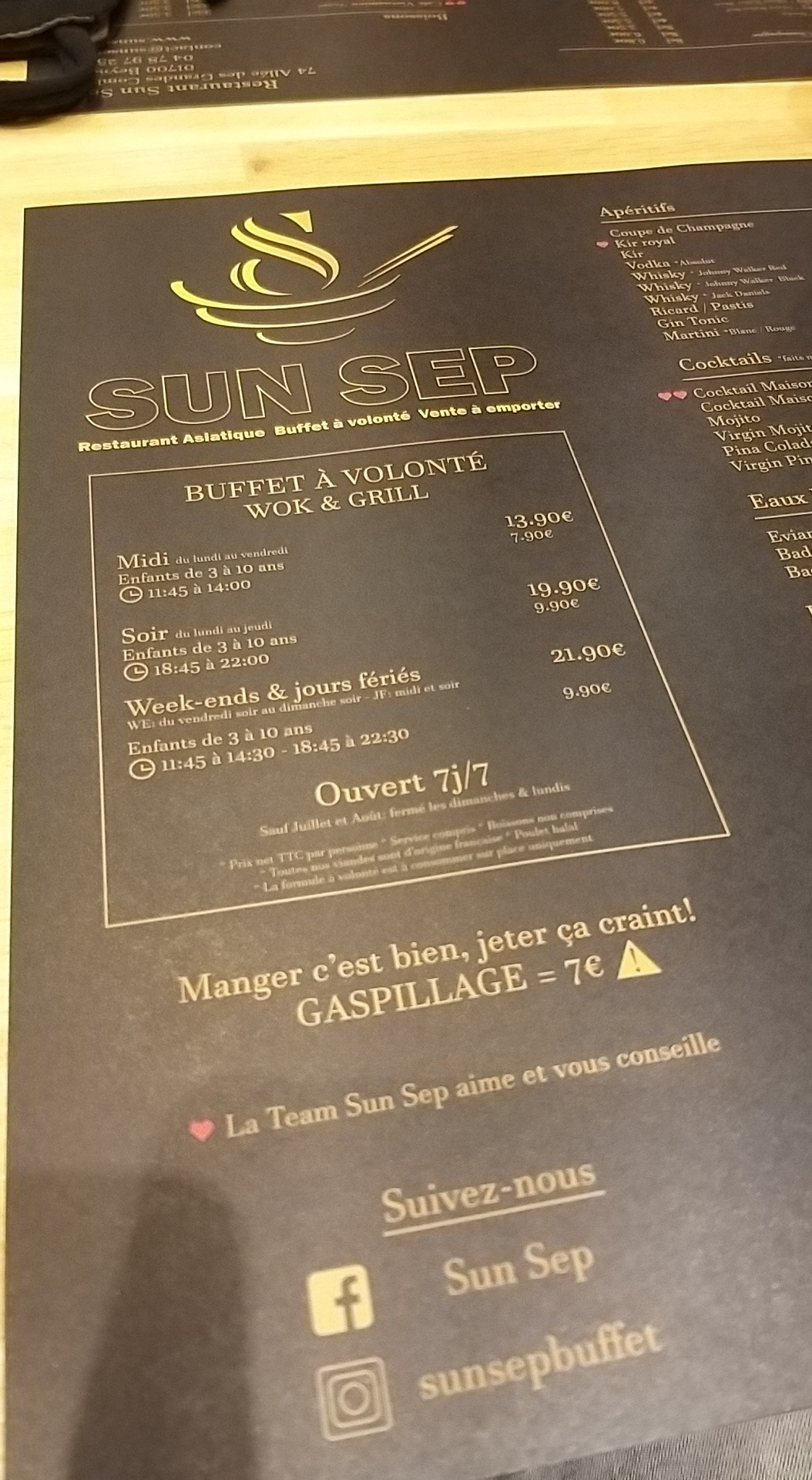 Nous vous remercions de votre visite et sommes heureux que vous ayez apprécié notre buffet, nous le préparons toujours avec des produits frais et de qualités. A très bientôt nous l’espérons. La team Sun Sep.