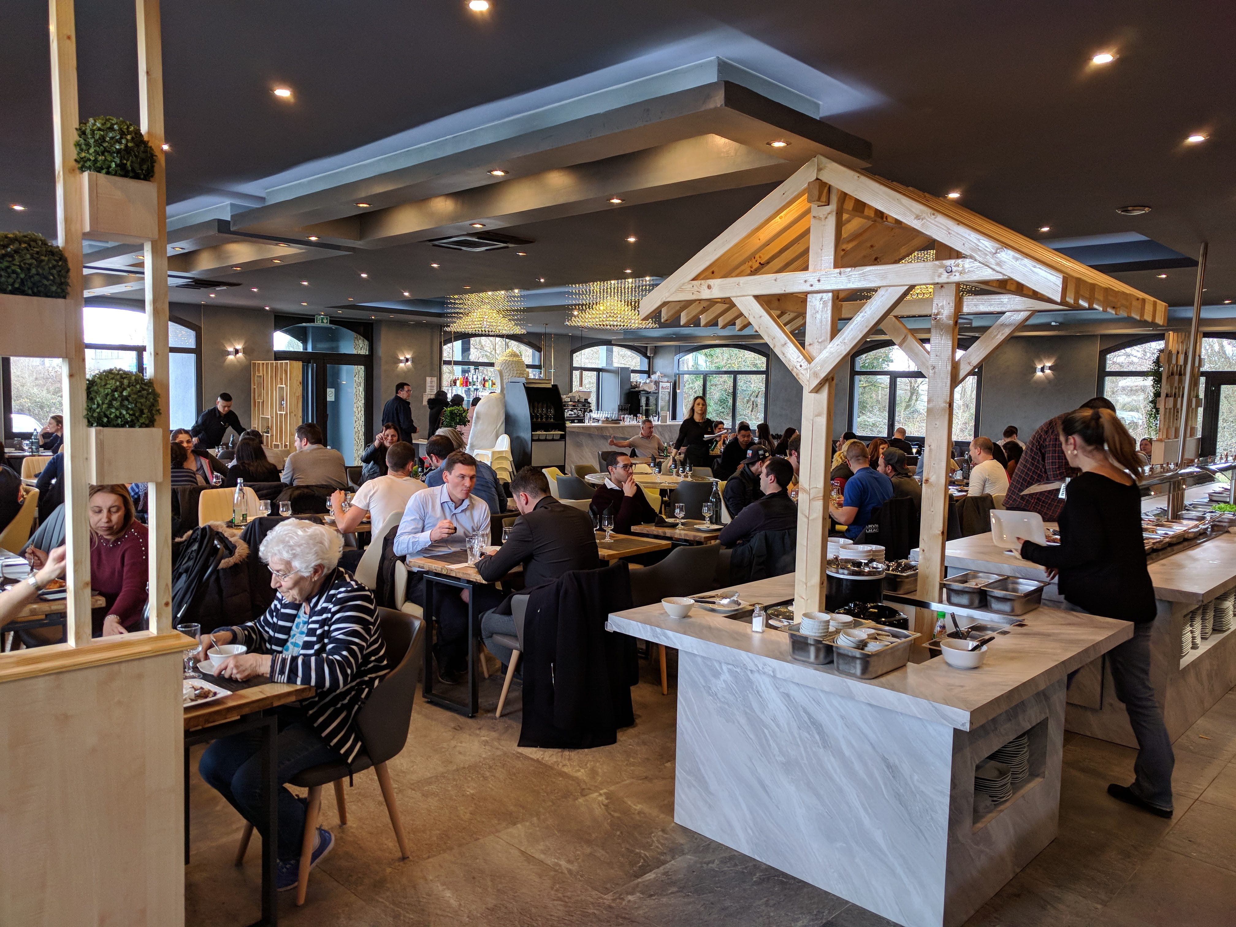 Restaurant avec un buffet garni , une salle de restaurant avec une capacité d'environ 130/150 personnes, le service ou le débarrasse de table , est rapide et correct et surtout avec la bonne humeur... Les plats sont goûteux et même les desserts à la différence de certains autres restaurants du même style. Le seul bémol c'est le bruit environnemental... Sinon nous avons très bien mangé, et nous reviendrons sans aucun doute .... merci