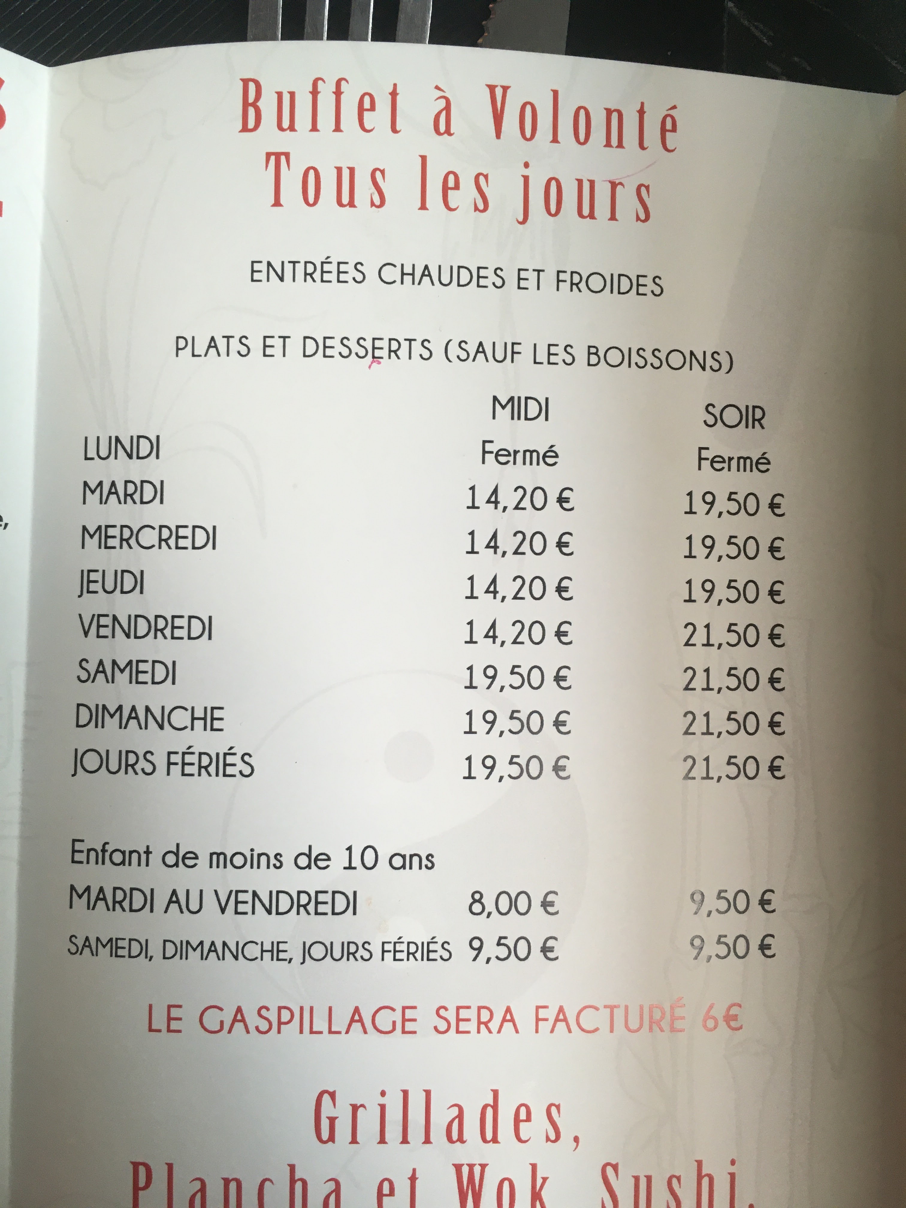 Chére pour se que cest un gamin de 2 ans paie aussi chère qu'un enfant de 9 ans. En plus fou pas top sur le buffet, wasabi terne... etc Je ne recommande vraiment pas ce restaurant il y a beaucoup mieux ailleurs! !!
