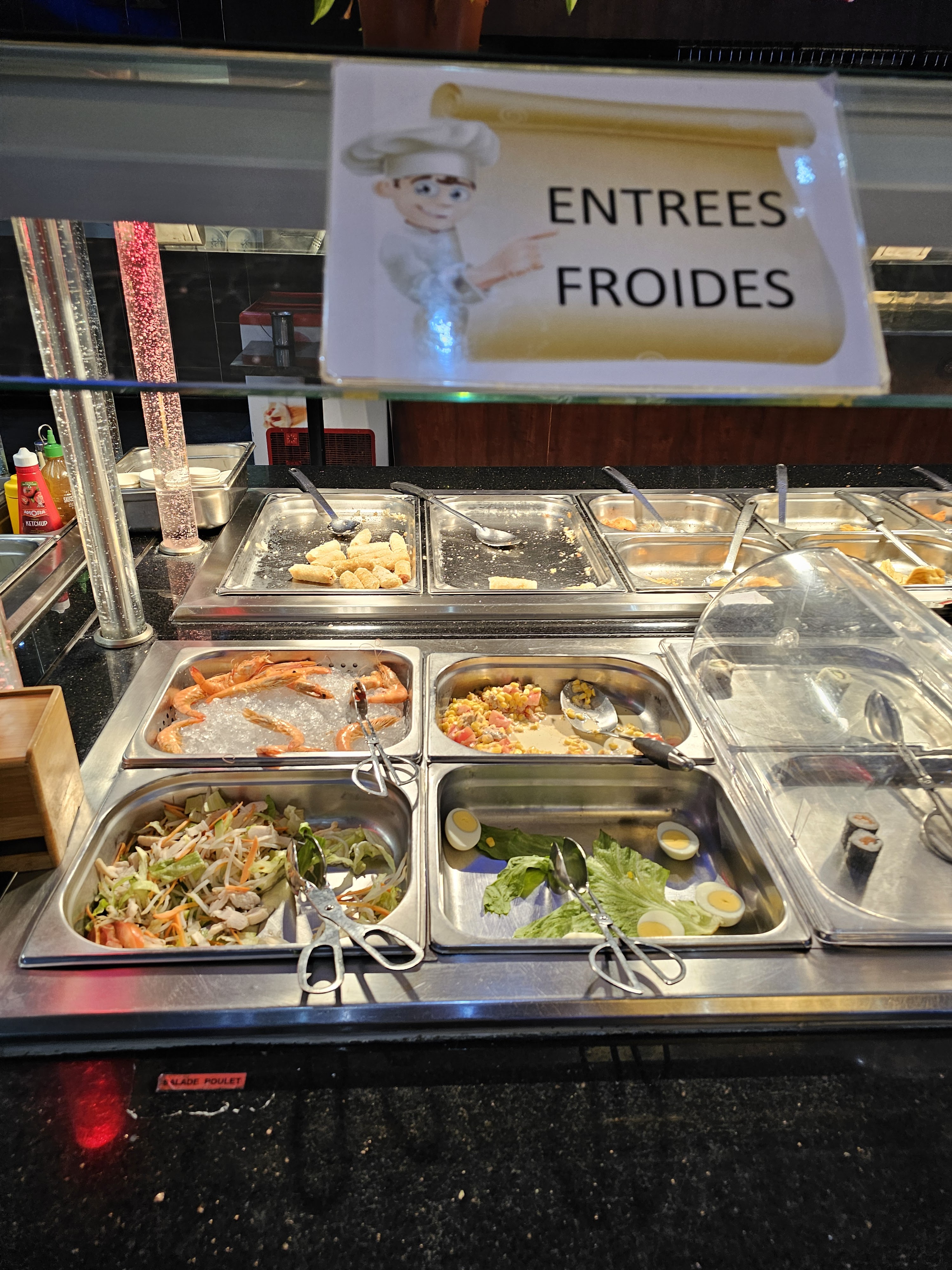 Accueil sympathique, le problème est que nous sommes arrivés à 20h45 et il n’y a avait déjà plus rien. On demande alors si ça sera achalandé et à cela on nous réponds « oui oui ». Finalité je me suis nourrie seulement de nems et de riz cantonais à un buffet à volonté ! Gros problème d’achalandage déjà qu’il n’y a pas grands choix.. vraiment dommage.