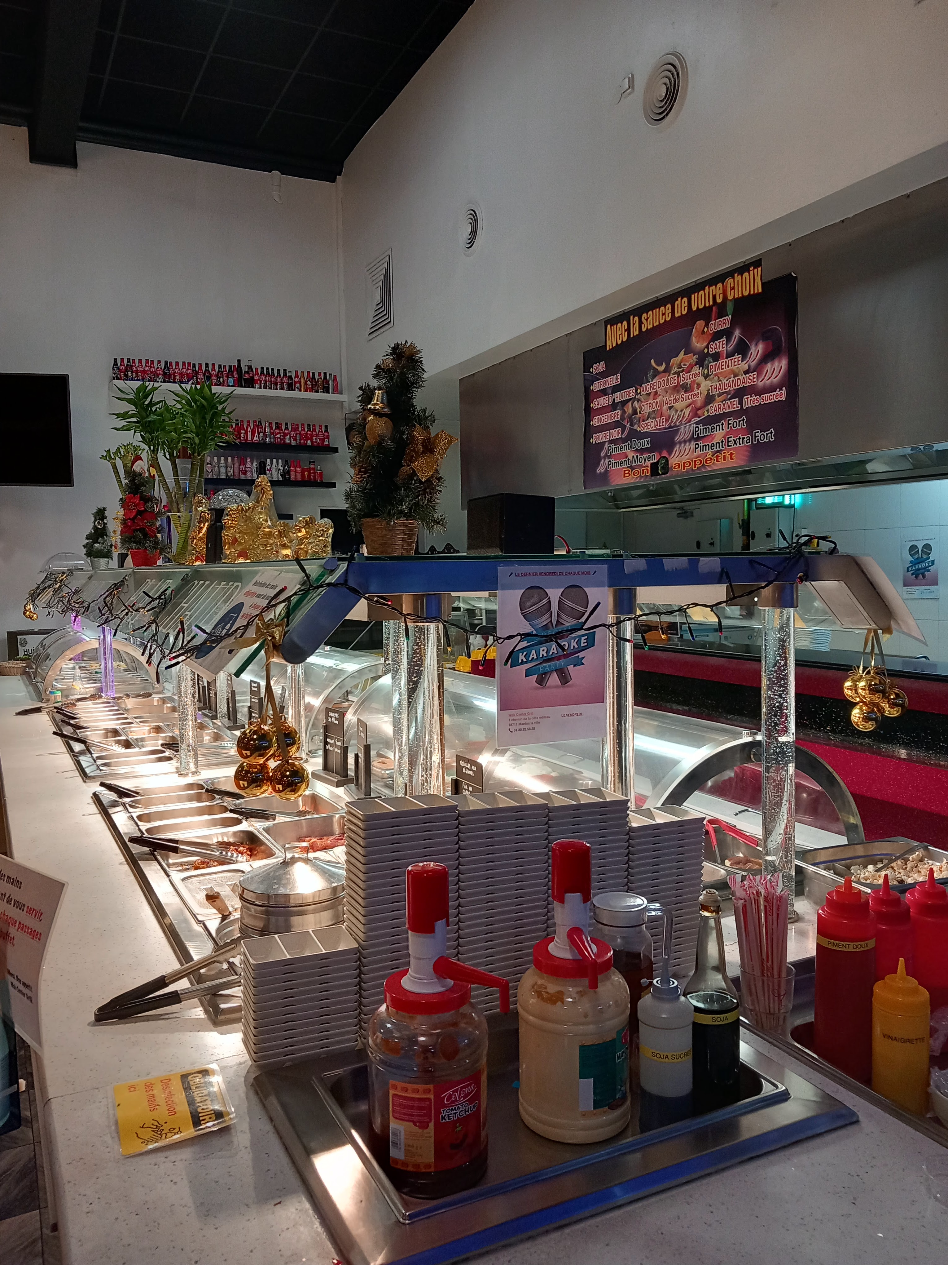 je suis partagé il y a une bonne qualité pour la nourriture mais un manque de diversité dans le buffet à volonté je n'ai trouvé aucun poulet caramélisé ou canard laqué pourtant un grand classique un poulet caraméliser en sauce va bien avec du riz ou autre chose ce qui est dommage vu qu'on doit manger son riz sec ou avec une sauce froide ou en bouteille (pas cool) dans le restaurant chinois le wok était super mais le manque d’ingrédient le rend moins bon ce qui est dommage à la Vue de la qualité des préparations de plus les nouille est faites avec des spaghettis ( super dommage ) est le manque de travaux et vraiment inadmissible je vais aux wcs côté mec lunette des wcs cassés donc pas cools donc pour résumé il faut faire des réparations peinture et entretien un meilleur aménagement de votre buffet à volonté revoir une décoration plus soft du restaurant avec plus de personnalités et surtout des pancartes de pub qui indique ou se trouve votre restaure pas simple de venir
