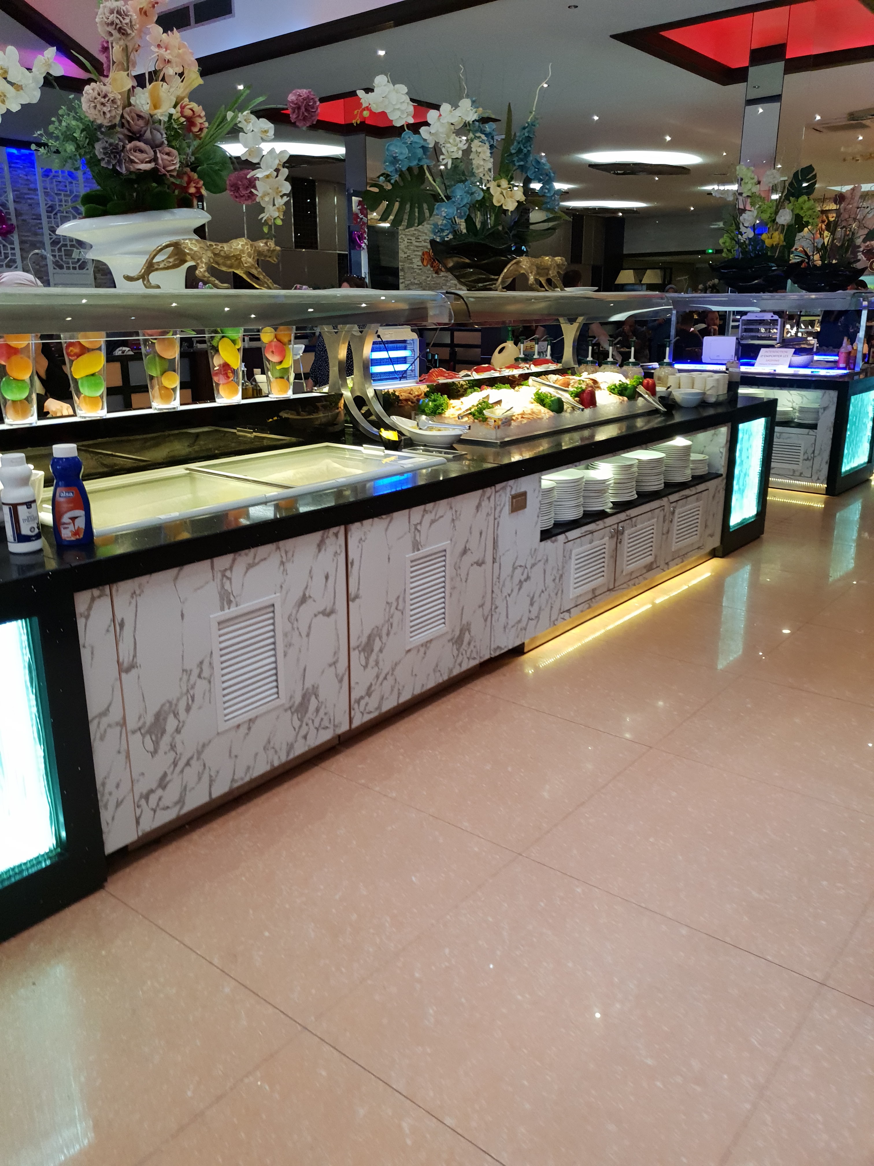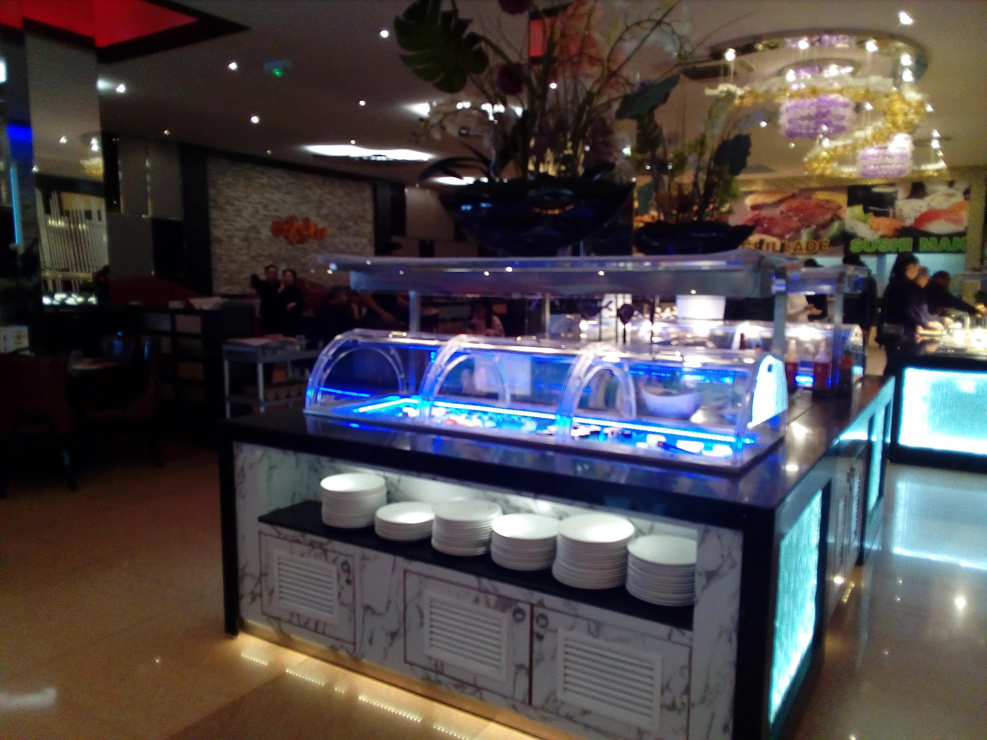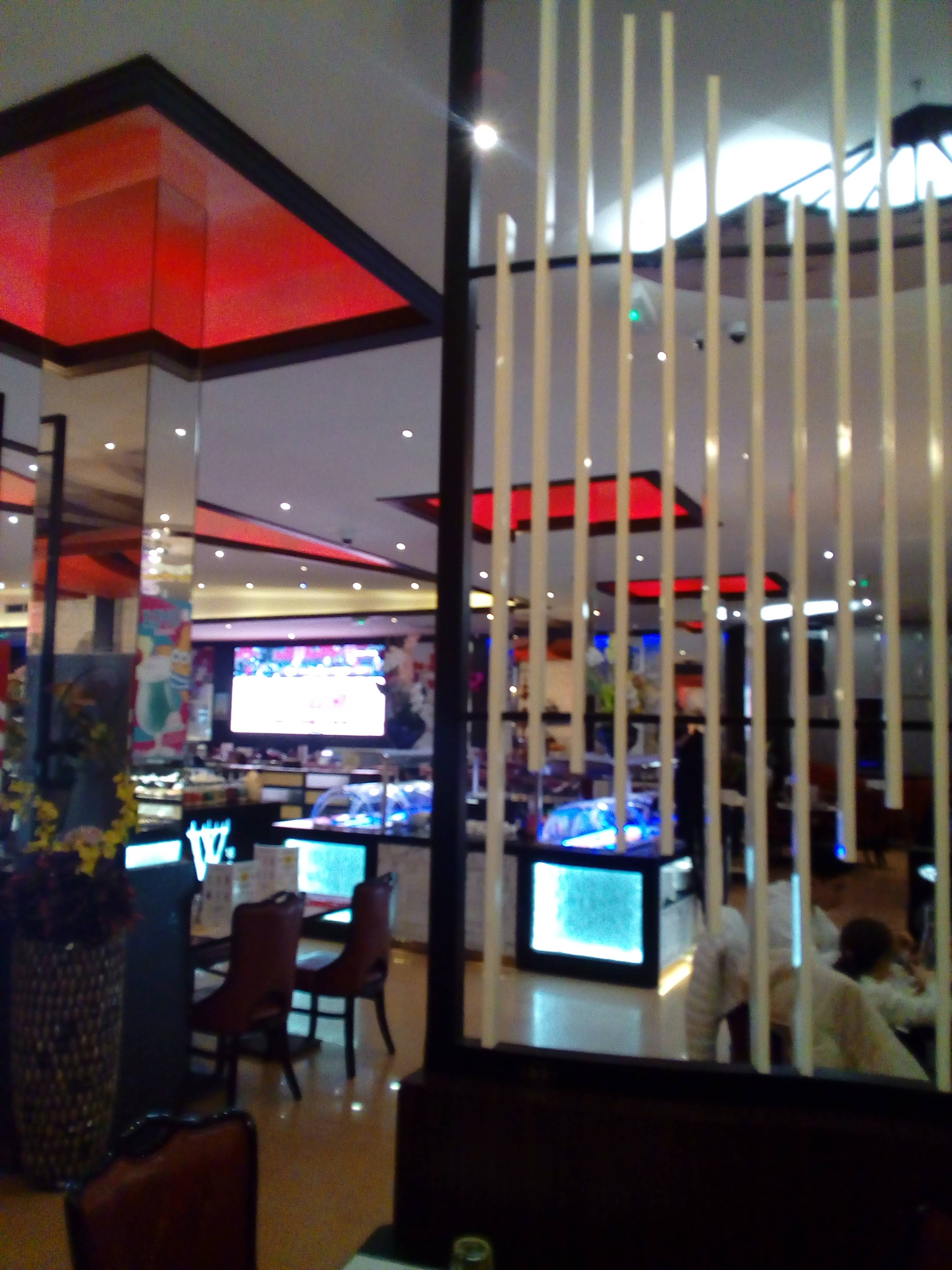 L’ambiance est très bruyante, heureusement il n’y a pas de musique. Les plats ne sont pas super chaud, les sushis-makis etc sont fait au fil de l’eau donc peu de choix a l’heure de pointe. Pas le meilleur buffet…