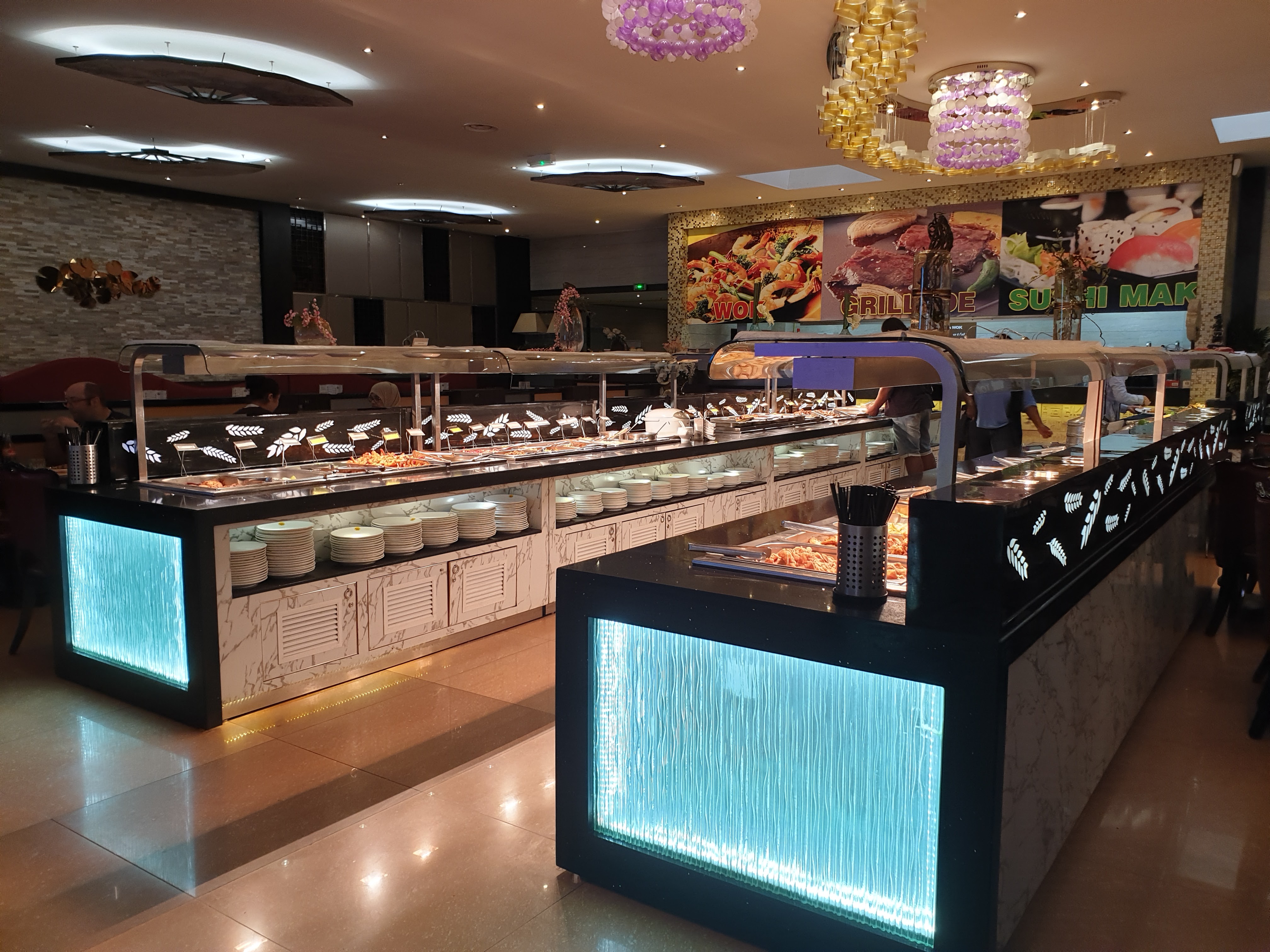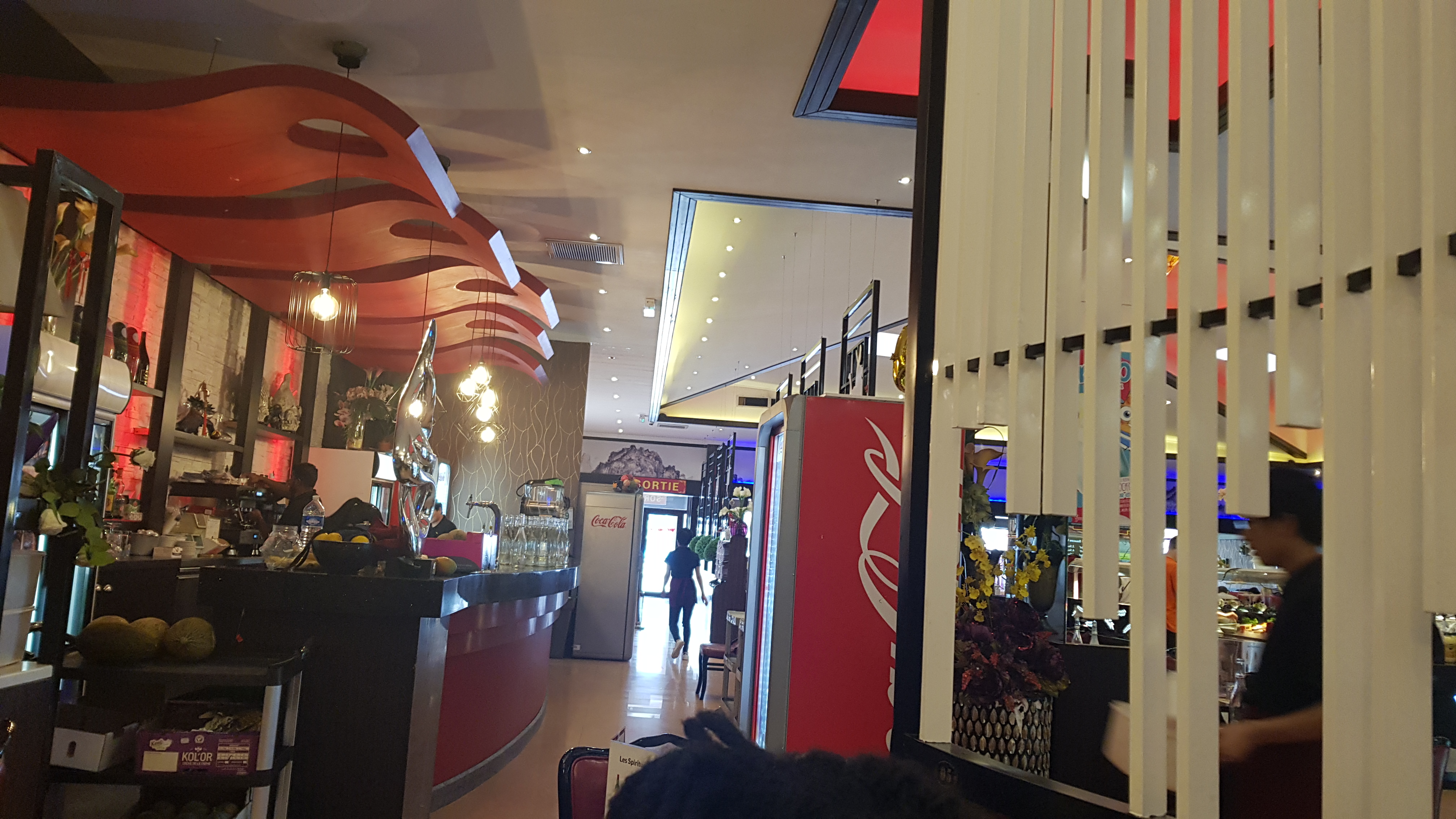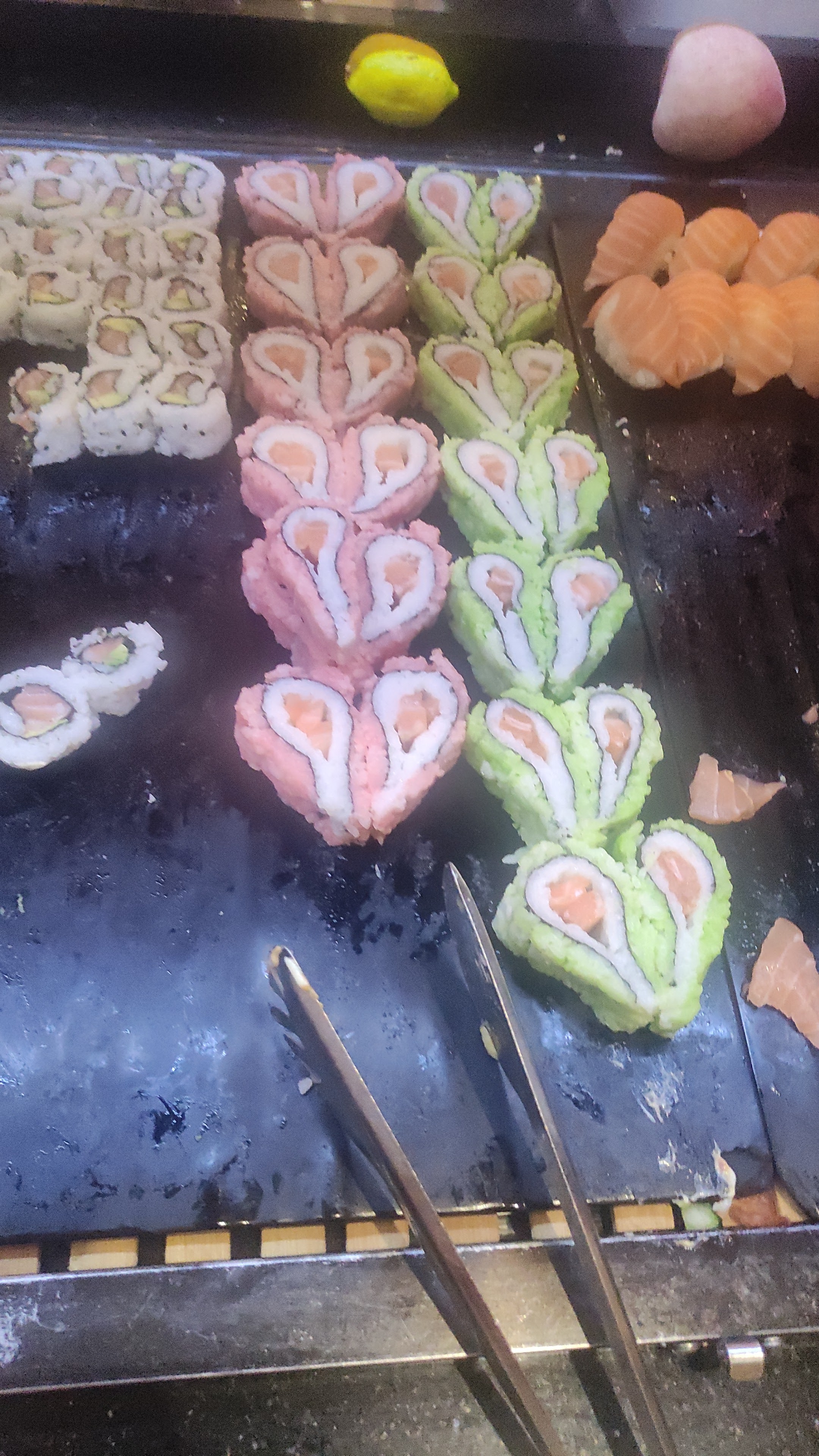 L’ambiance est très bruyante, heureusement il n’y a pas de musique. Les plats ne sont pas super chaud, les sushis-makis etc sont fait au fil de l’eau donc peu de choix a l’heure de pointe. Pas le meilleur buffet…