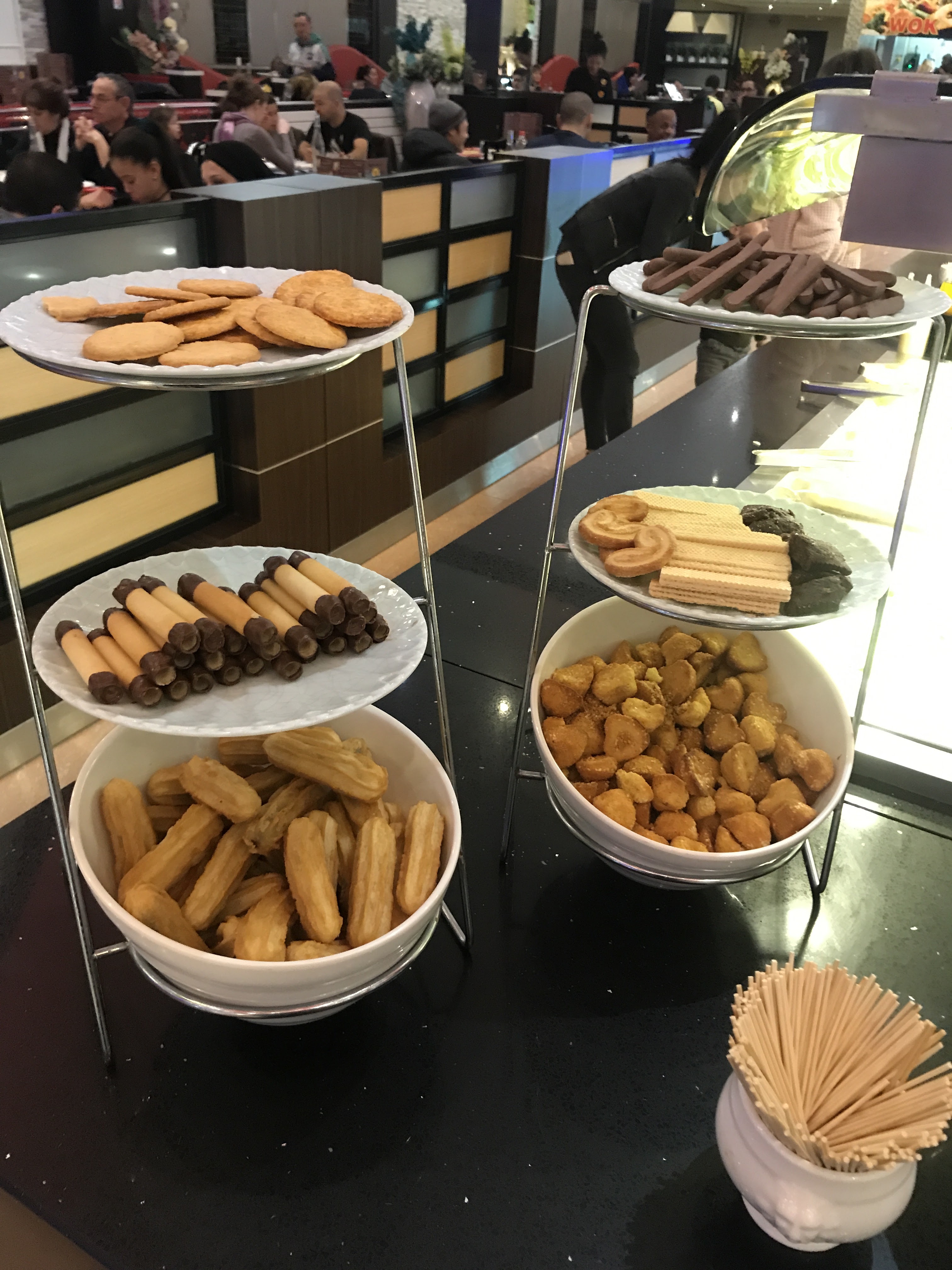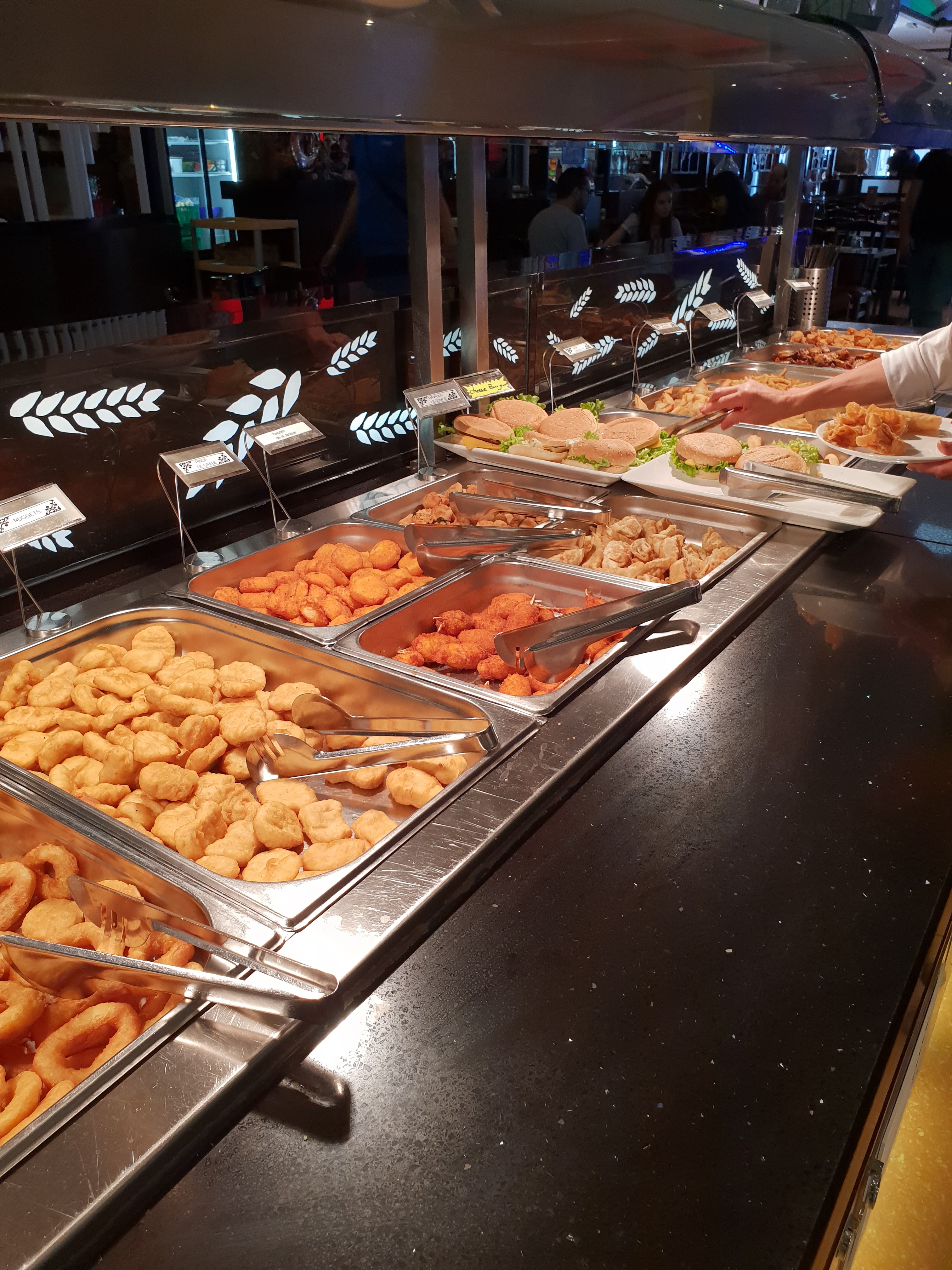 Les plats sont très diversifiés (fruits, légumes, pâtes, viande, riz, wok, desserts glacé, gâteaux, frites, etc.). Les serveurs sont très chaleureux et à l'écoute. Un bar est à disposition pour les personnes voulant une boisson alcoolisée. Et pour finir, l'espace est gigantesque et très bien aménagé permettant de ne jamais être au complet tout en ne se bousculant pas.