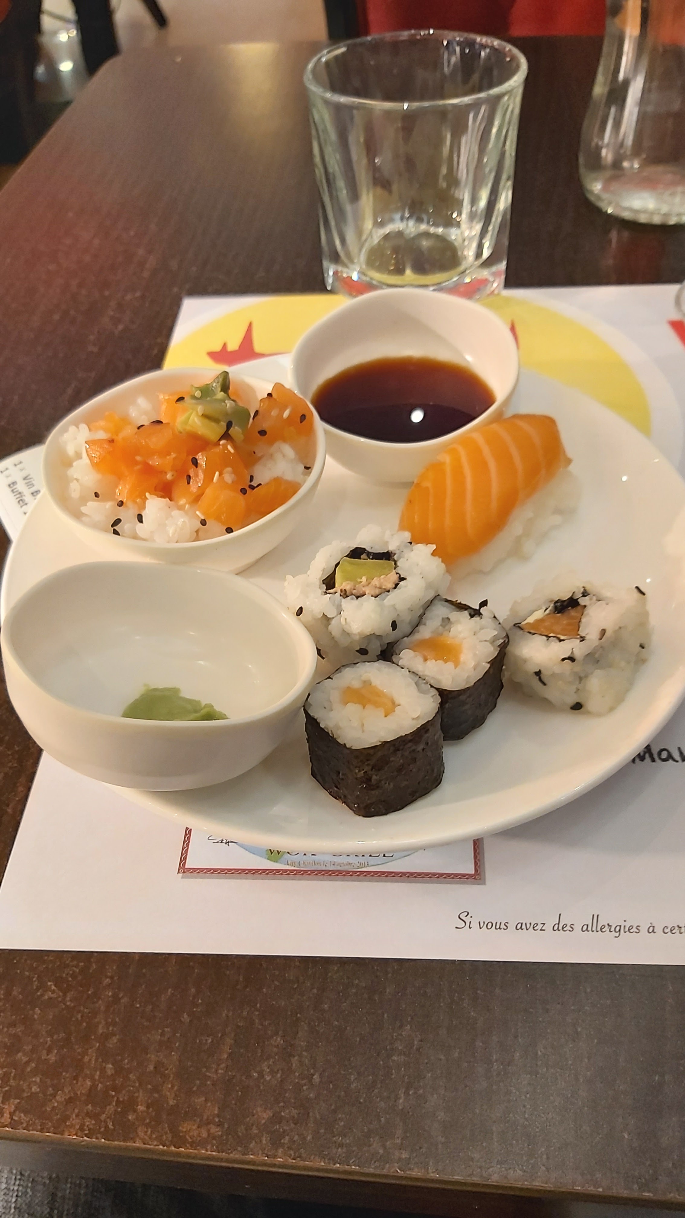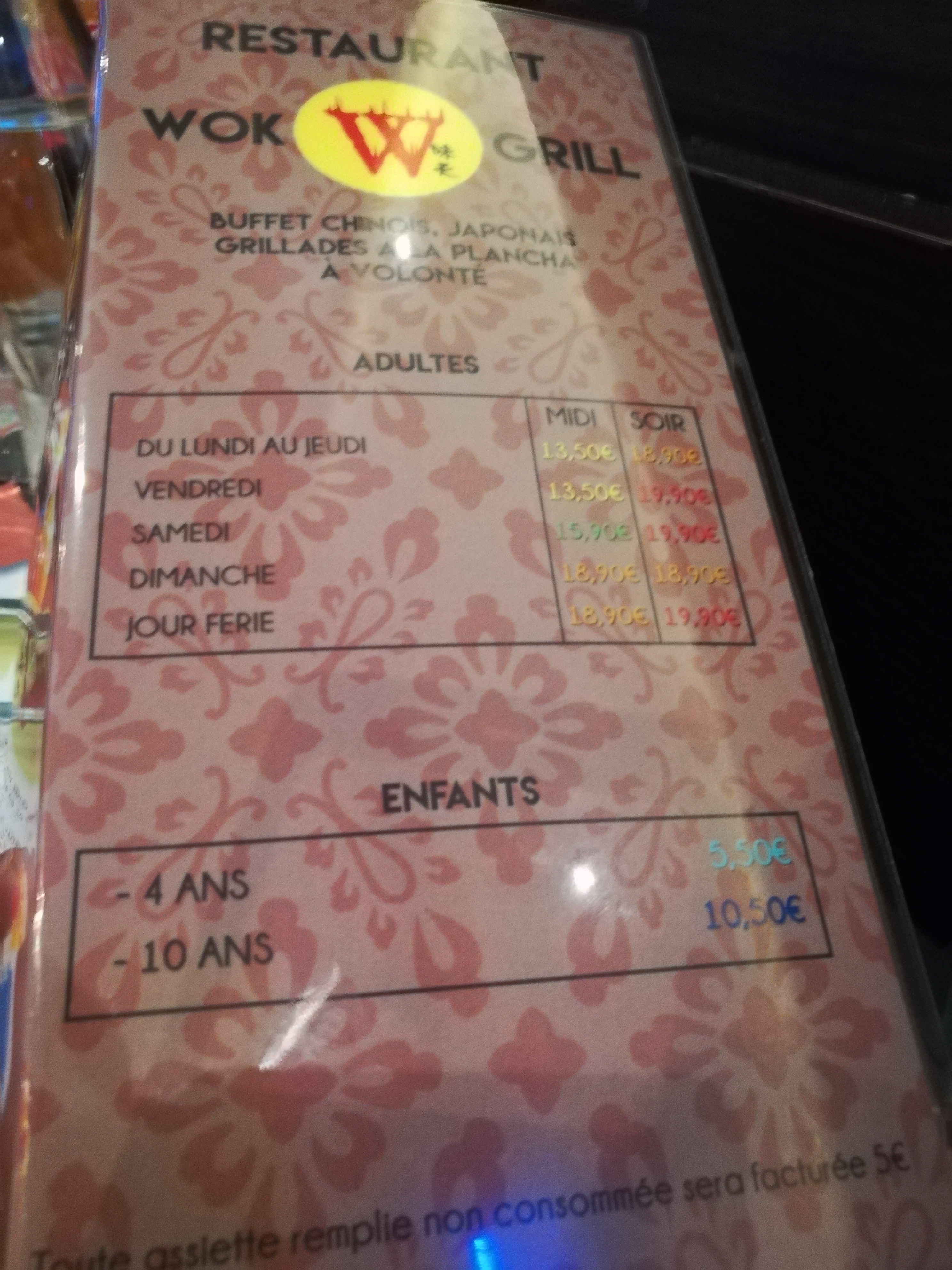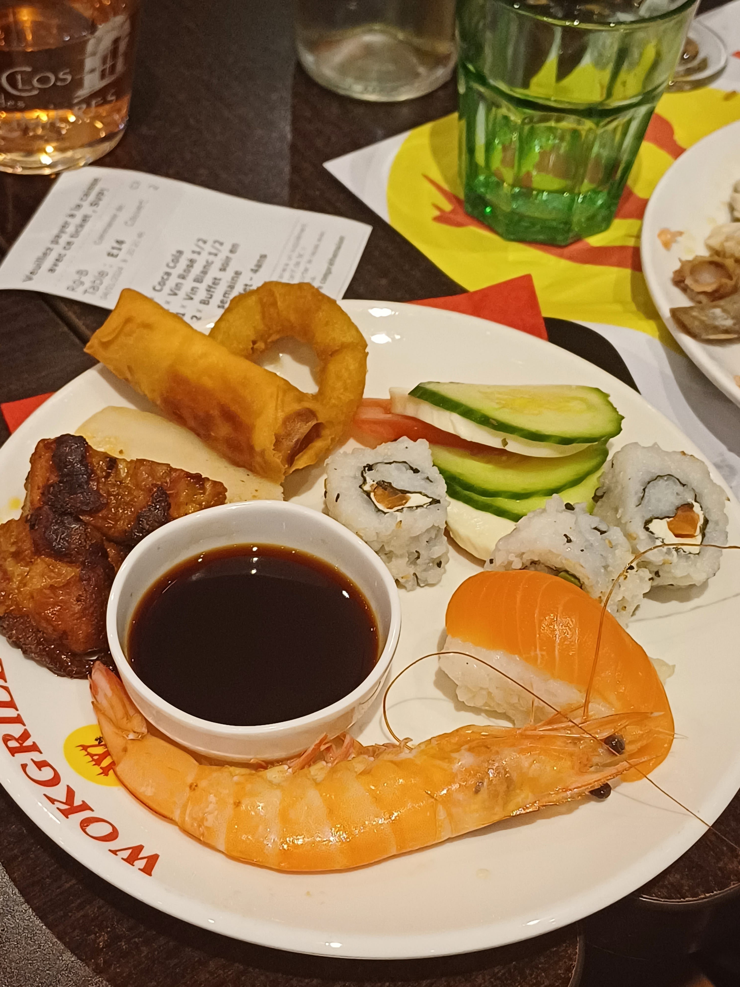 Large choix du buffet à volonté. Il y en a pour tous les goûts! Spécialités chinoises, japonaises en passant par des viandes et du poisson grillés devant vous ainsi que beaucoup de variétés de salades. La salle est très grande et le cadre intérieur est très joli! Niveau dessert vous serez ravis! Du frais au chaud, du light au plus gourmand.... Nous avons mangé en famille pour midi, avec plusieurs enfants et tous ont été satisfait! LES PRIX: 12,99€/personne LE MIDI et 10,50€ pour les -10ans. Le soir il me semble que c est 19€/personne. Je retire une étoile pour le simple fait que les california maki n'ont pas été remis malgré une remarque faite à une employé.