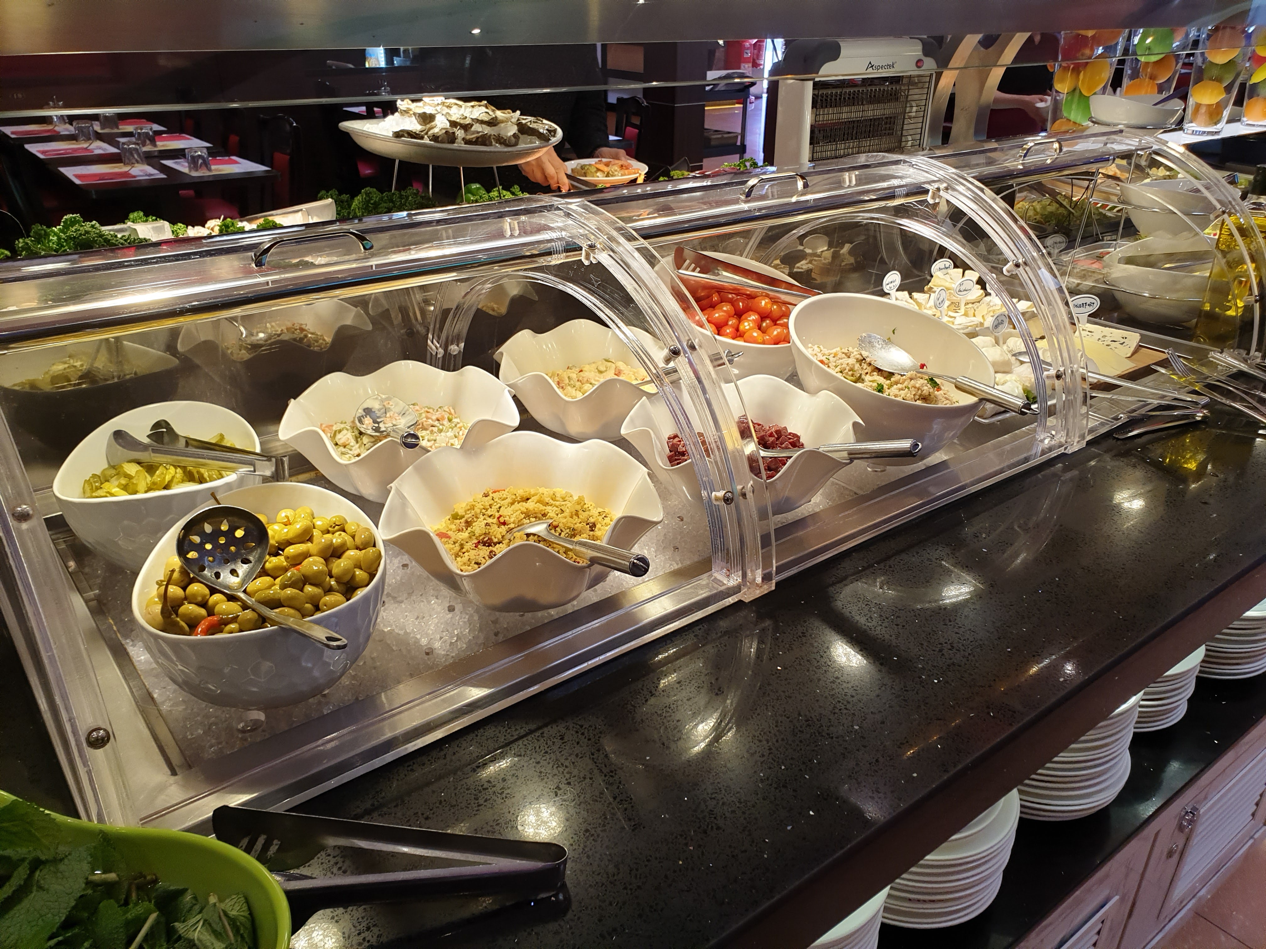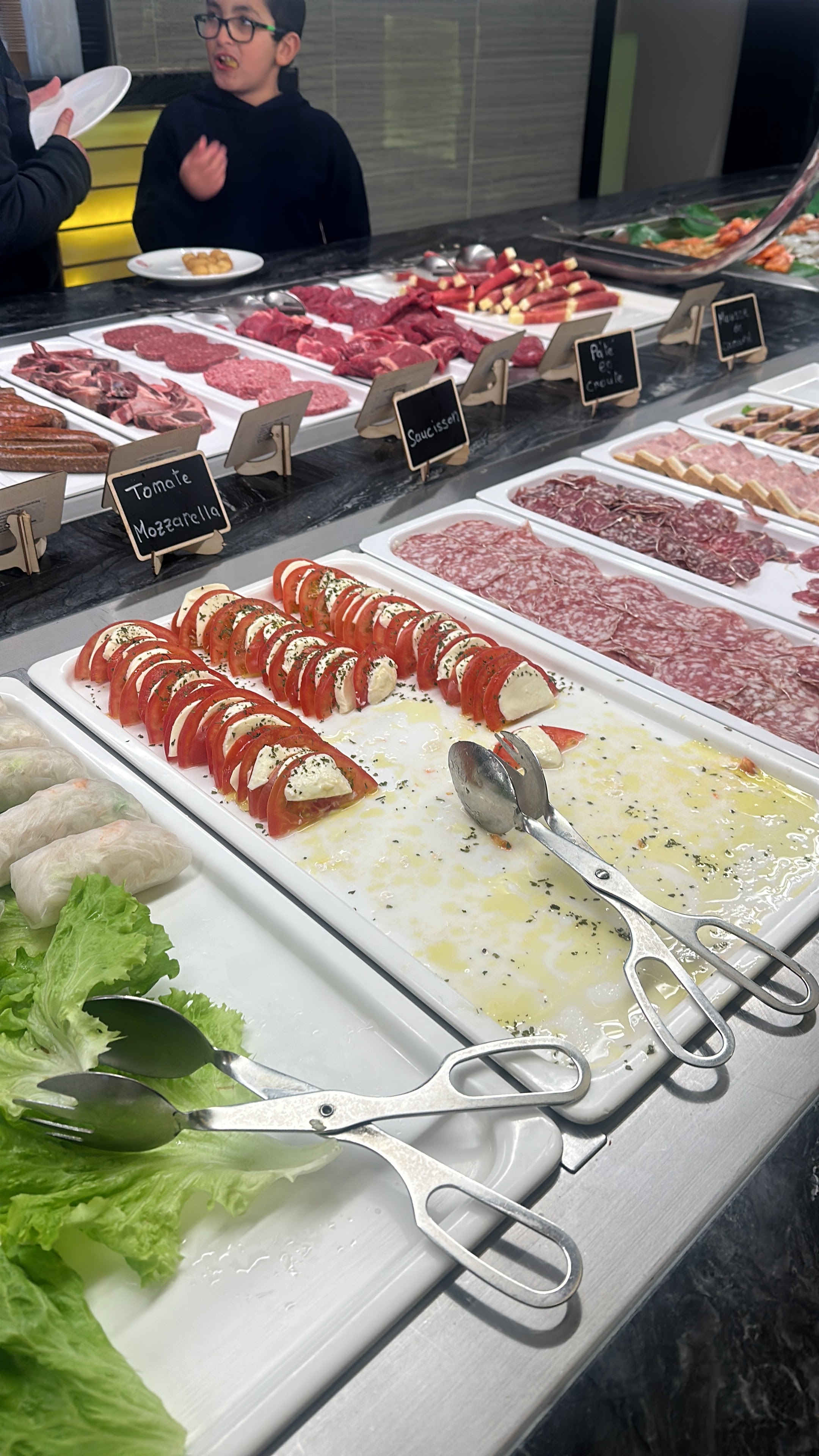 Bon mais mal organisé il y a des nems au porc qui ne sont pas à côté des autres nems.les feuilles de salades sont à un autre endroit à côté du fromage alors que ça n'a rien à voir.pas assez de sushi plats presque vide ; et il faut déjà chercher où ils sont mis.dommage.une réorganisation est à prévoir au niveau présentation des plats.
