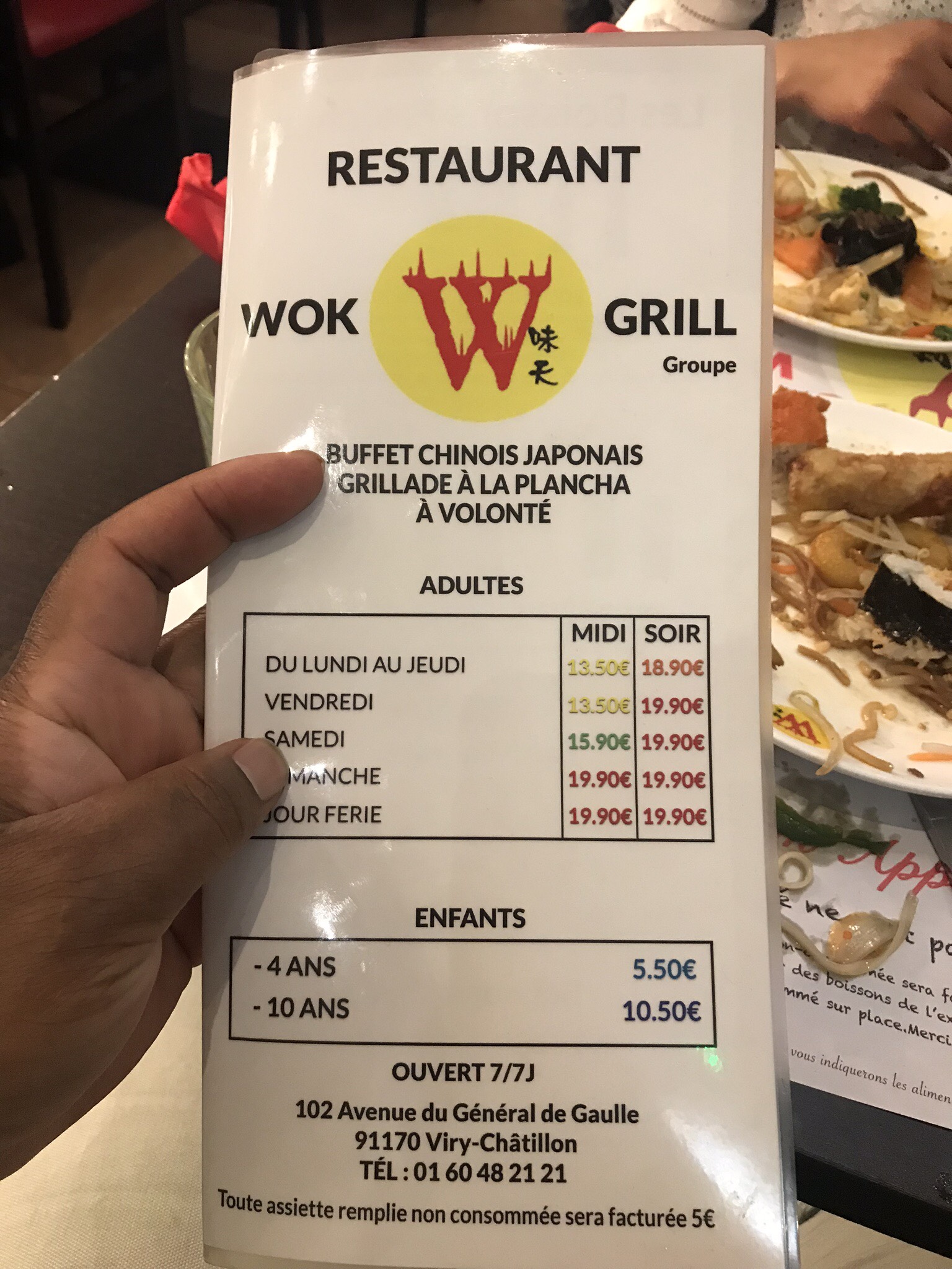 Celui-ci parmi les meilleurs restaurants buffet à volonté de la région de Parus. J'ai mangé au wok grill Viry Châtillon et aussi à Vitry sur Seine. Mais je préfère le Wok grill Viry Châtillon pour la raison qu'ils maintiennent un environnement super propre et que la nourriture est vraiment très bien faite. En plus de tous les aliments frits et sushis asiatiques, ils ont vraiment les choses suivantes qui sont tout simplement exceptionnelles 1. Cuisine indienne authentique - avec des naans et de nombreuses options de curry qui ont un goût délicieux. Je suis indien et j'ai été surpris par la qualité du pain indien et du biryani que j'ai trouvé dans le wok grill 2. Vous pouvez emporter chez vous une boîte en plastique de nourriture (ce n'est pas une très grande boîte mais elle contiendra certainement le déjeuner pour deux personnes)